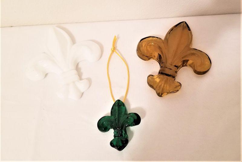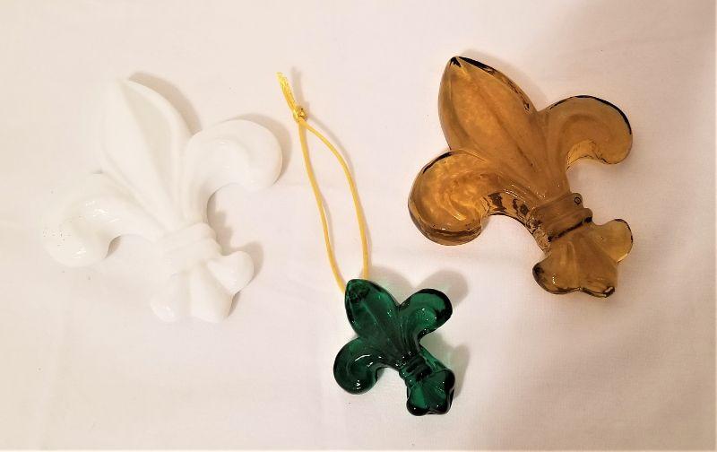 Three studio glass Fleur di Lis ornaments from noted glass artist Mitchell Gaudet and Studio Inferno. The two large ones are 6" tall, the smaller is 2.5" tall.