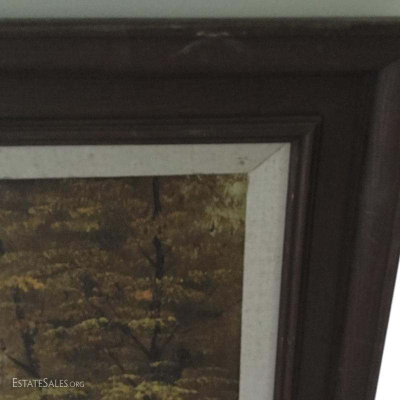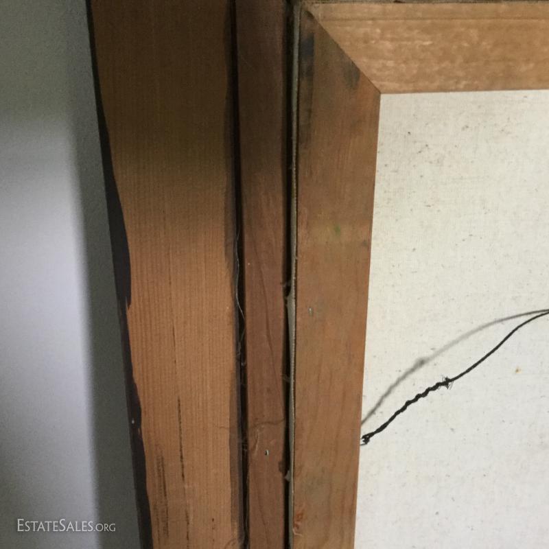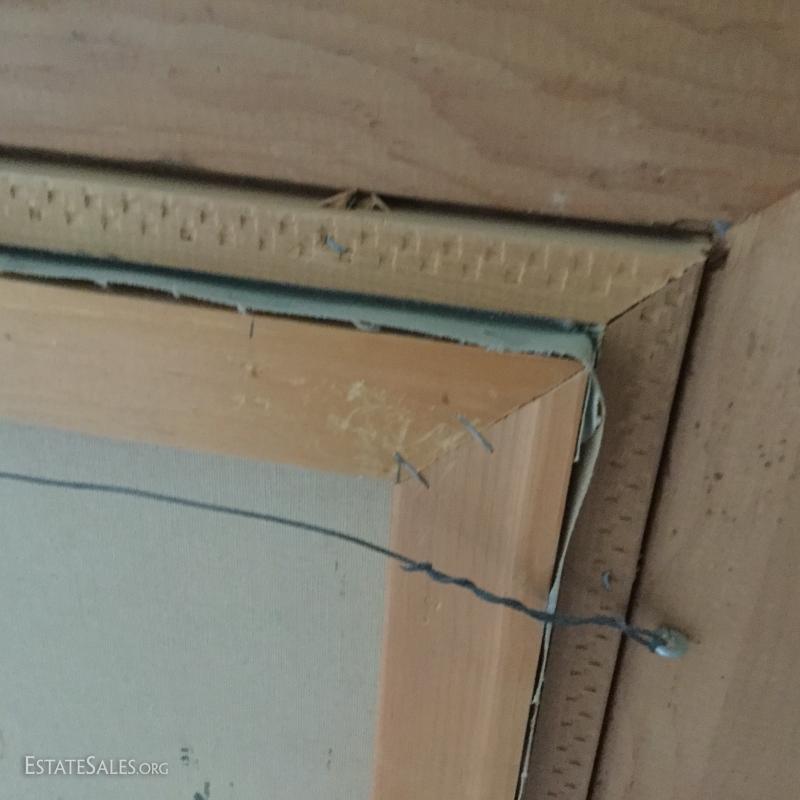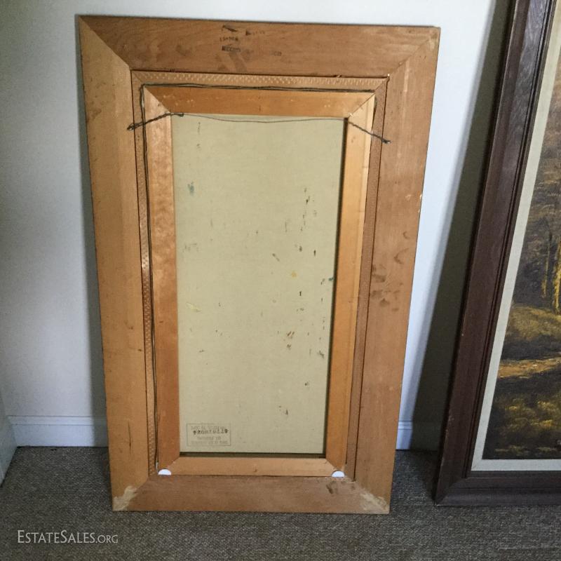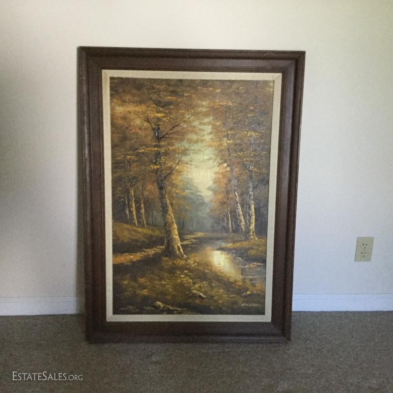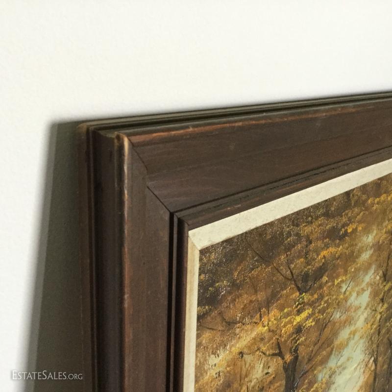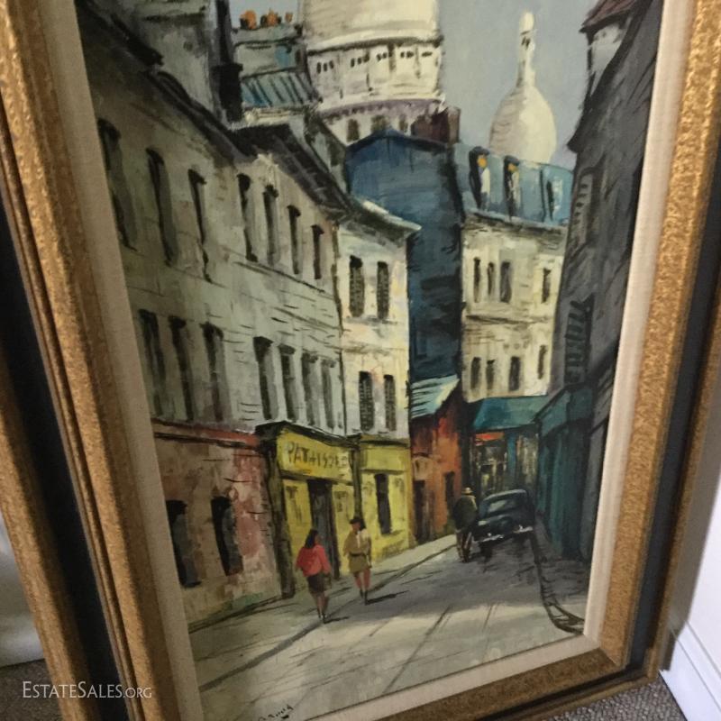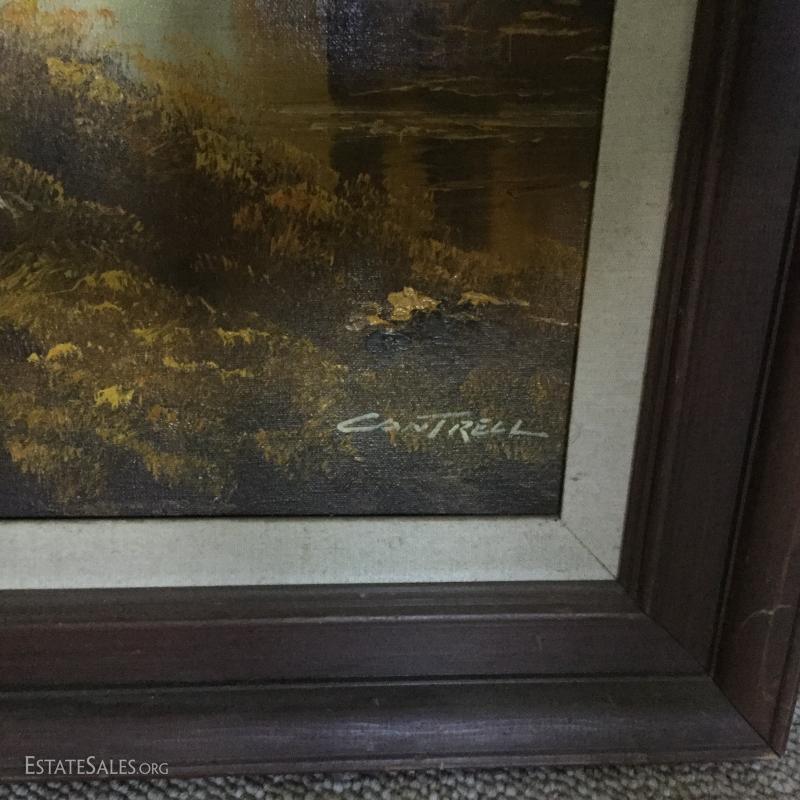 Two large framed paintings. See photos for signatures and details. River painting by Cantrell is 43.5"l x 31"w. Street scene is 38"l x 23"w.