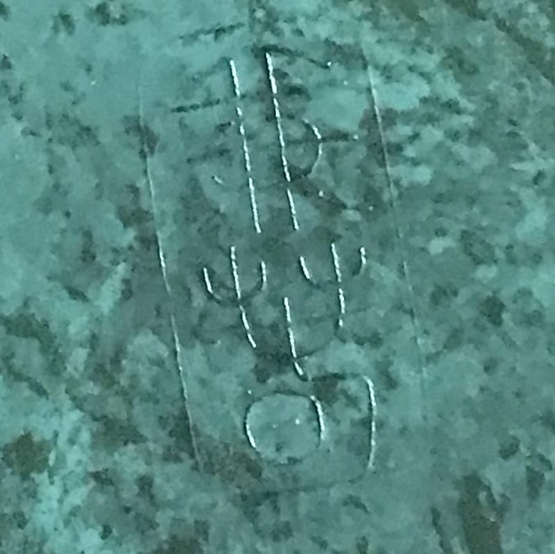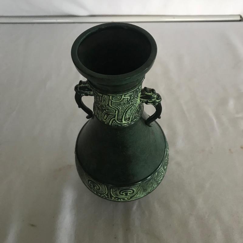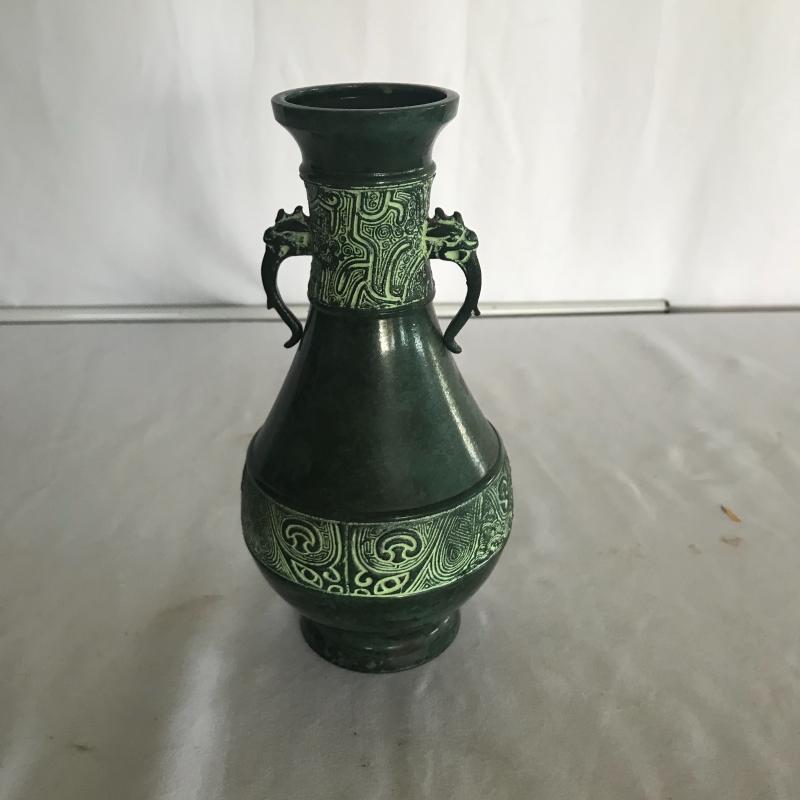 Vase appears to be metal with carvings, and green coloring. Marking on bottom. Piece stands 9” tall. Shipping available.