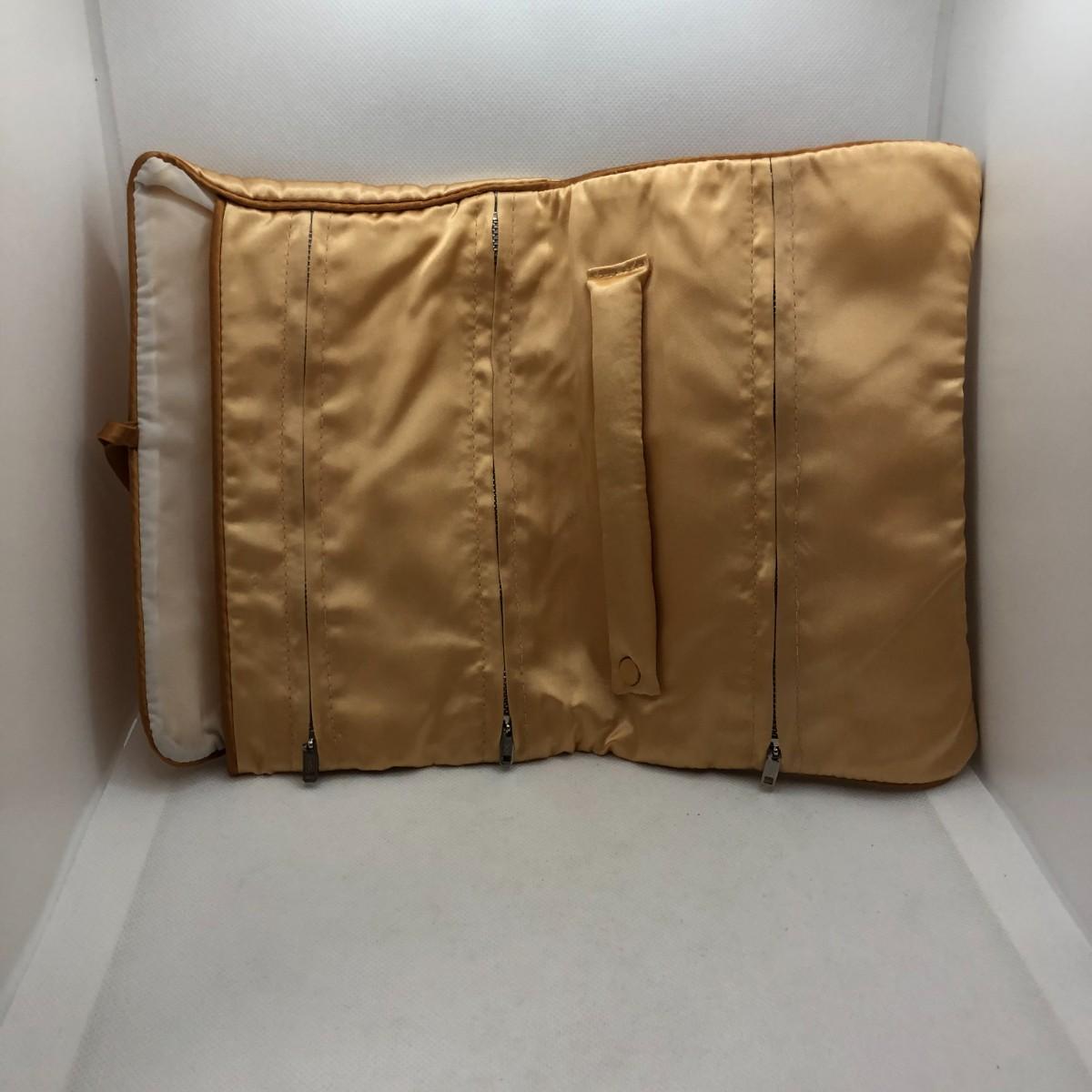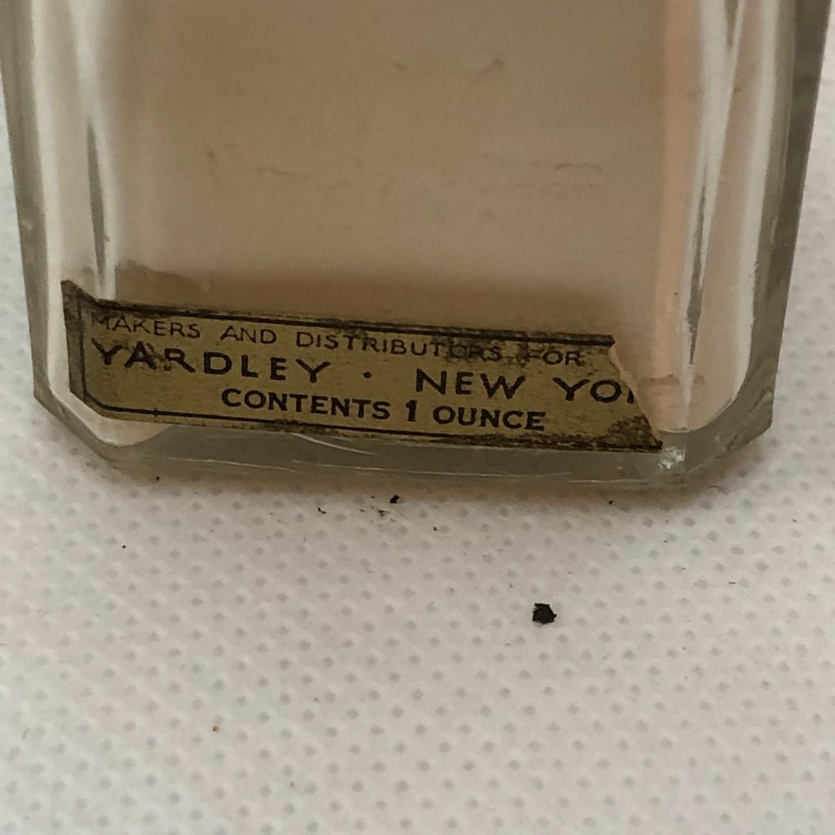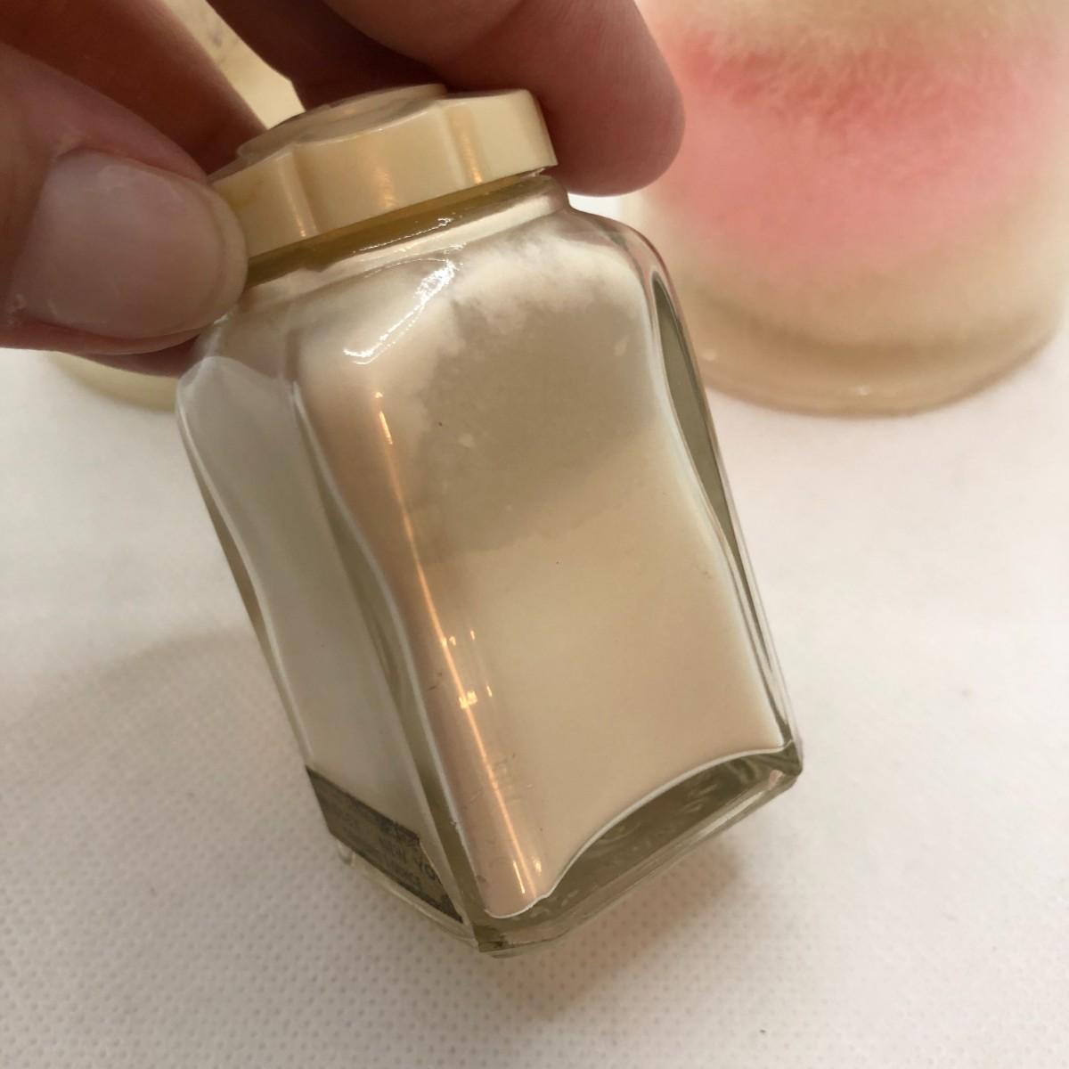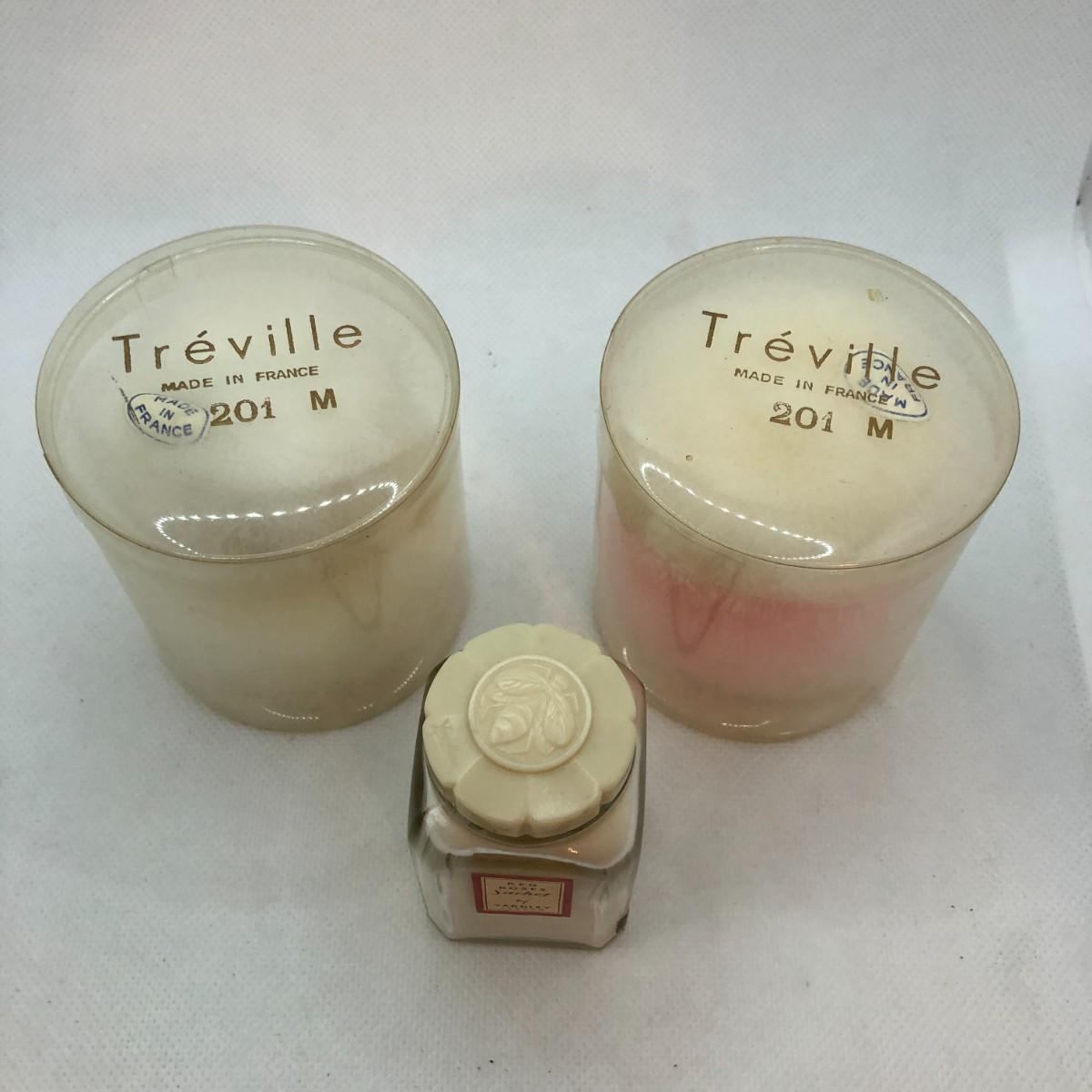 There is a partially full glass bottle of Yardley London Red Roses Sachet powder, two containers of Treville France powder puffs, and a satin travel case for jewelry.