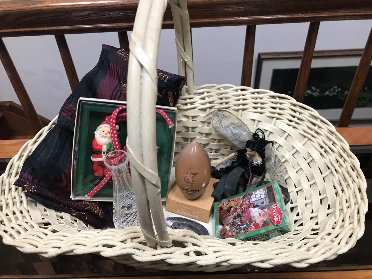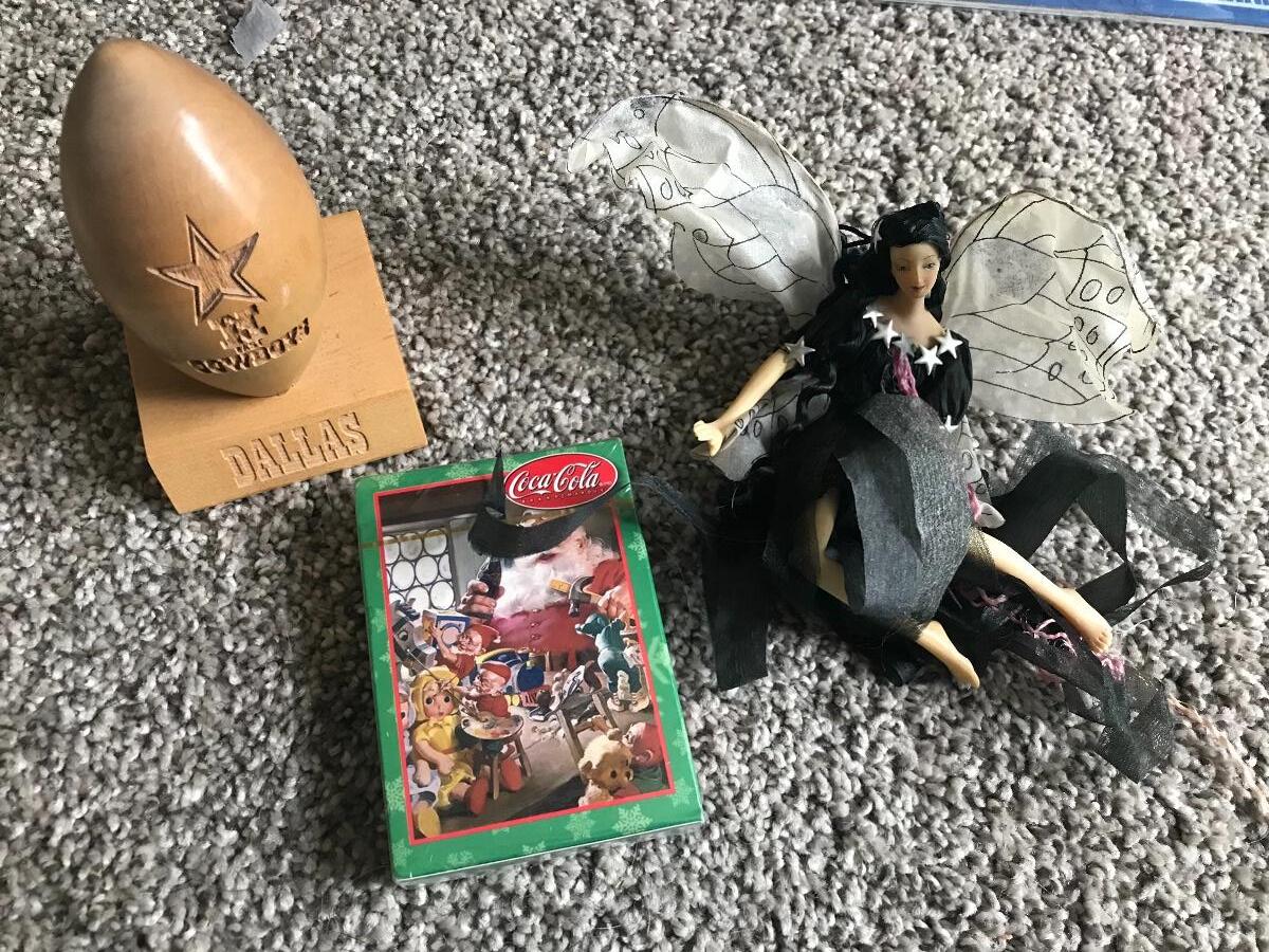 Ralph Lauren silk scarf, 33x34, porcelain fairy, Dallas Cowboys wooden football, vintage, Hallmark, Mr. and Mrs. Claus, Coke cards, a crystal bud vase, and antique, sterling silver "playing spoons". Please see all pictures for content of the lot, condition of the lot, and measurements if taken. Pictures are the best representation of the items listed and items are untested unless indicated in description. Thank you for looking and have fun bidding!