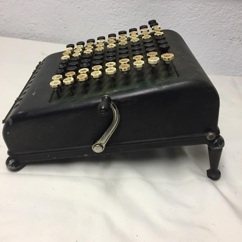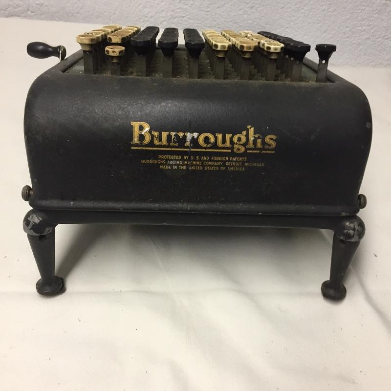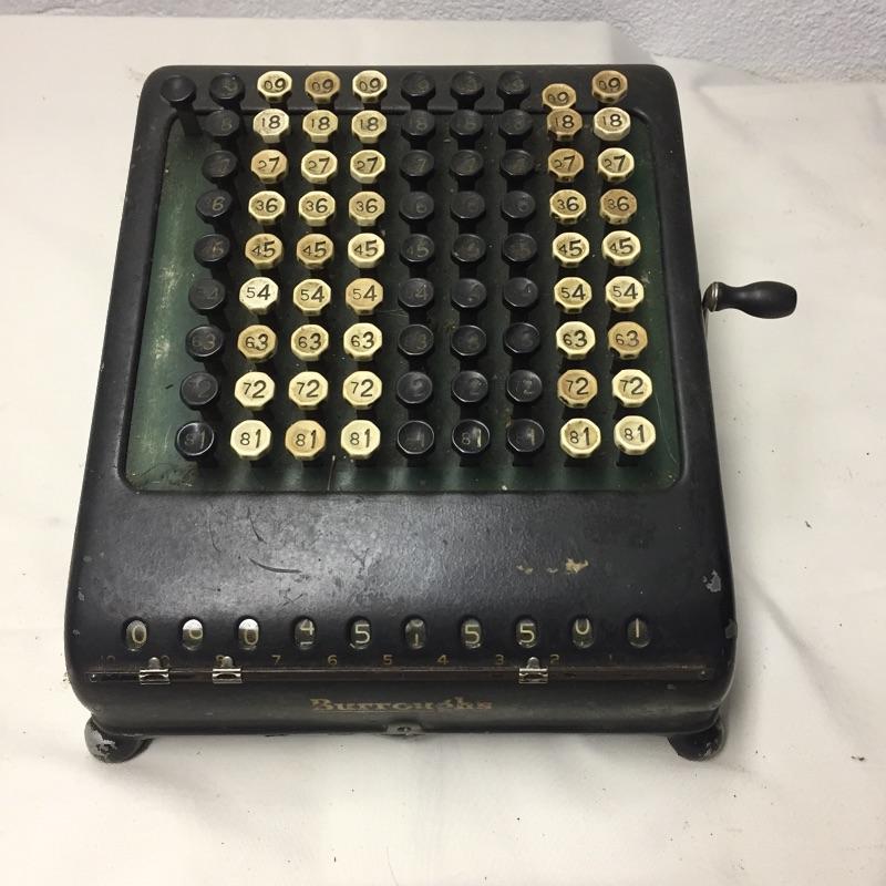 Unique Burroughs 10 column adding machine. This is a hard to find antique! Machine looks in good shape but is untested. Machine measures 9.5” x 12” x 6.75”. Shipping Available