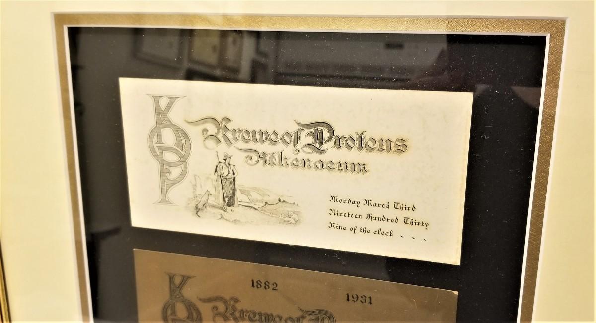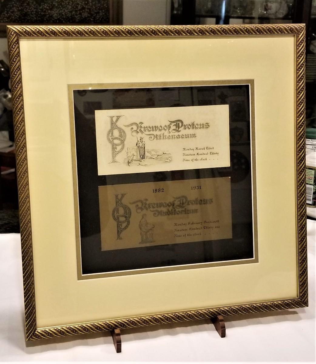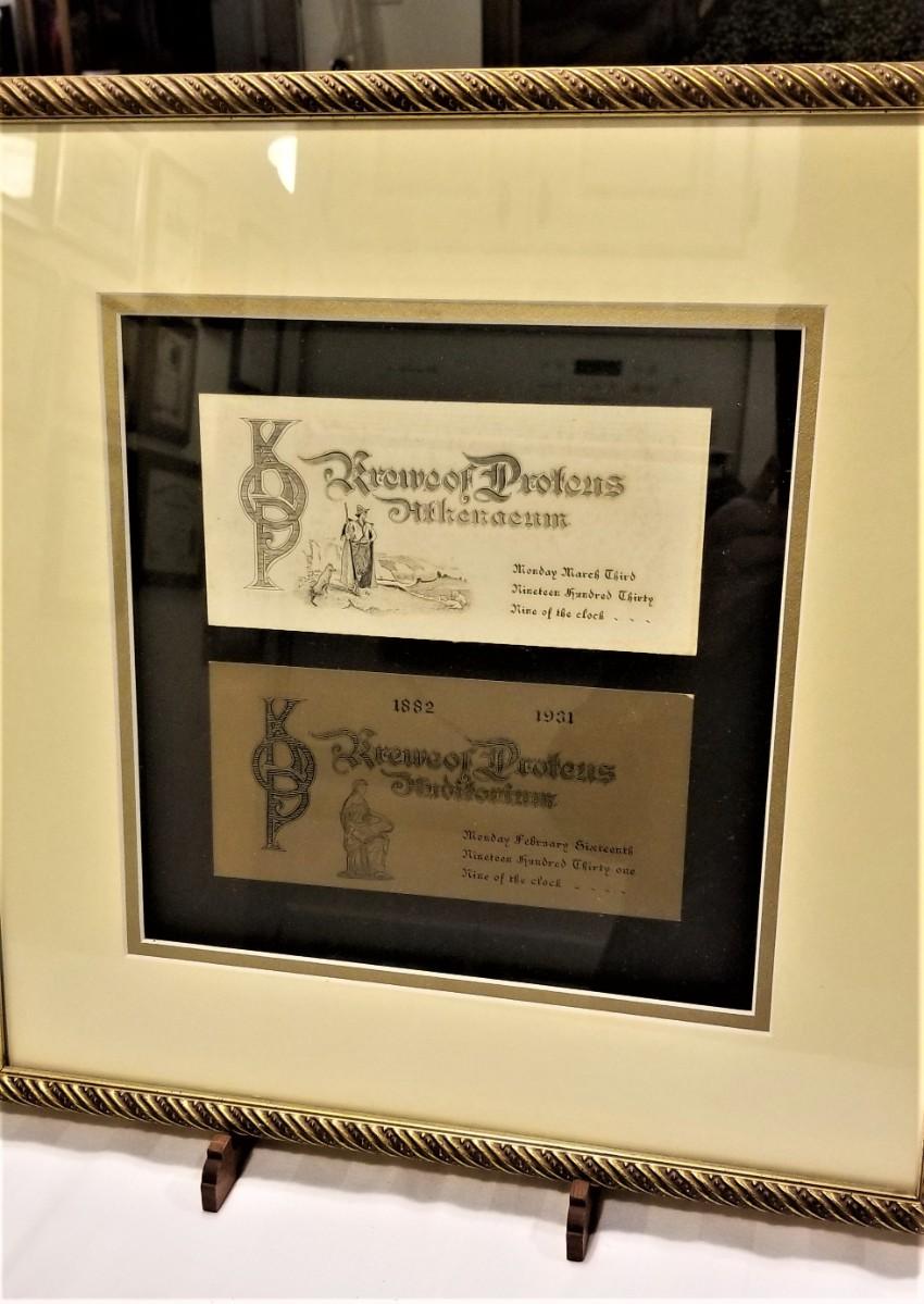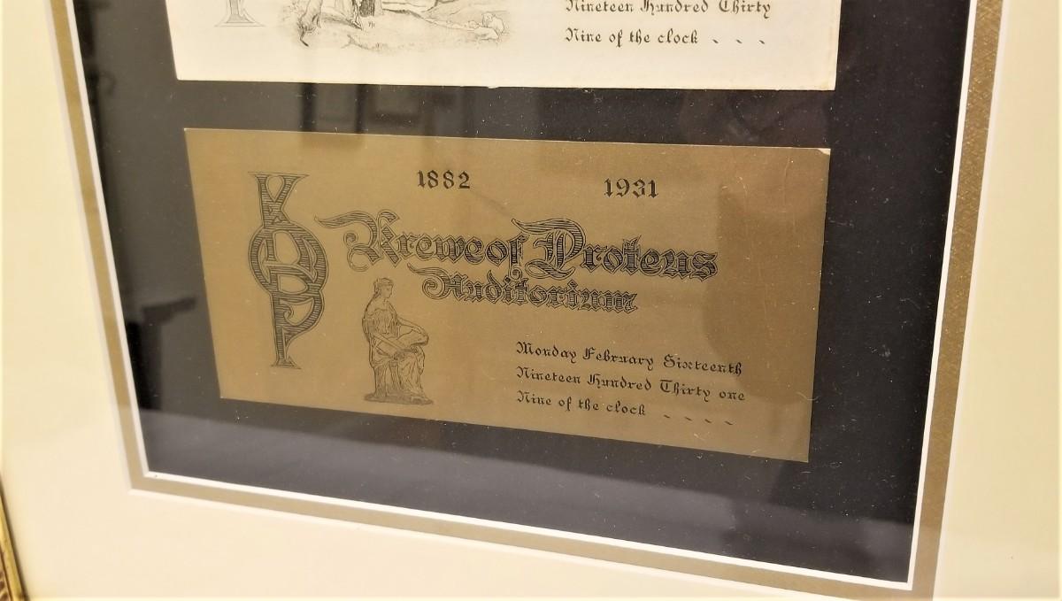 Interesting pair of vintage PROTEUS invitations/admit cards - the first, from 1930, noted the Atheneum as the venue for the Ball - the next year, 1931, the Ball had moved to the Auditorium. The cards themselves measure about 5" by 2.5" and are originals, not copies. Professionally framed and double matted. A handsome piece.