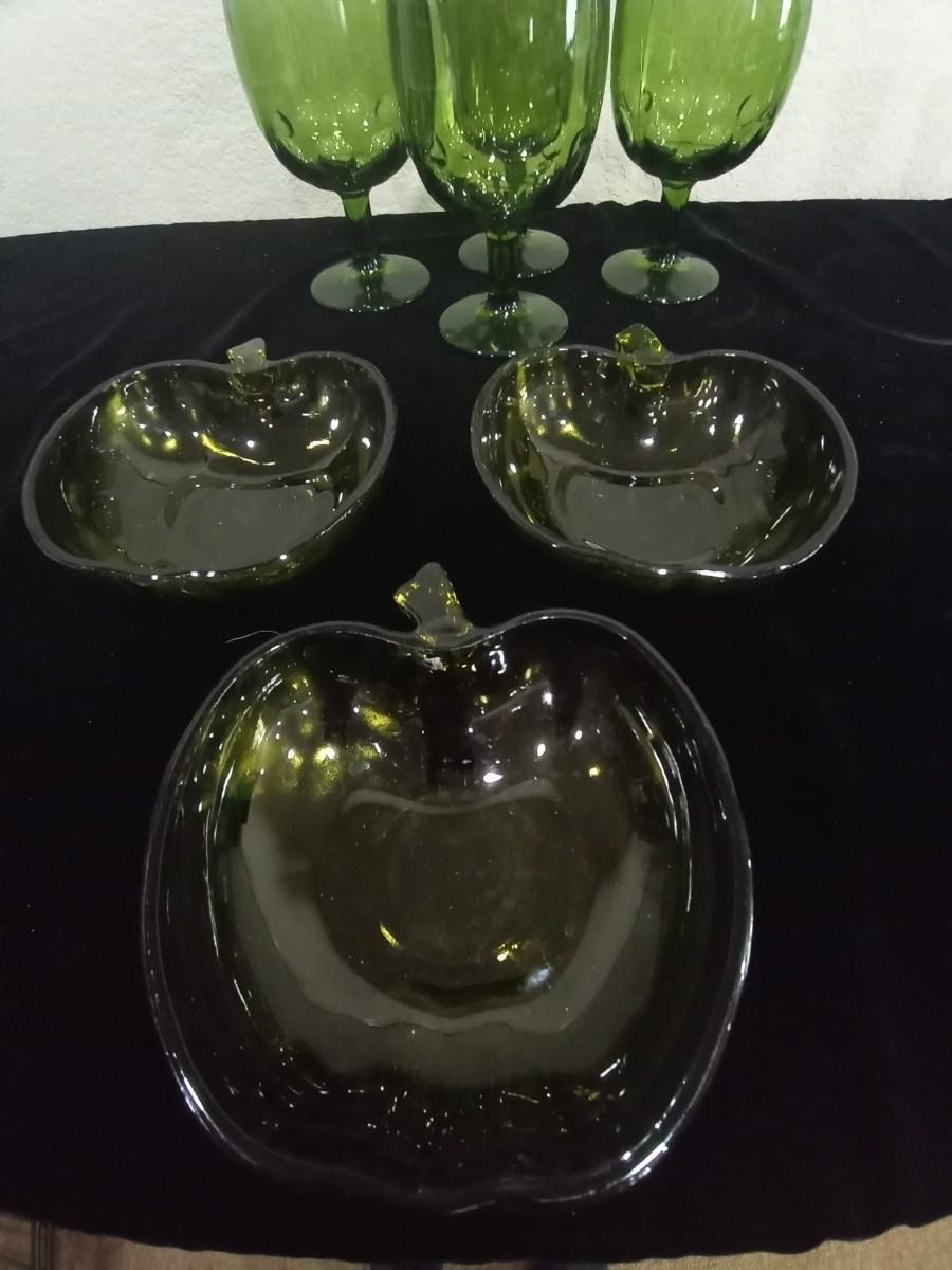 LOT 99 VINTAGE GREEN GOBLETS AND APPLE DISHES
