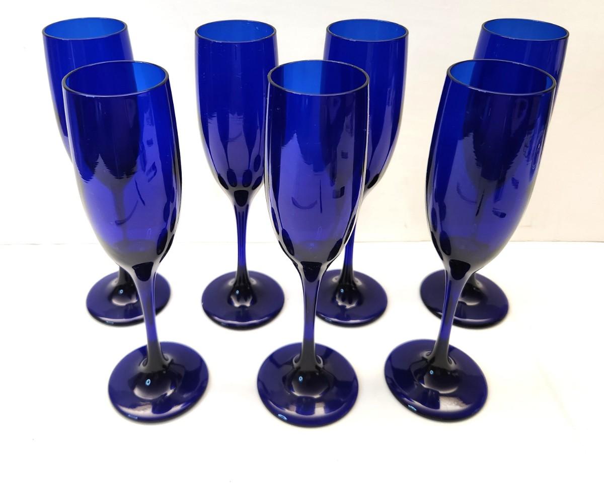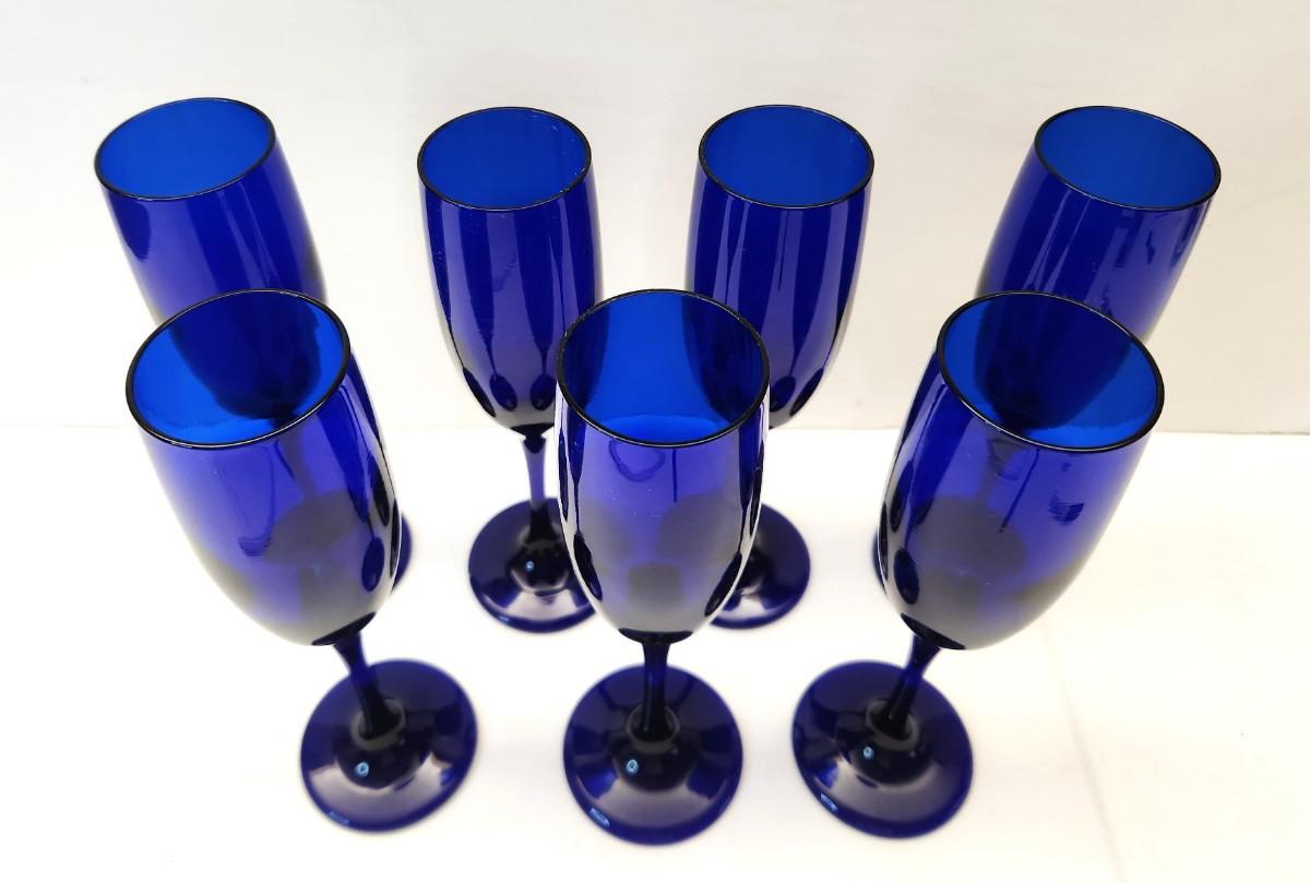 Lot of 7 vintage Libbey Glass Cobalt Blue Champagne flutes - impressed Libbey mark on bottom. Each 8.75" tall.