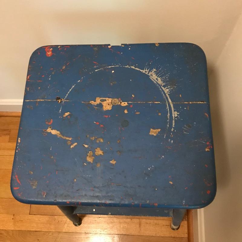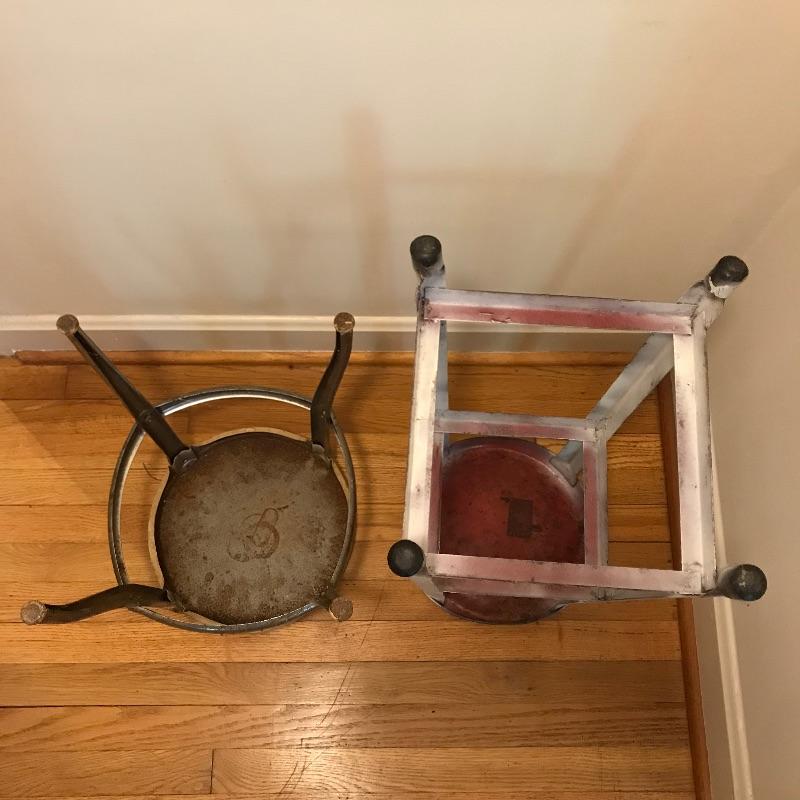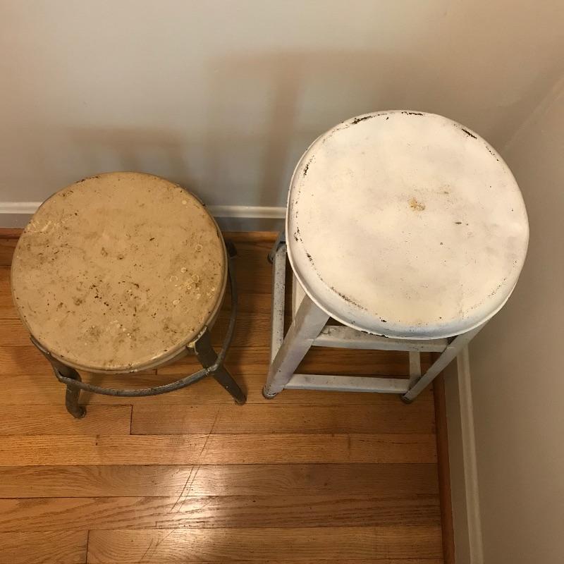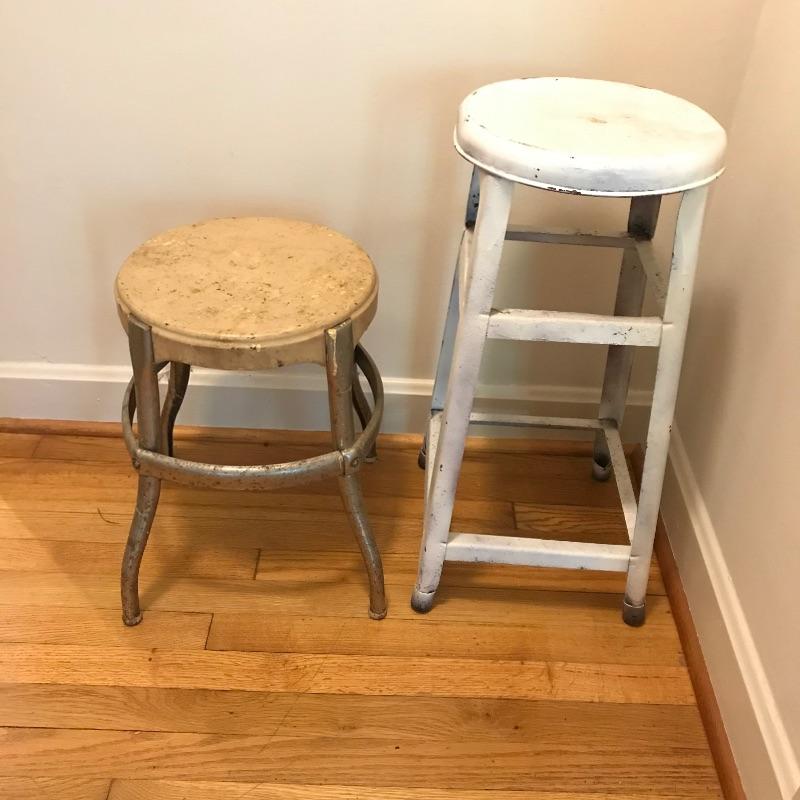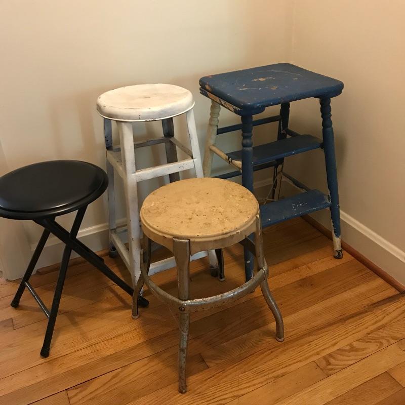 Four seats perfect for shop, basement or garage. For those artistic people out there... this lot has a lot of potential for you! We have one wooden step stool that is painted blue and white; the top won't currently open. This stool measures 14.5” x 12.5” x 24”. Two vintage metal stools are very sturdy and have a lot more life to give. The last black folding stool is versatile and easy to move and store. All stools need some cleaning as they were found in the basement and garage. See photos. Local pick up only.