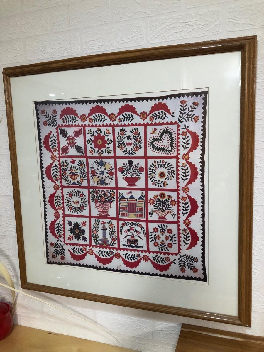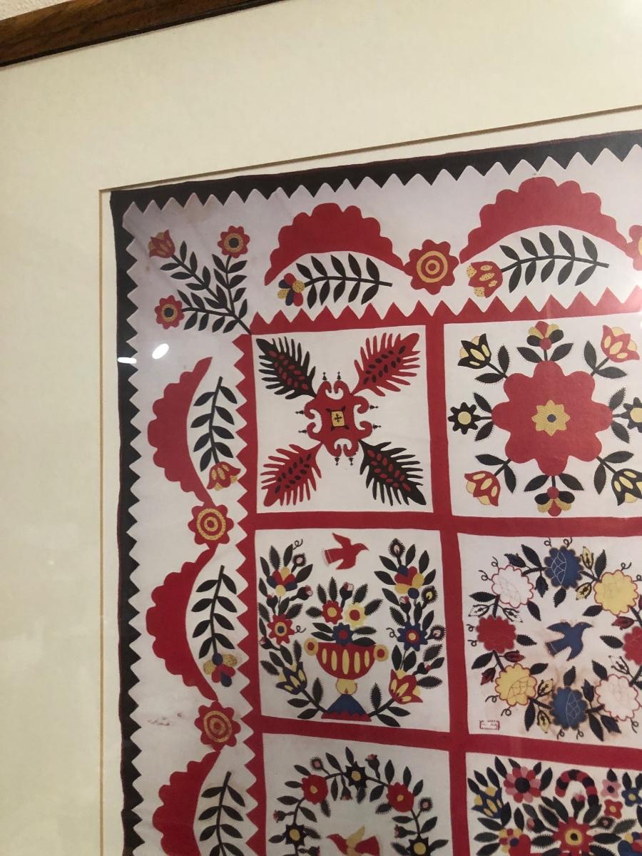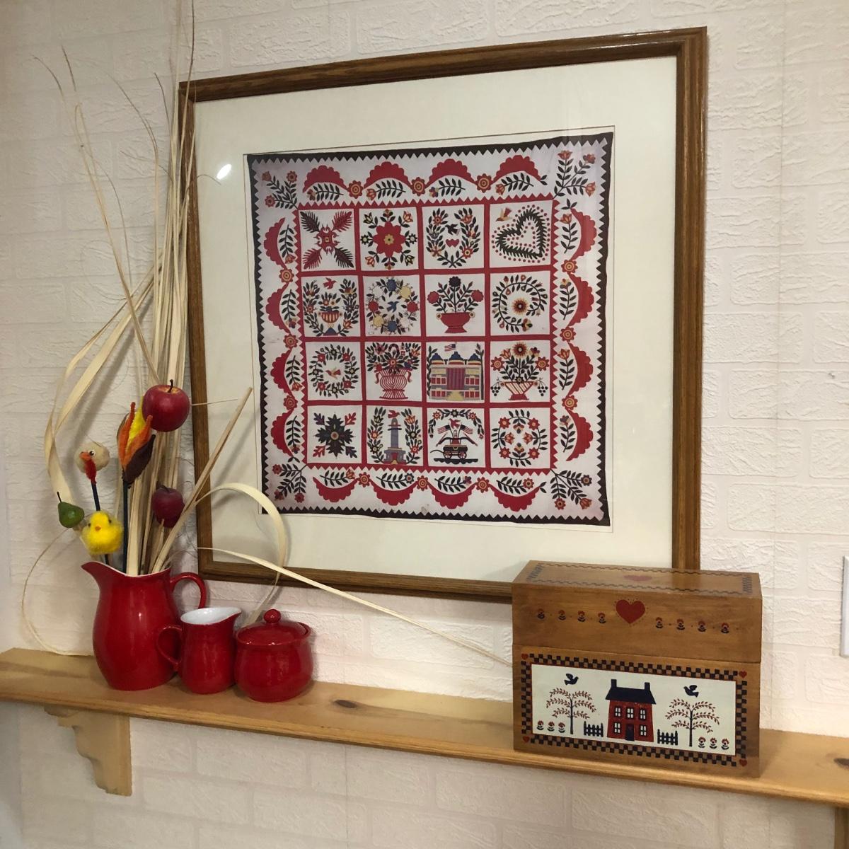 LOT 2K: Red Home Decor - Framed Baltimore Brides Quilt Print, Wooden Recipe Box & GHA Pottery Pieces