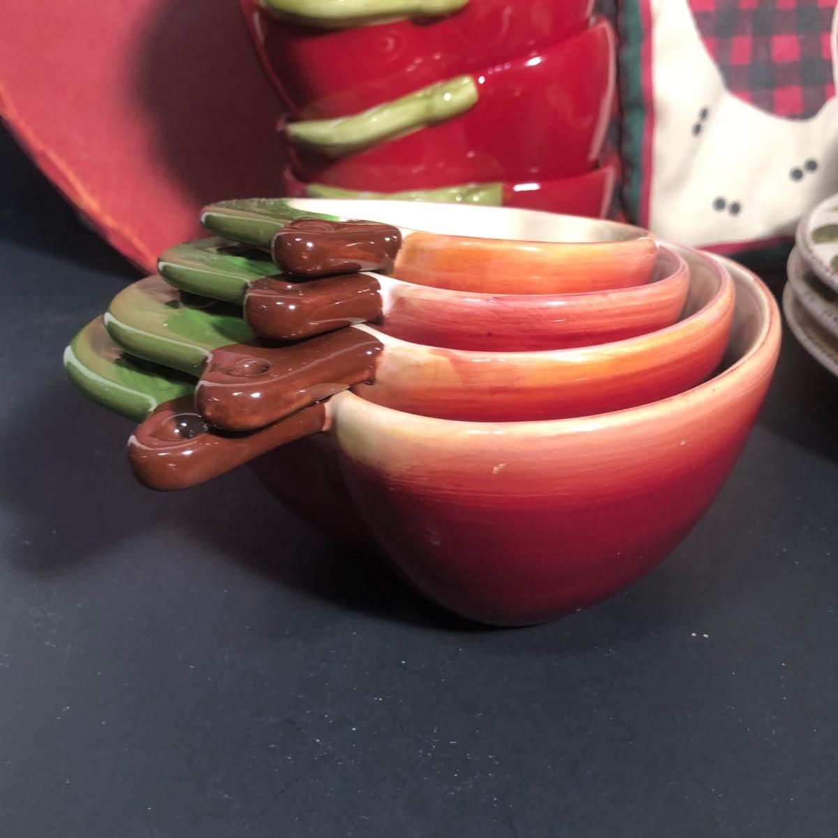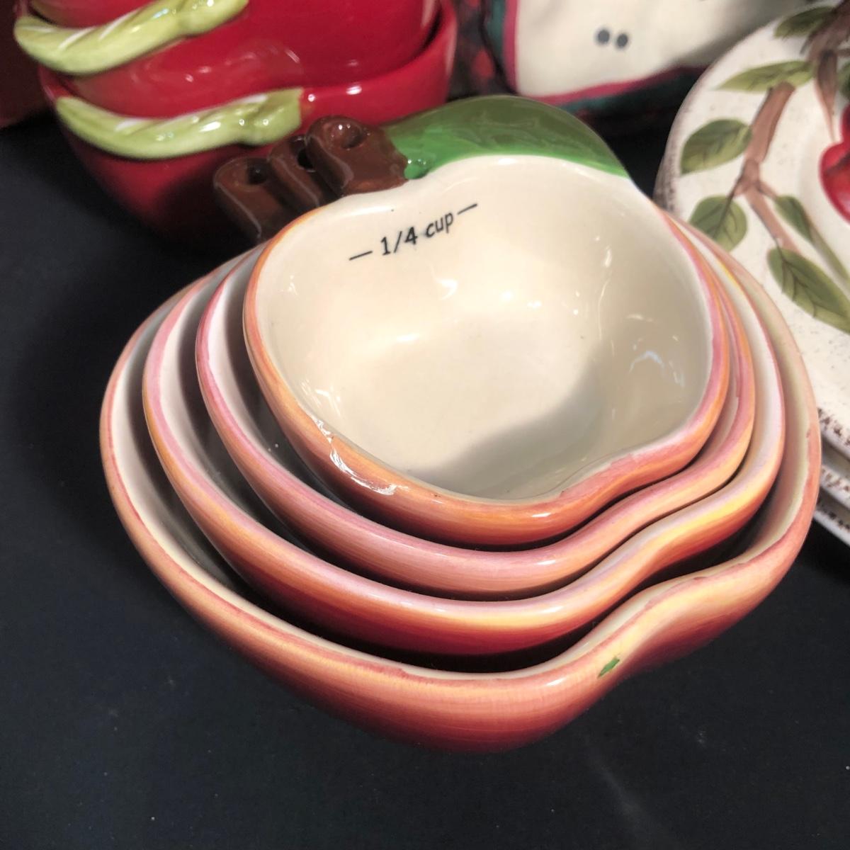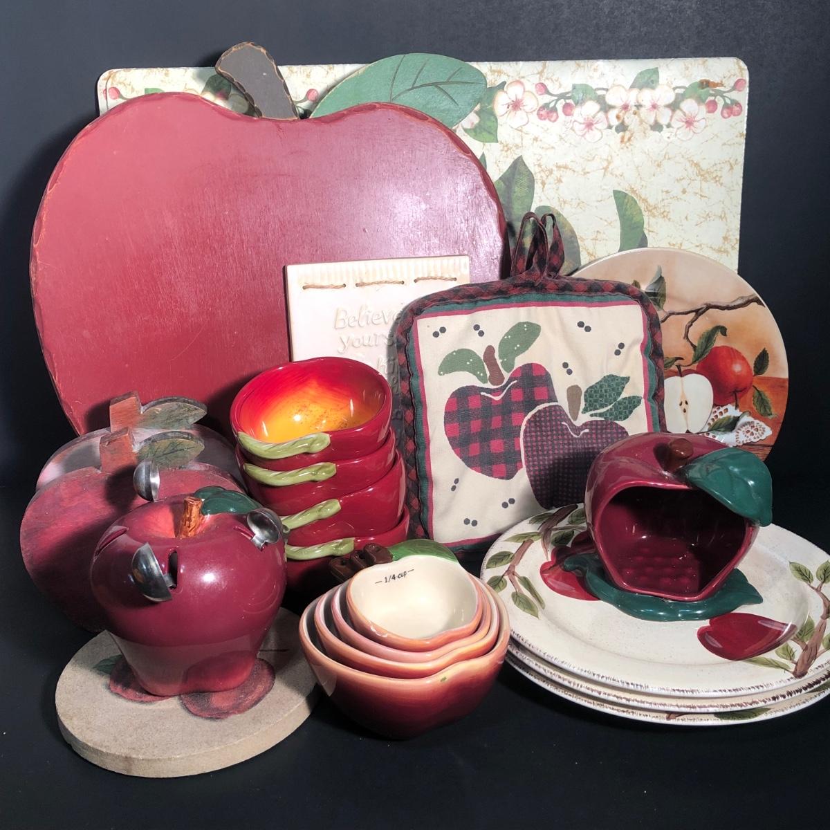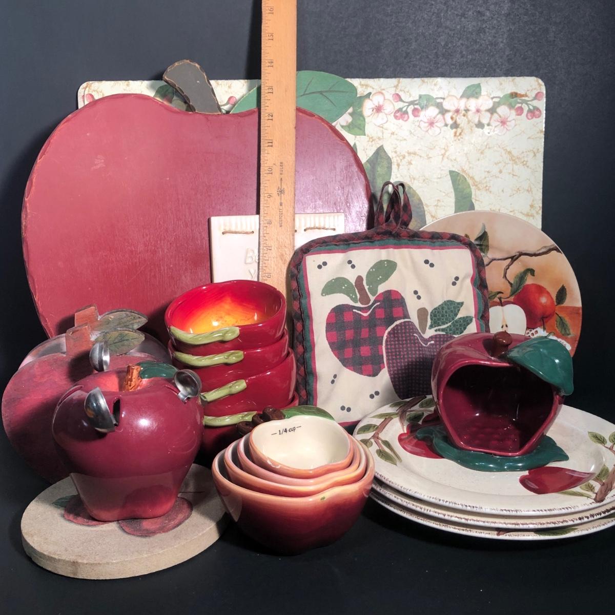 LOT 11L: Apple Themed Kitchen Collection - Placemats, Lazy Susan, Plates, Bowls, Measuring Cups & More