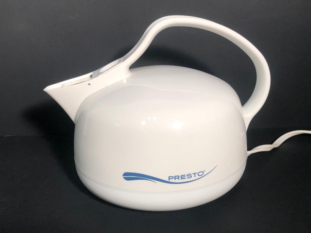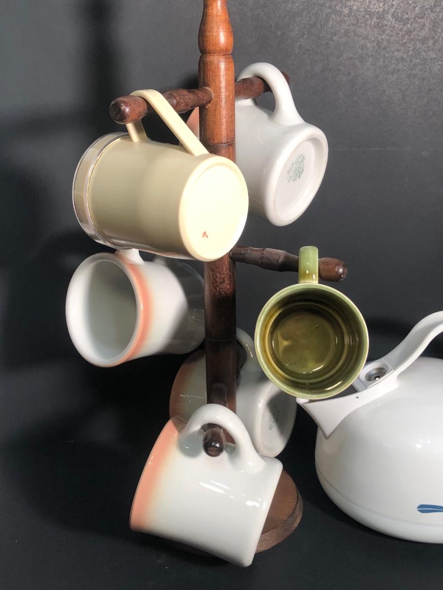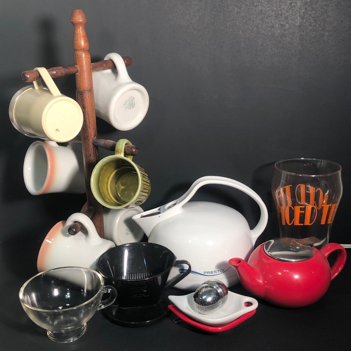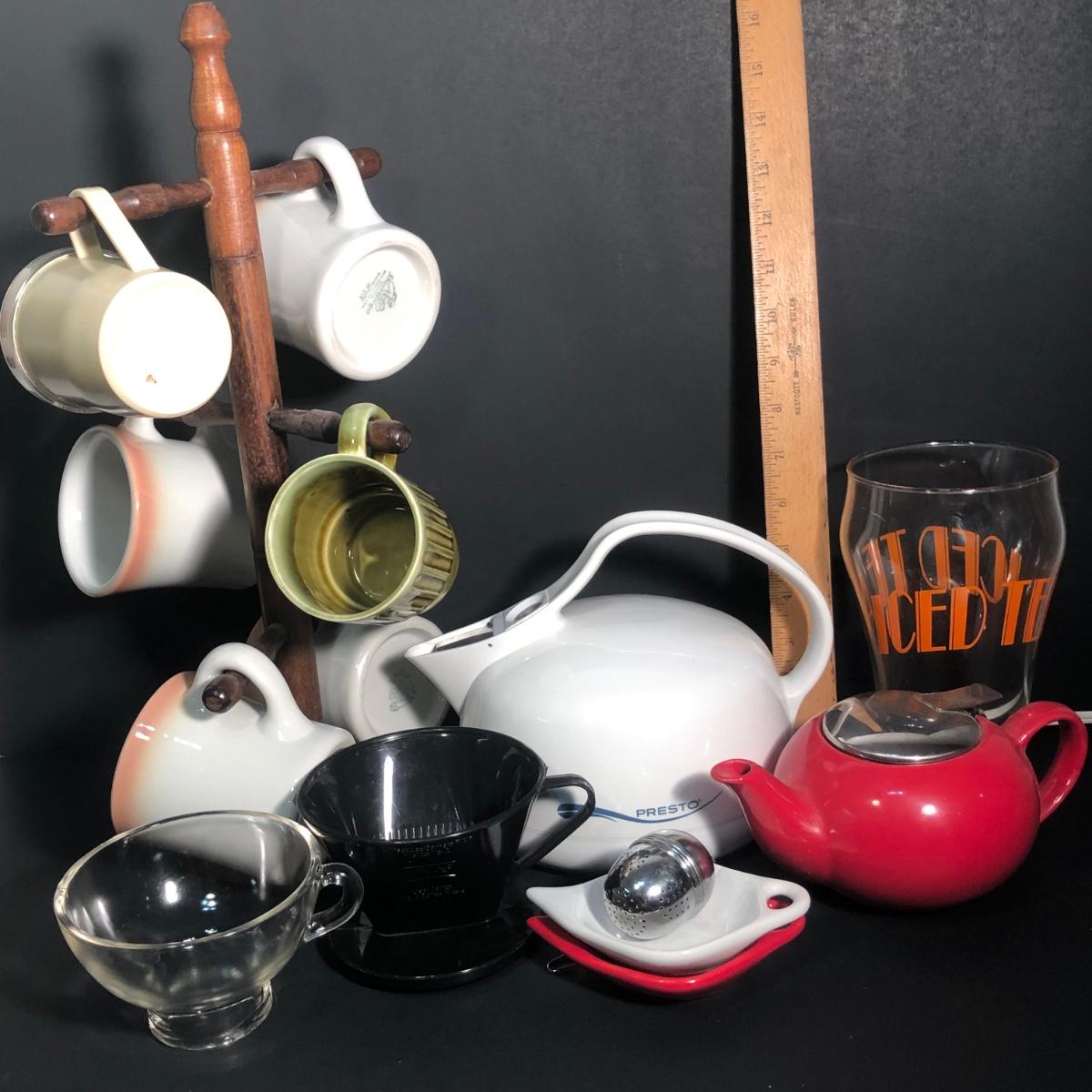LOT 13L: Tea Collection - Presto Electric Whistling Tea Kettle Model 0270303, Shenango Mugs, Pour Over Funnels, Mug Rack & More