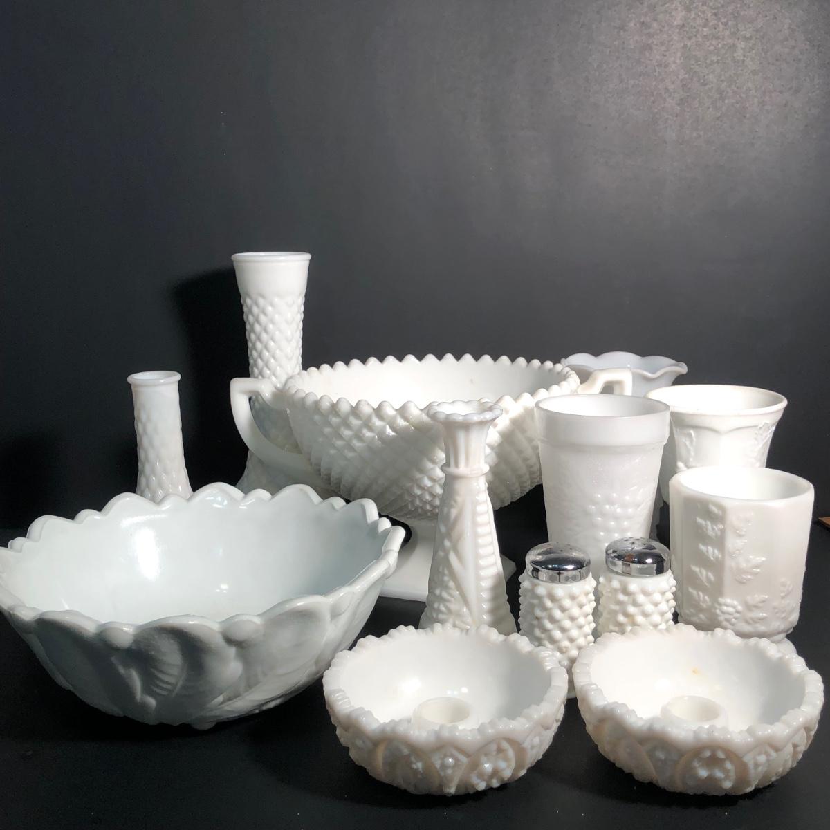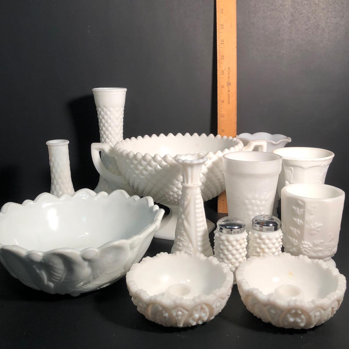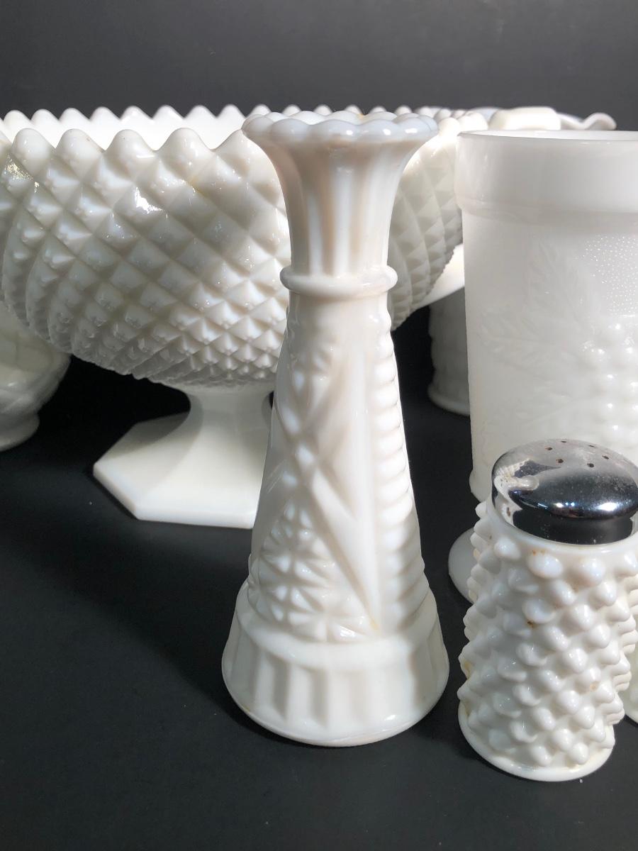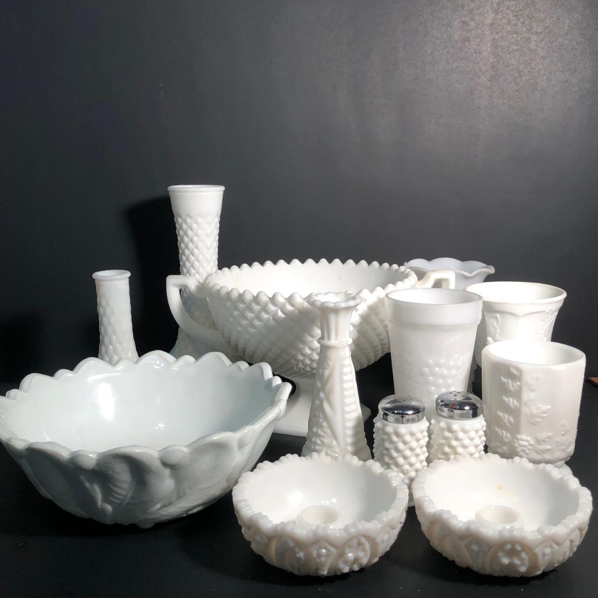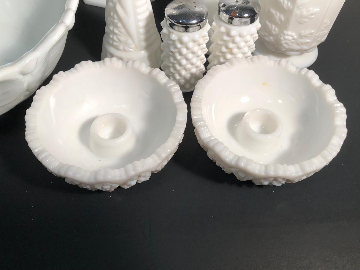 LOT 18L: Milk Glass Collection - Vases, Pedestal Bowl, Candle Holders & More