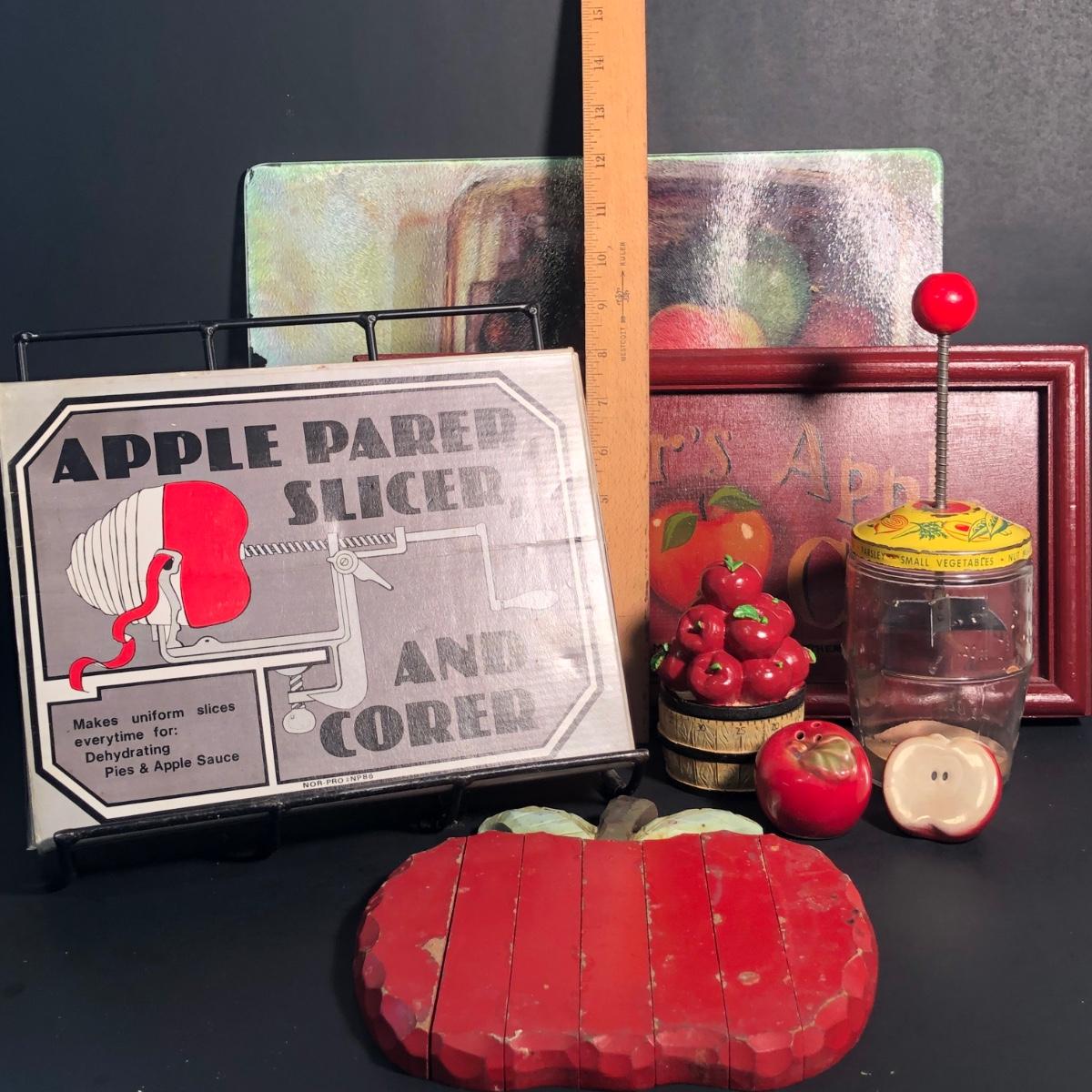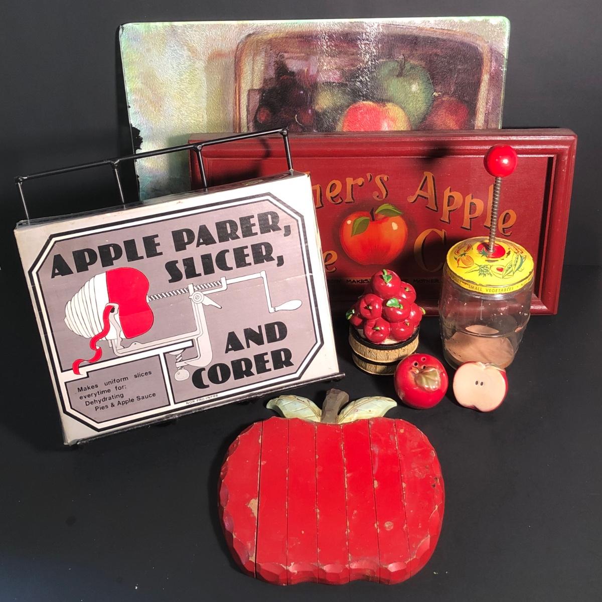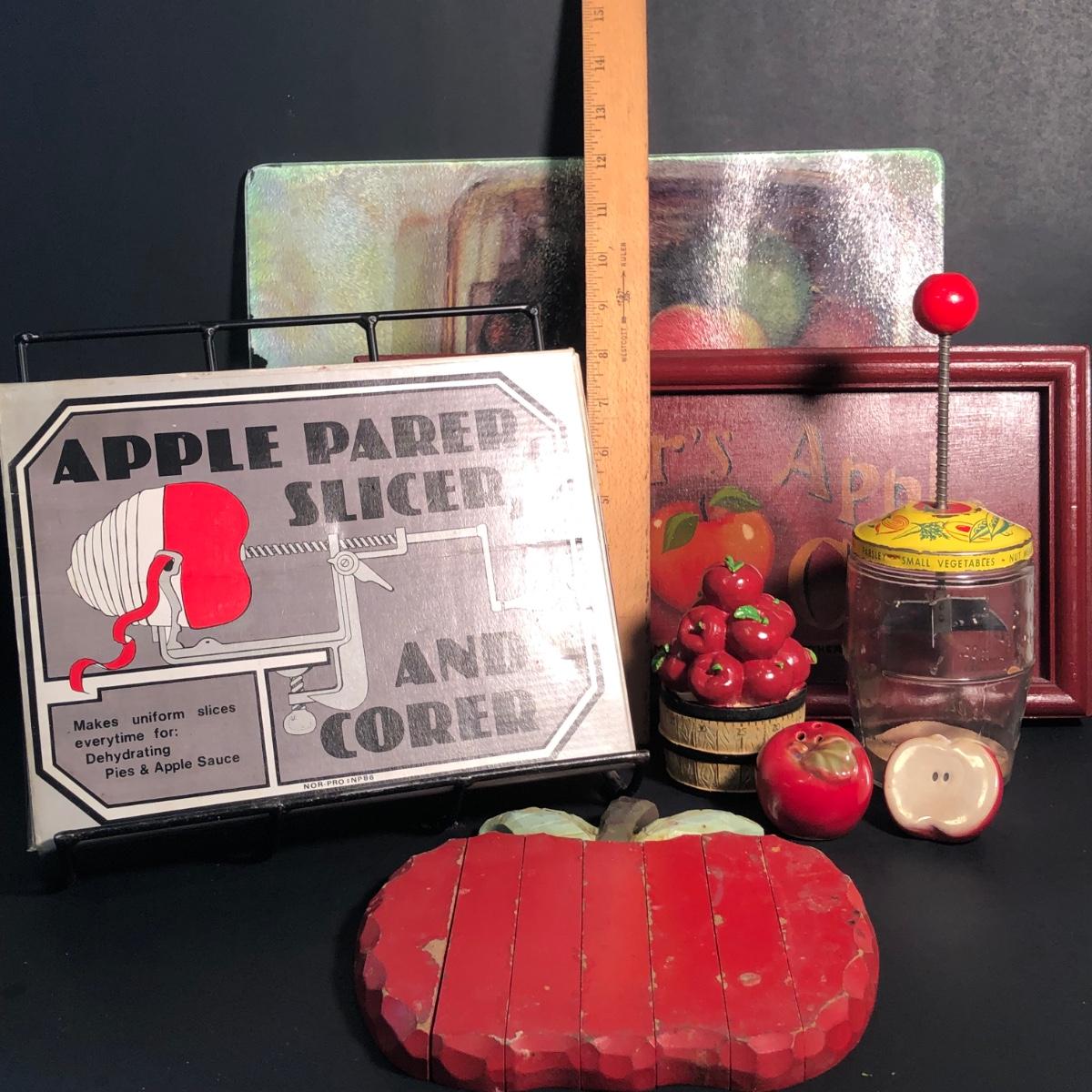 LOT 23L: Vintage Apple Parer, Slicer, and Corer, Expandable Wooden Trivet, Kitchen Timer, S&P Shakers, Counter Saver, Recipe Book Holder & More