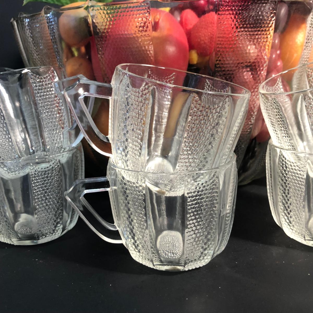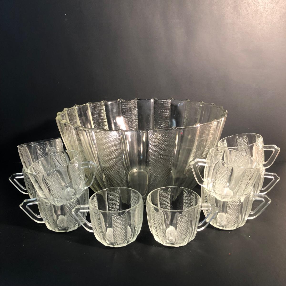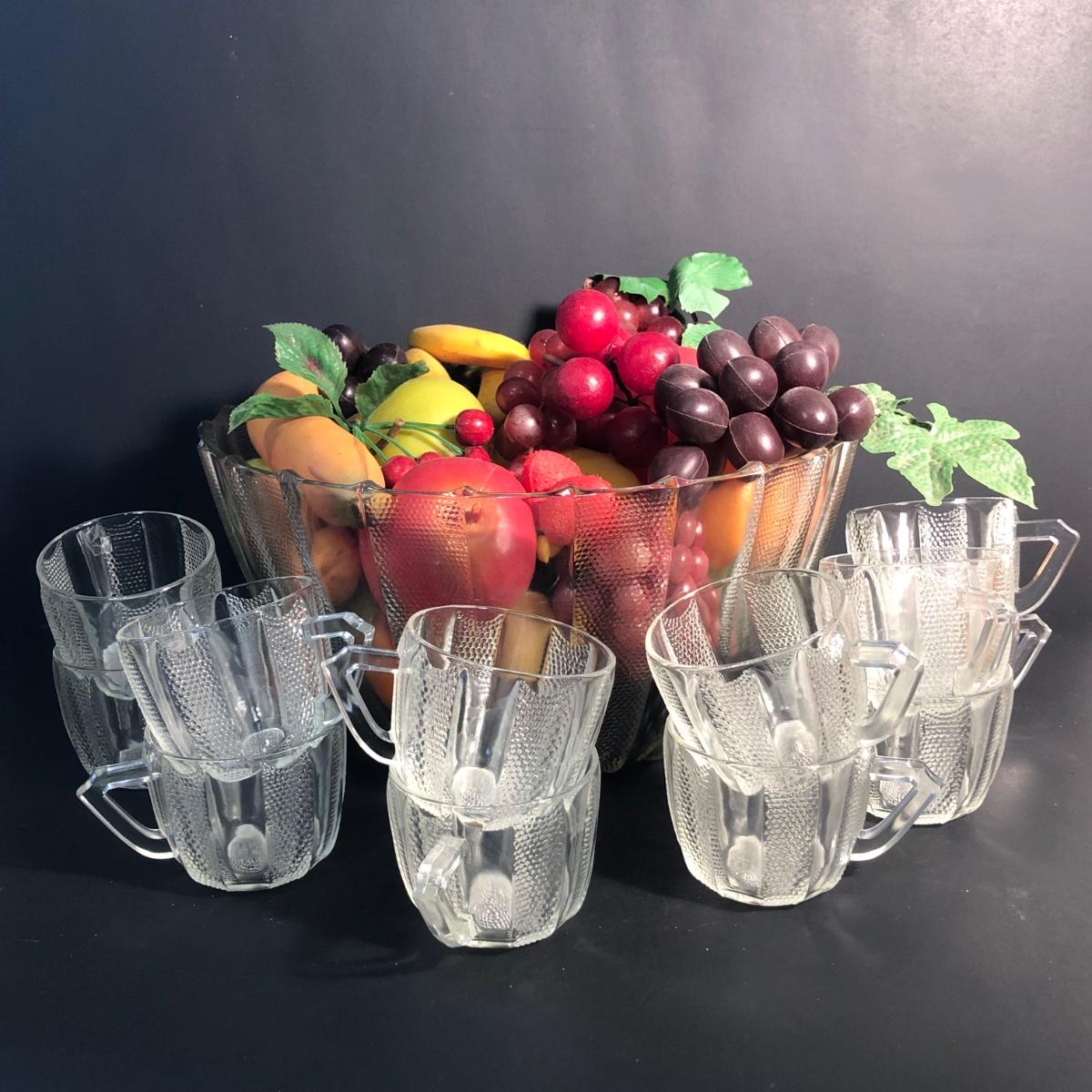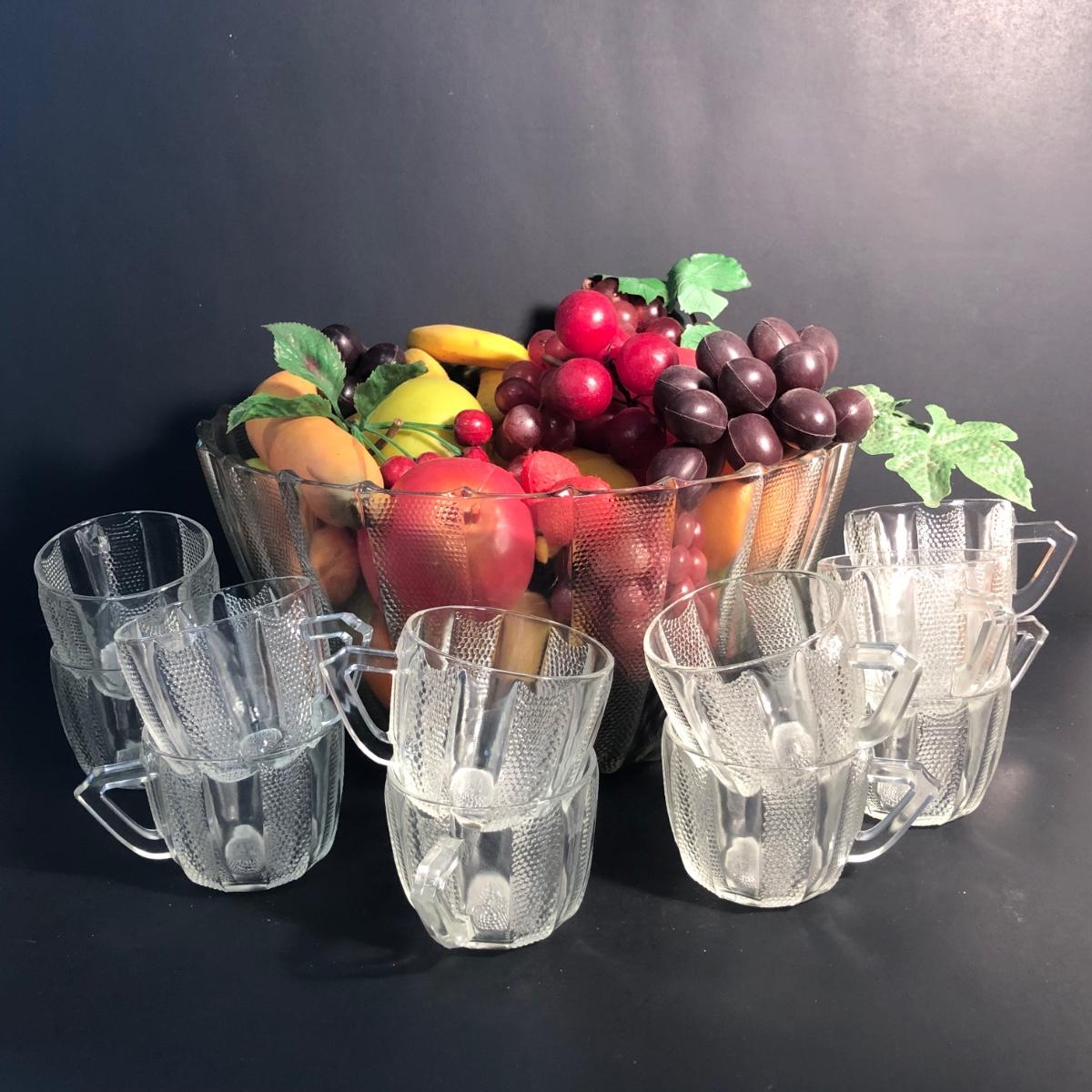 LOT 28L: Vintage Jeanette Glass Dewdrop Punch Bowl w/ 12 Matching Cups & Faux Fruit