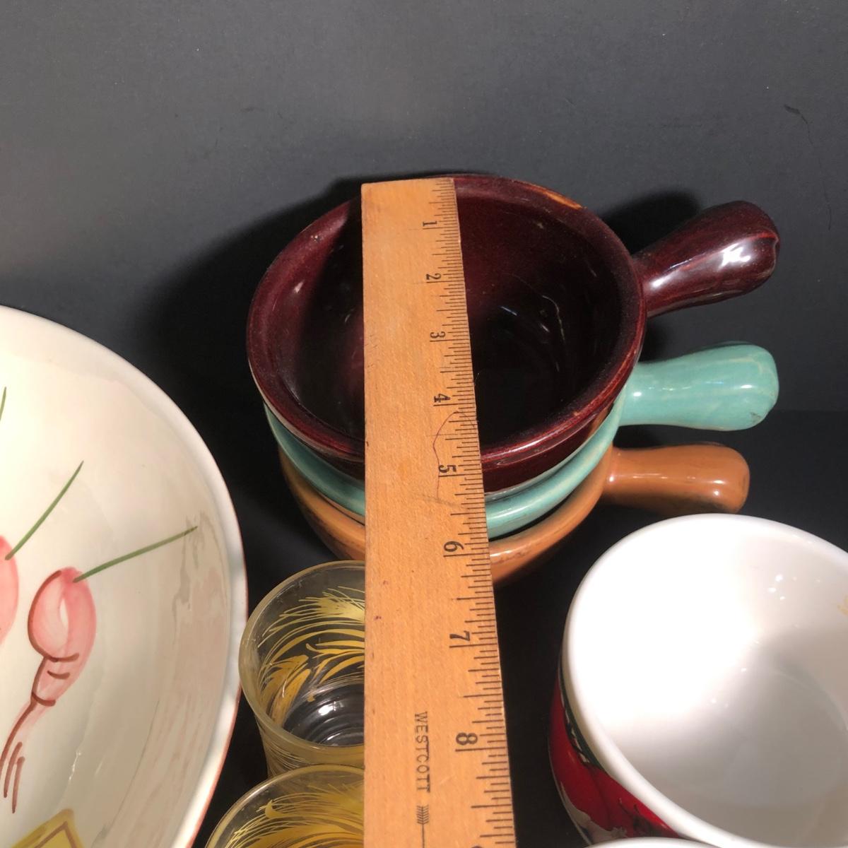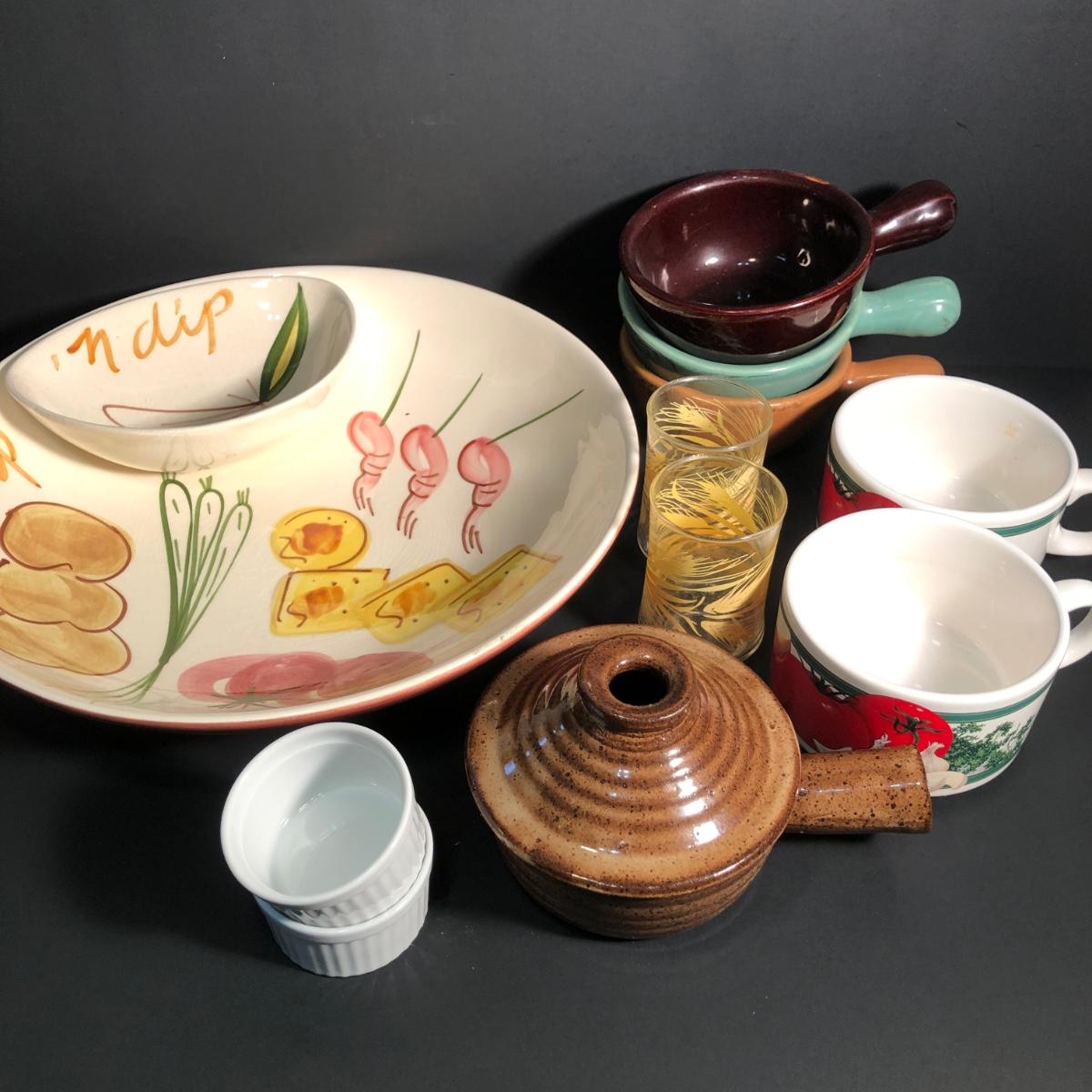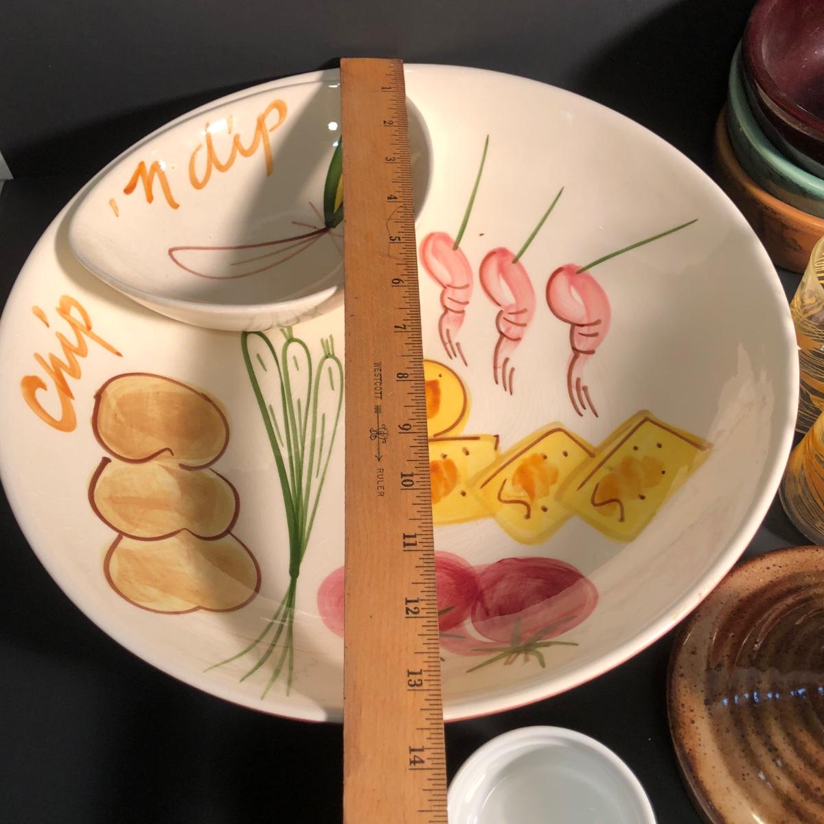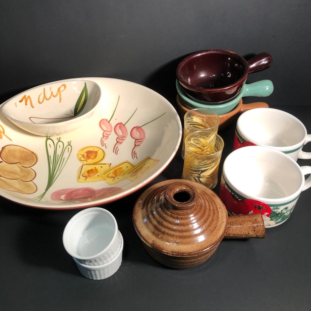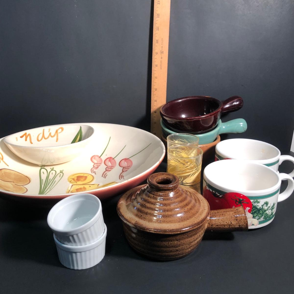 LOT 36K: Large Painted Chip 'N Dip Bowl, Libbey Wheat Glasses (2), Hickory Farms Soup Bowls & More