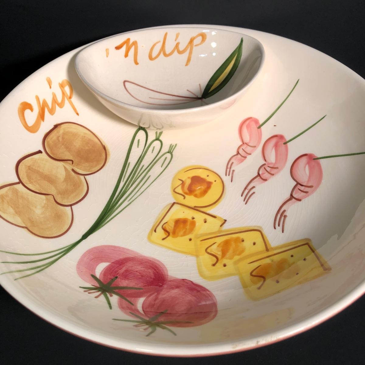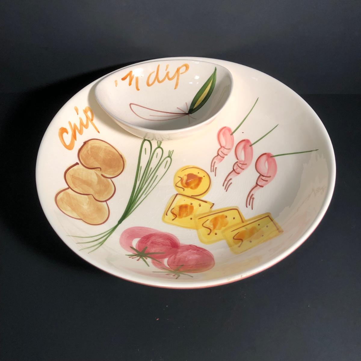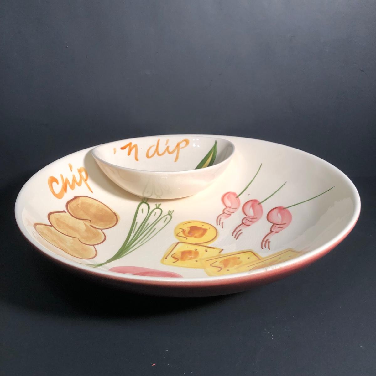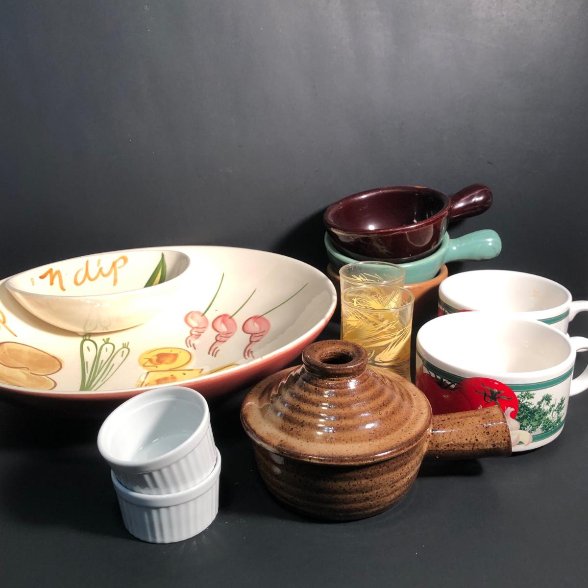 LOT 36K: Large Painted Chip 'N Dip Bowl, Libbey Wheat Glasses (2), Hickory Farms Soup Bowls & More