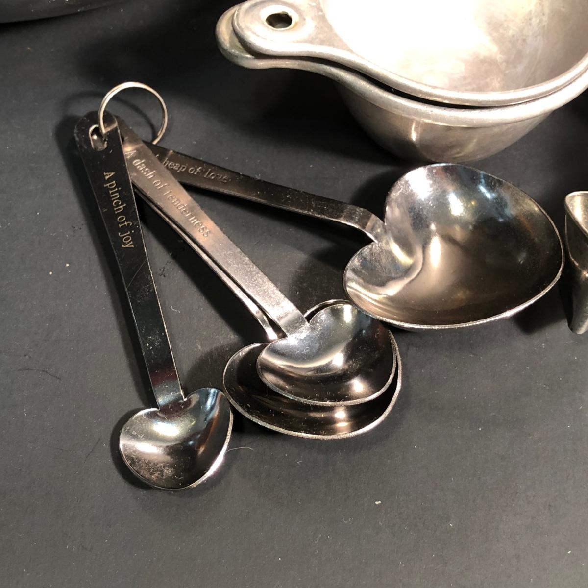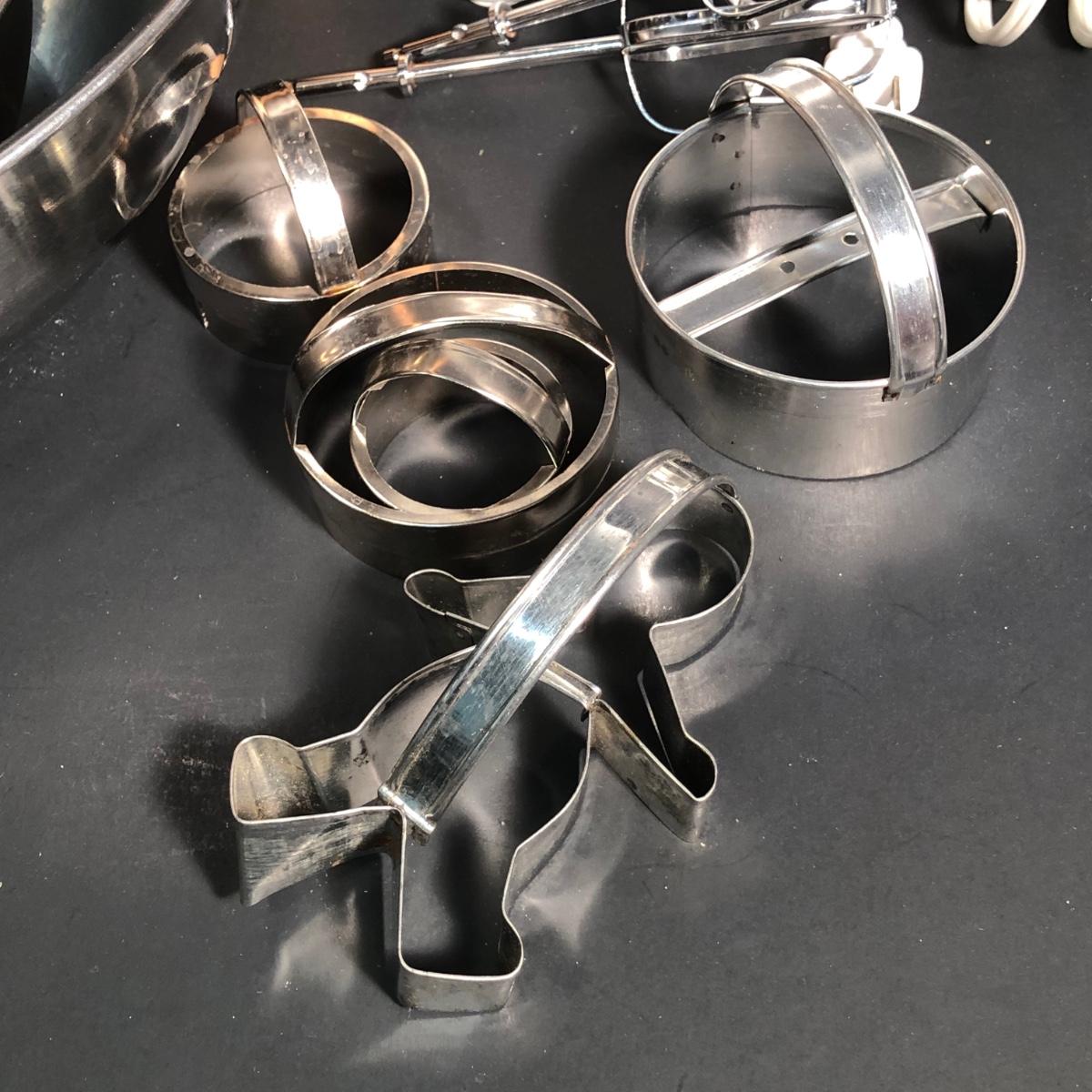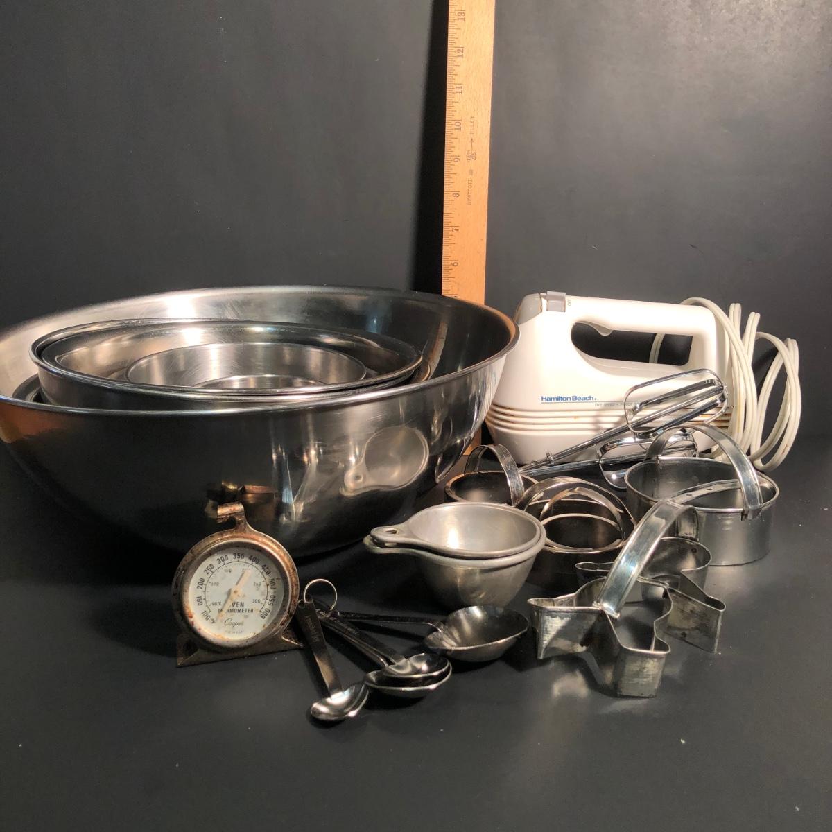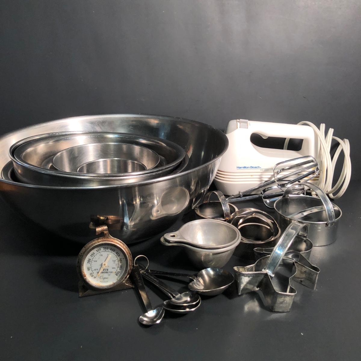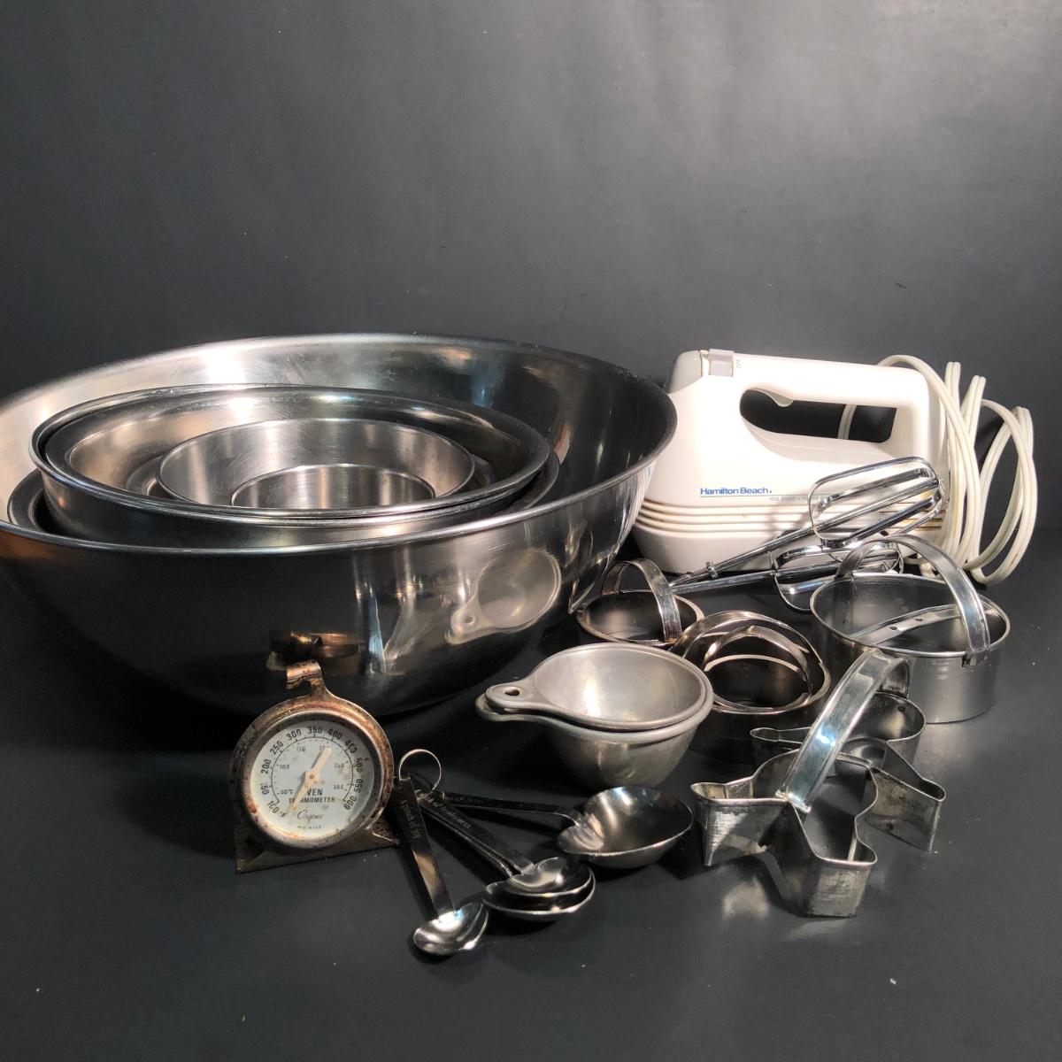 LOT 40K: Baking Collection - Stainless Mixing Bowls, Hamilton Beach Electric Mixer Model 2326, Cookie Cutters, Heart Shaped Measuring Spoons & More