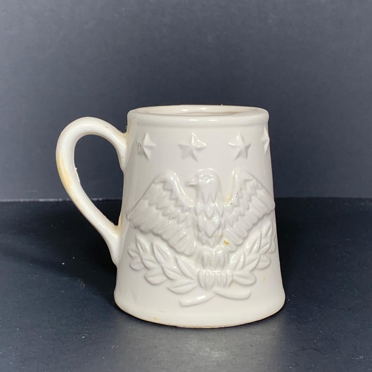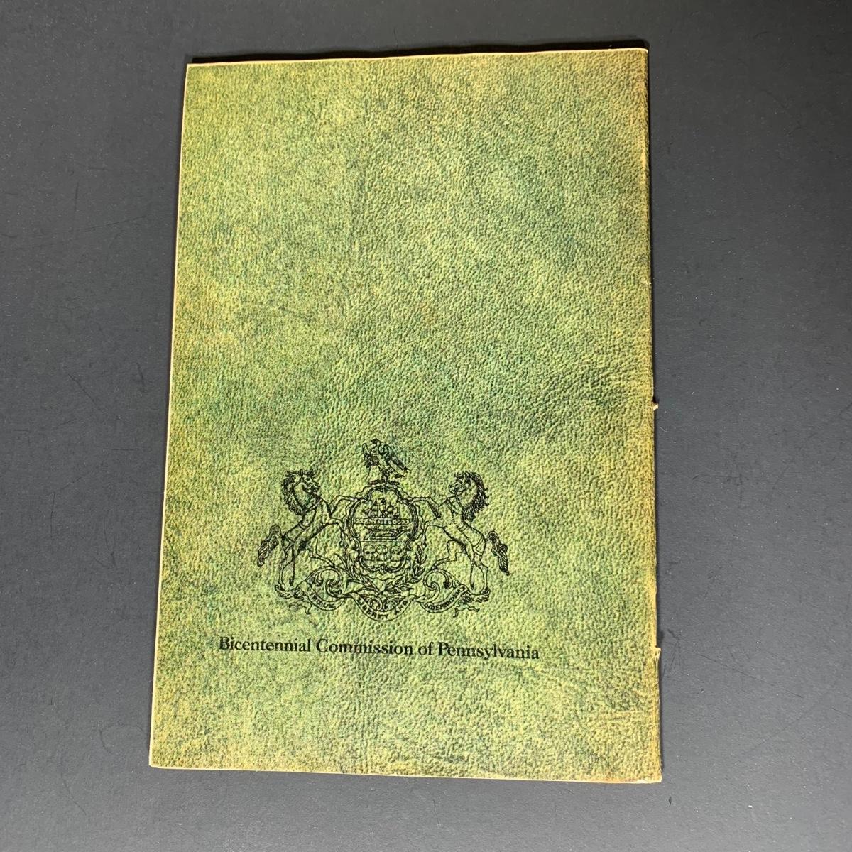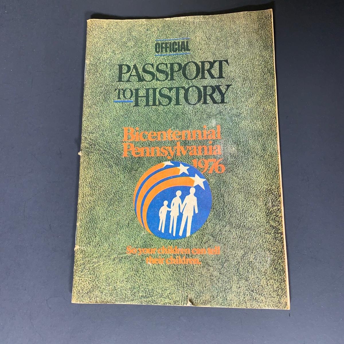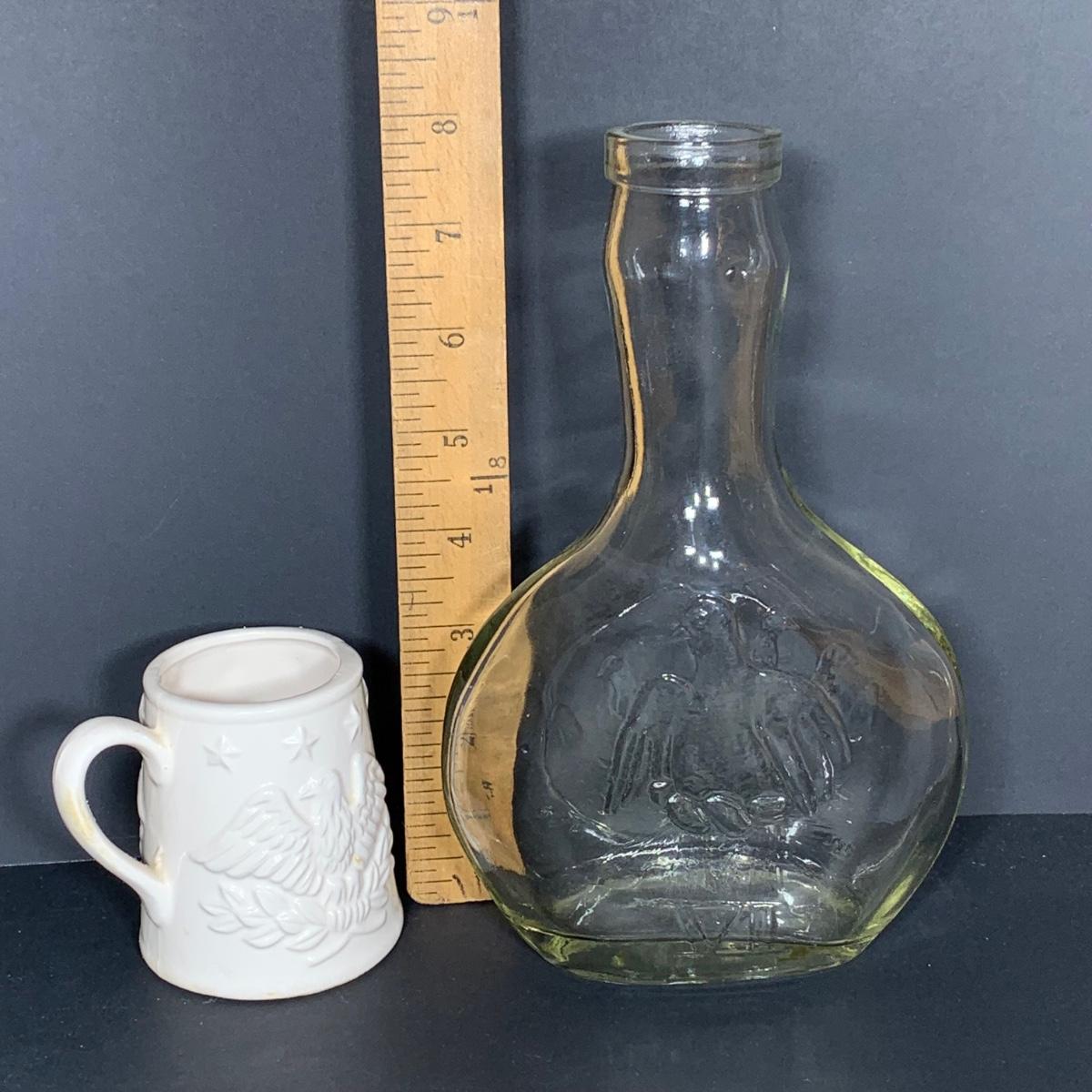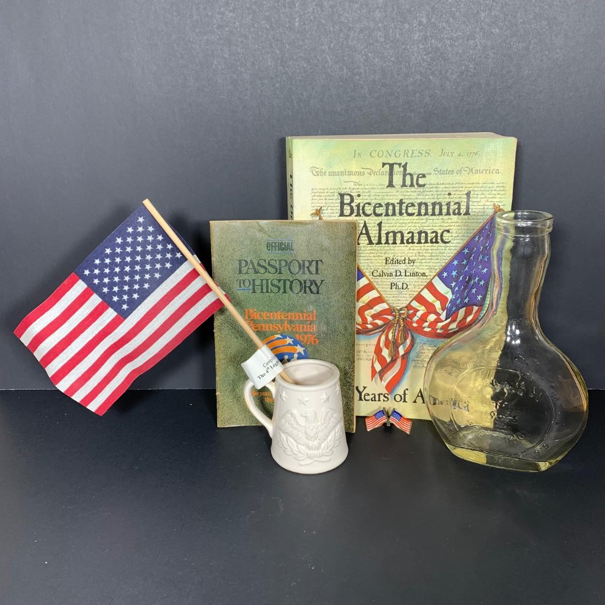 LOT 50 L: Bicentennial Almanac, Passport To History Booklet, White Ceramic Cup W/ Eagle, Glass Bicentennial Bottle, & Flag
