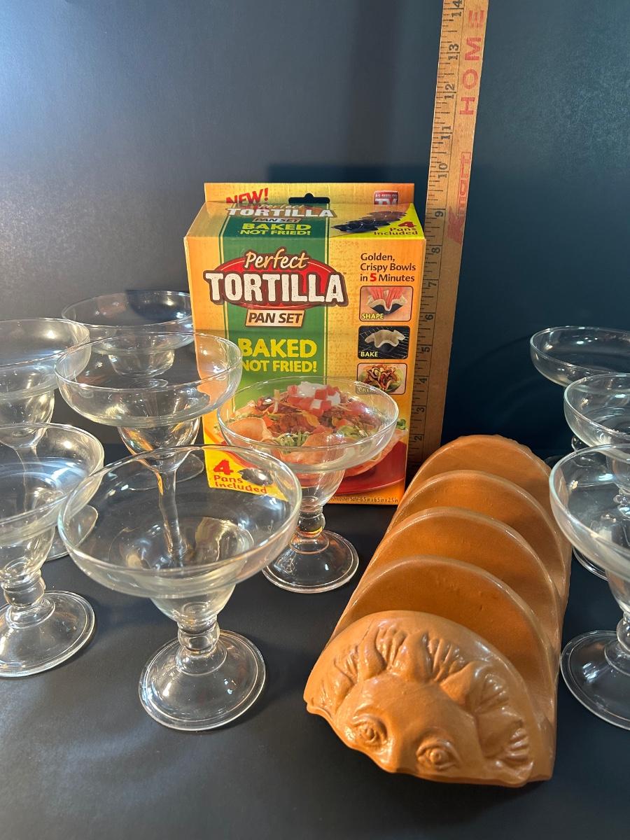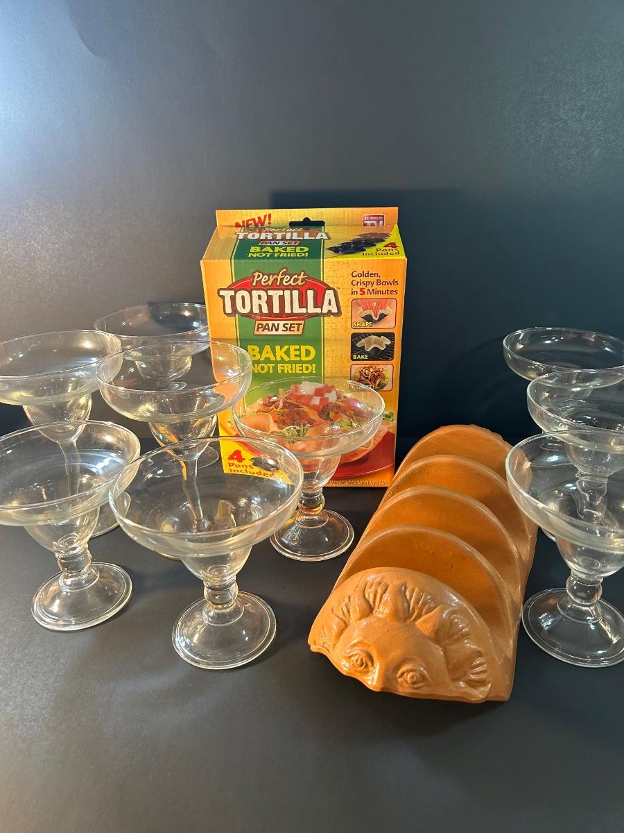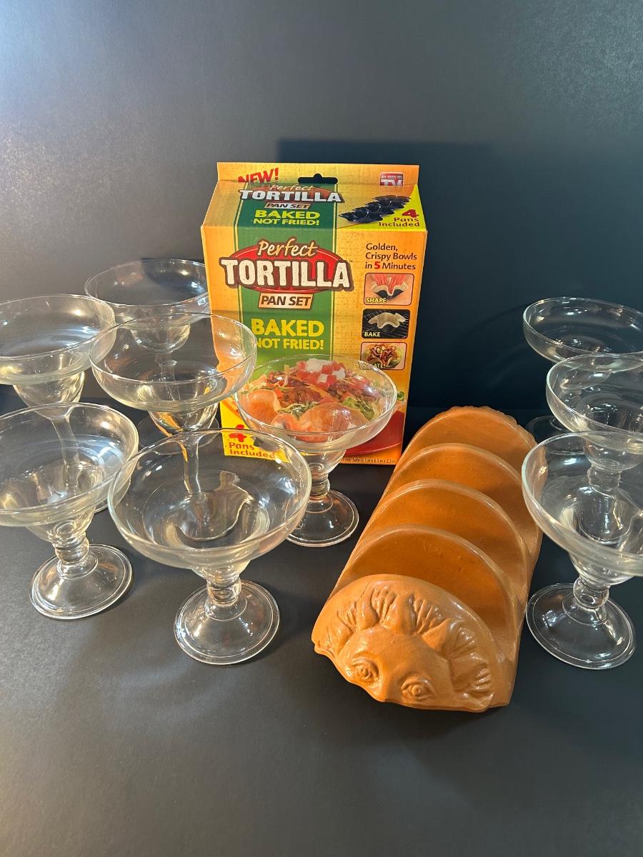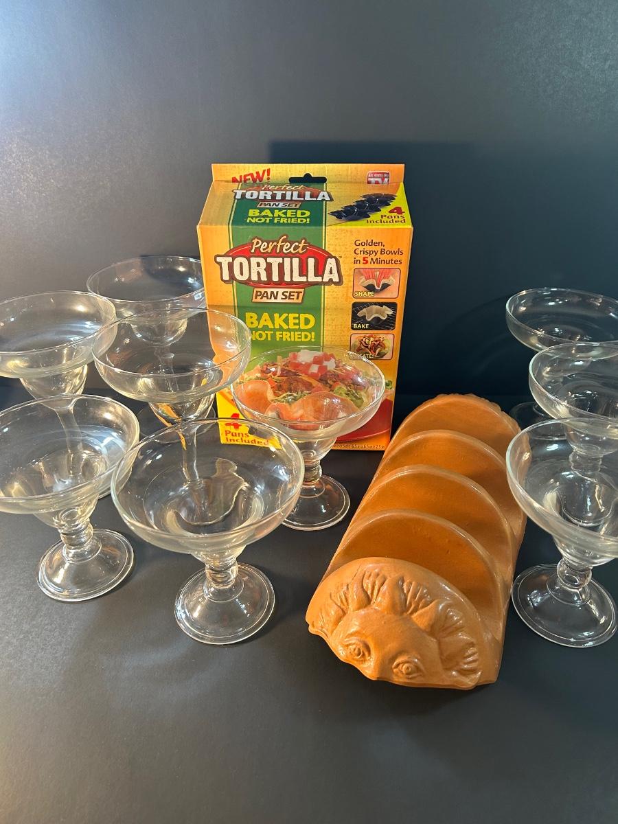LOT 121 D: Pier 1 Imports Taco Holder, Margarita Glasses & Tortilla Pan Set NIB