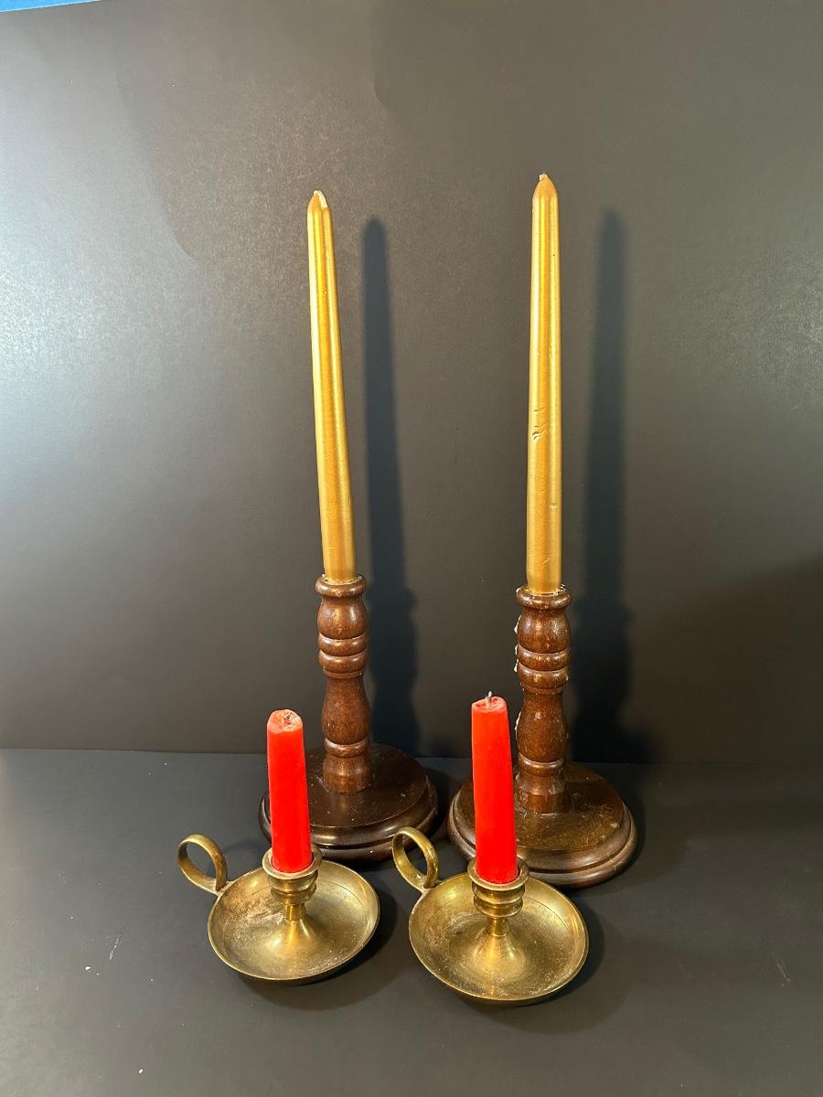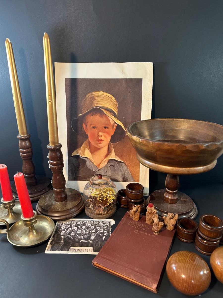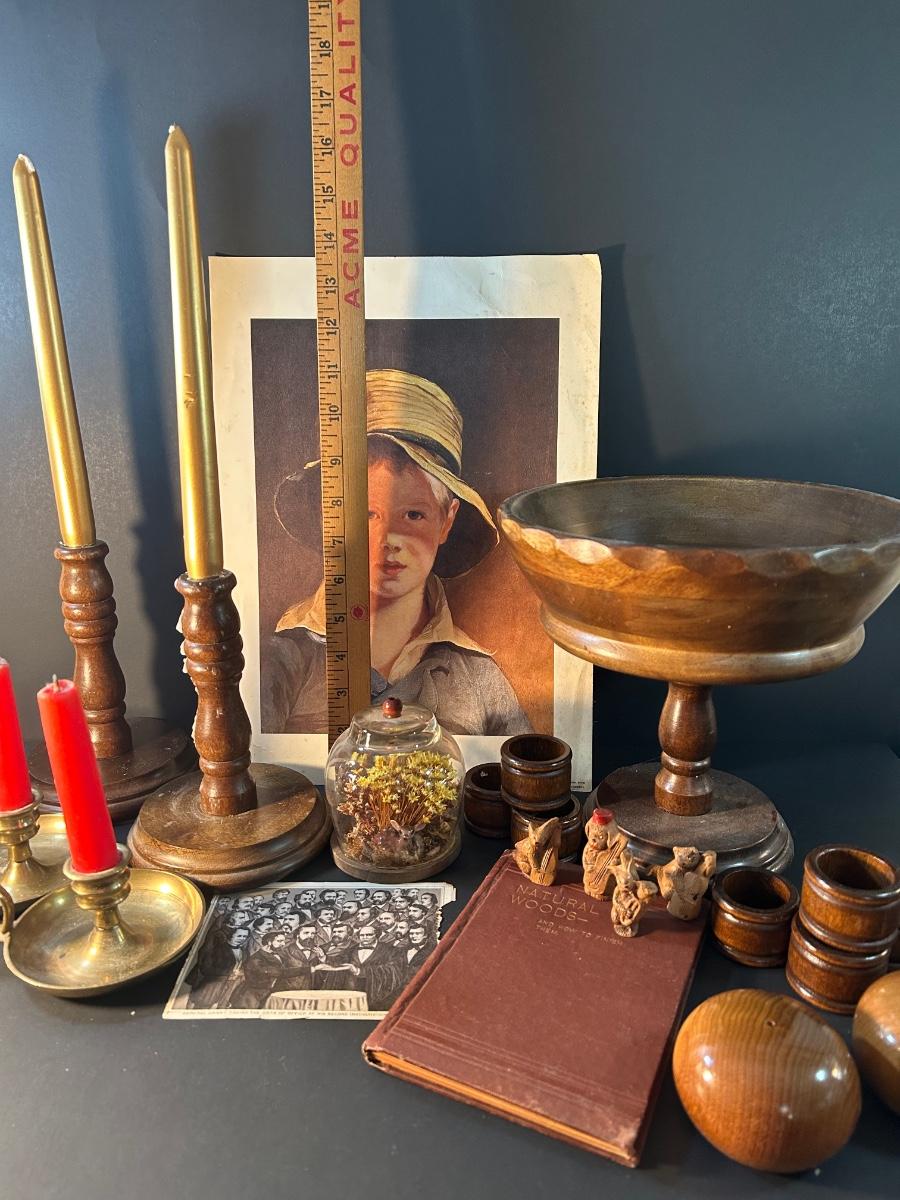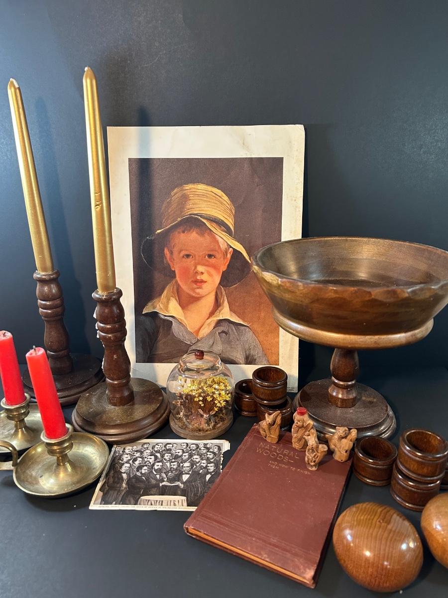 LOT 124D: Vintage Home Decor- The Torn Hat By Thomas Scully, Wood And Brass Candlesticks, Plate Stand And More
