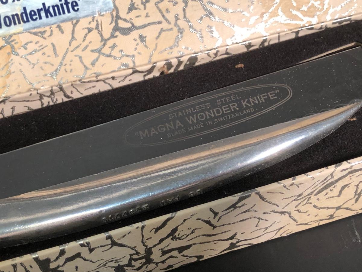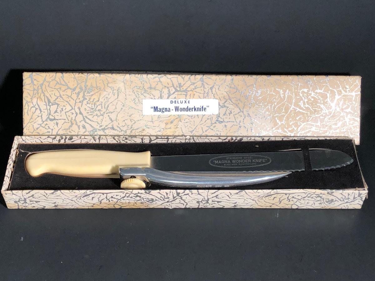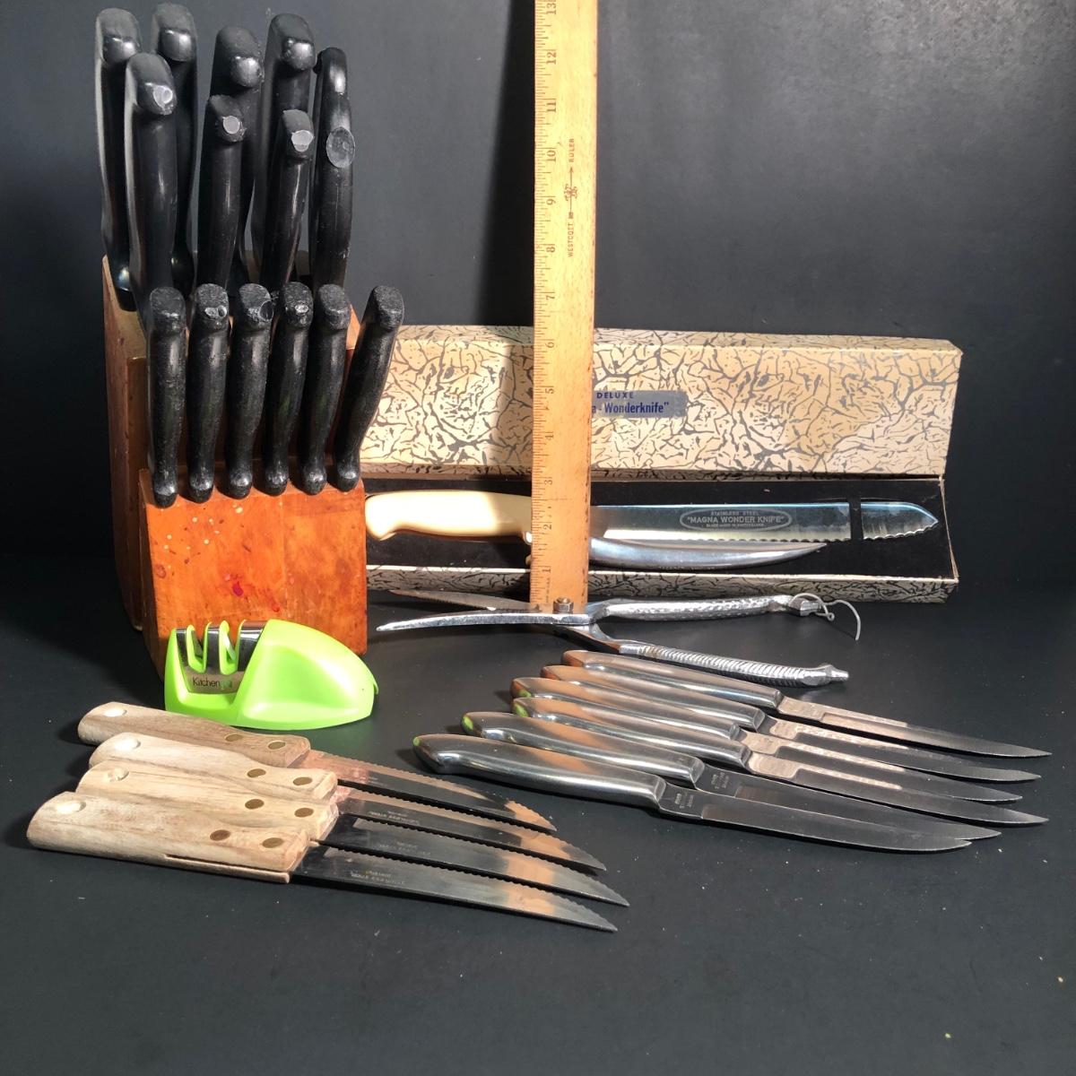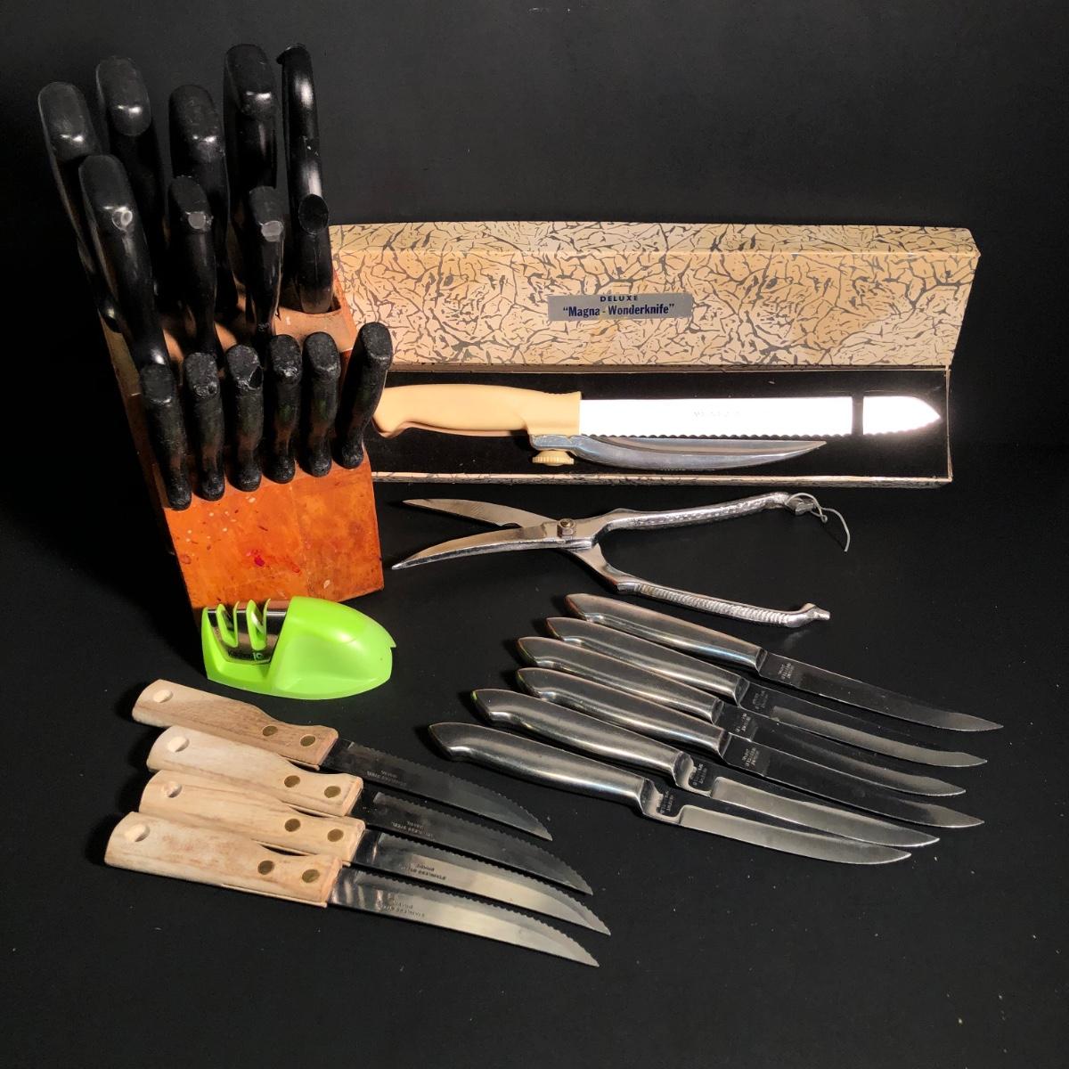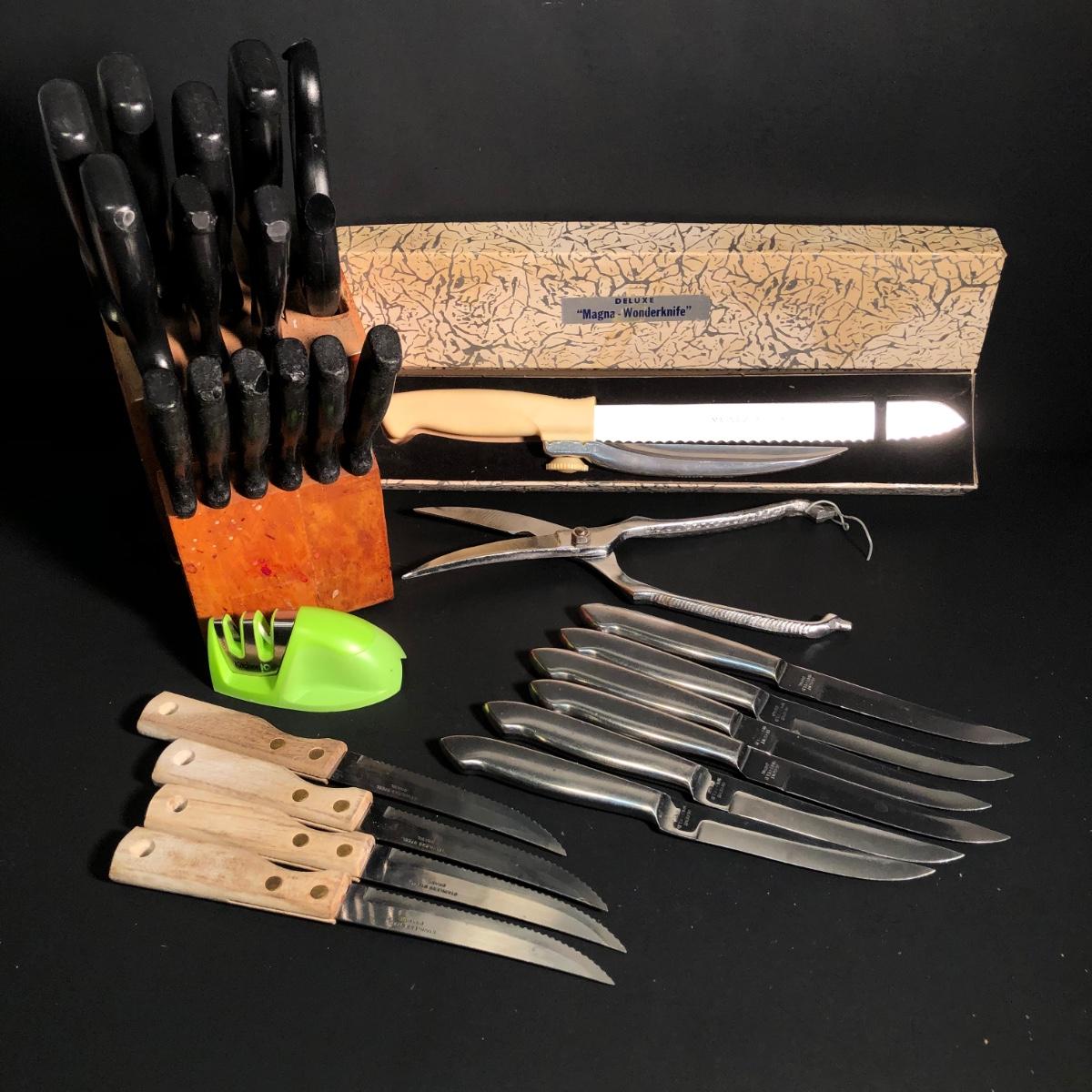 LOT 164L: Knife Collection - Stainless Steel Magna Wonder Knife in Box, Poultry Scissors, Knife Block, Black Knight Stainless Steel Steak Knives (6), Kitchen IQ Knife Sharpener & More