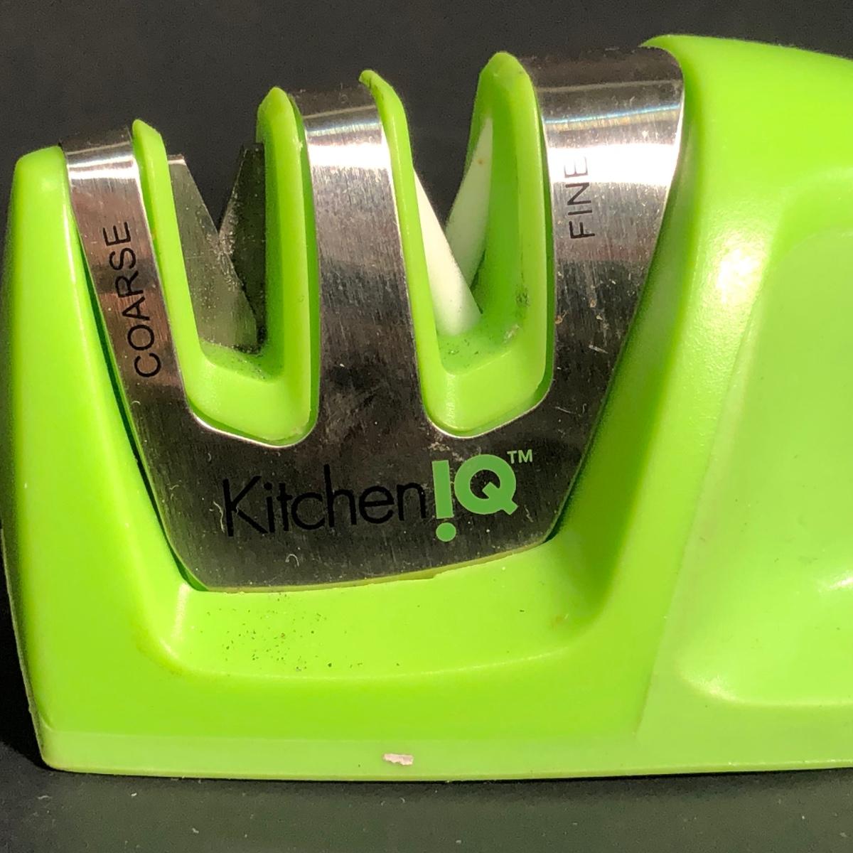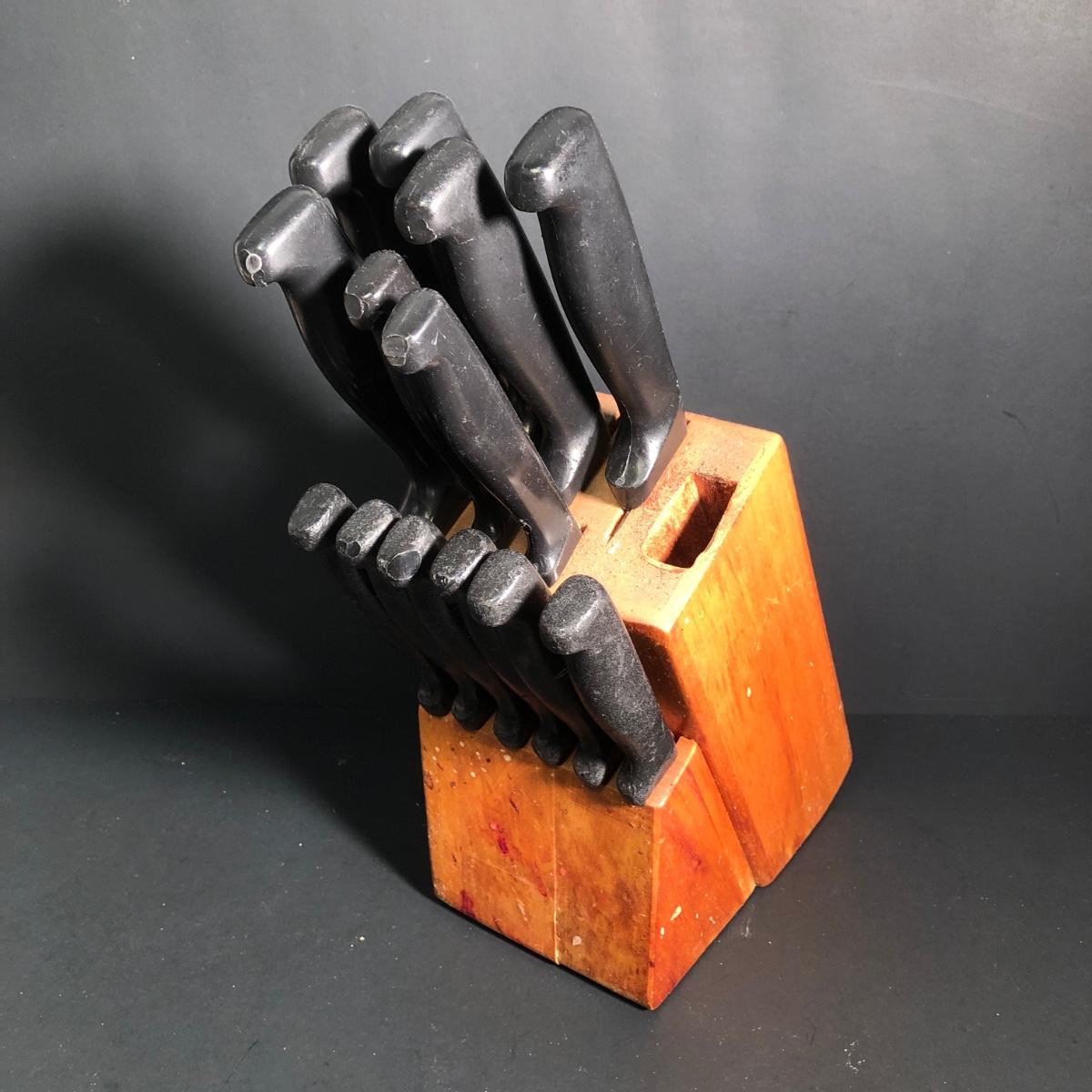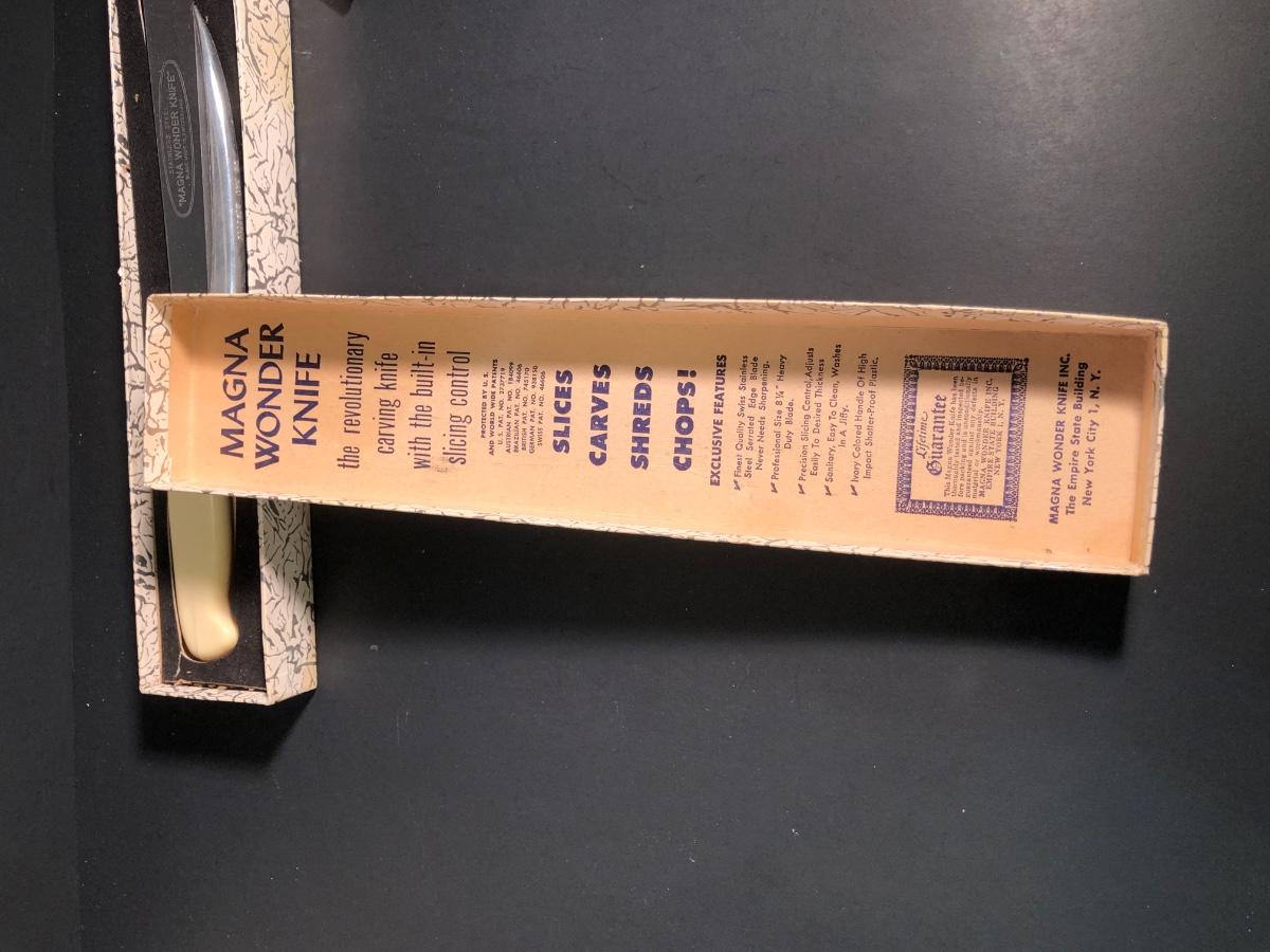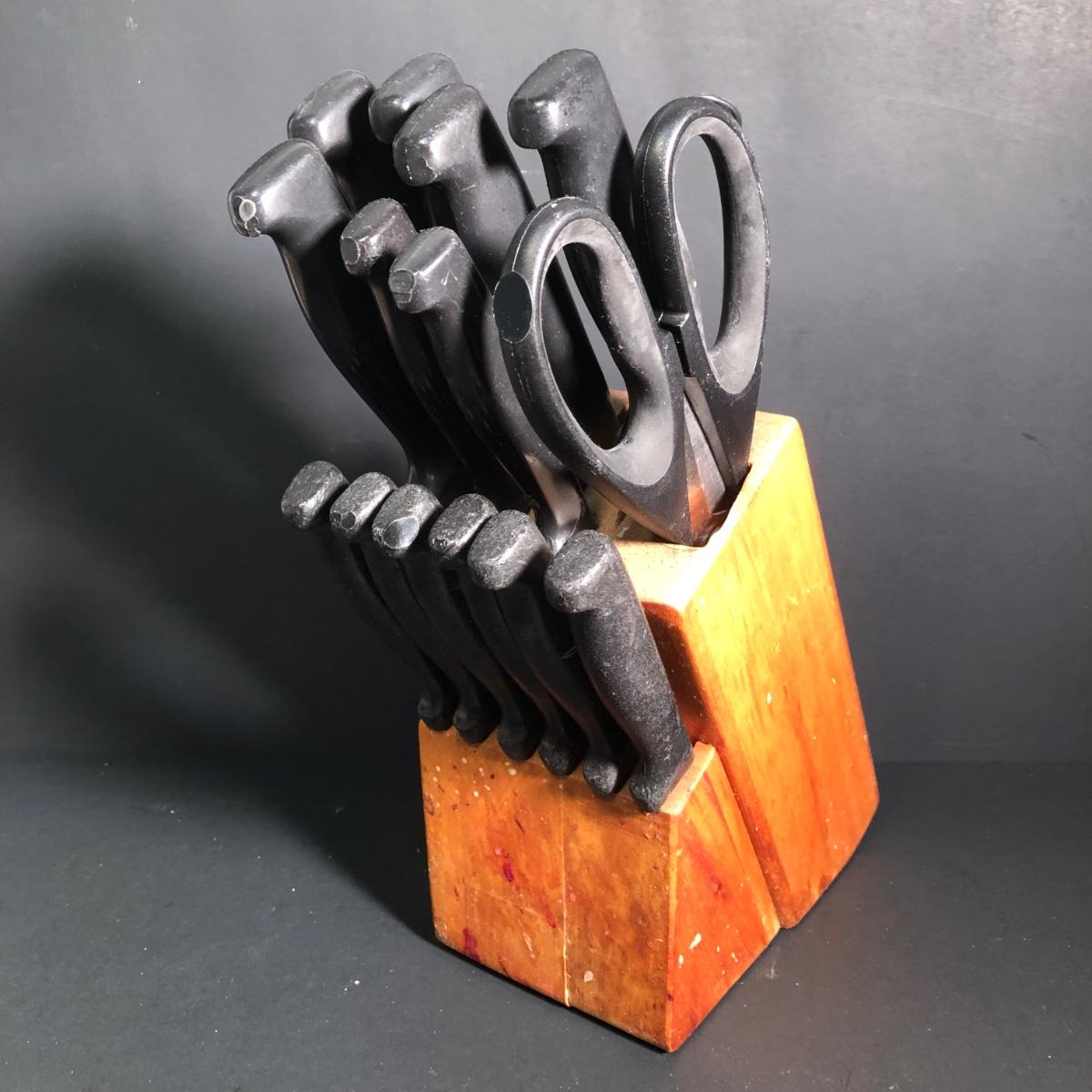LOT 164L: Knife Collection - Stainless Steel Magna Wonder Knife in Box, Poultry Scissors, Knife Block, Black Knight Stainless Steel Steak Knives (6), Kitchen IQ Knife Sharpener & More