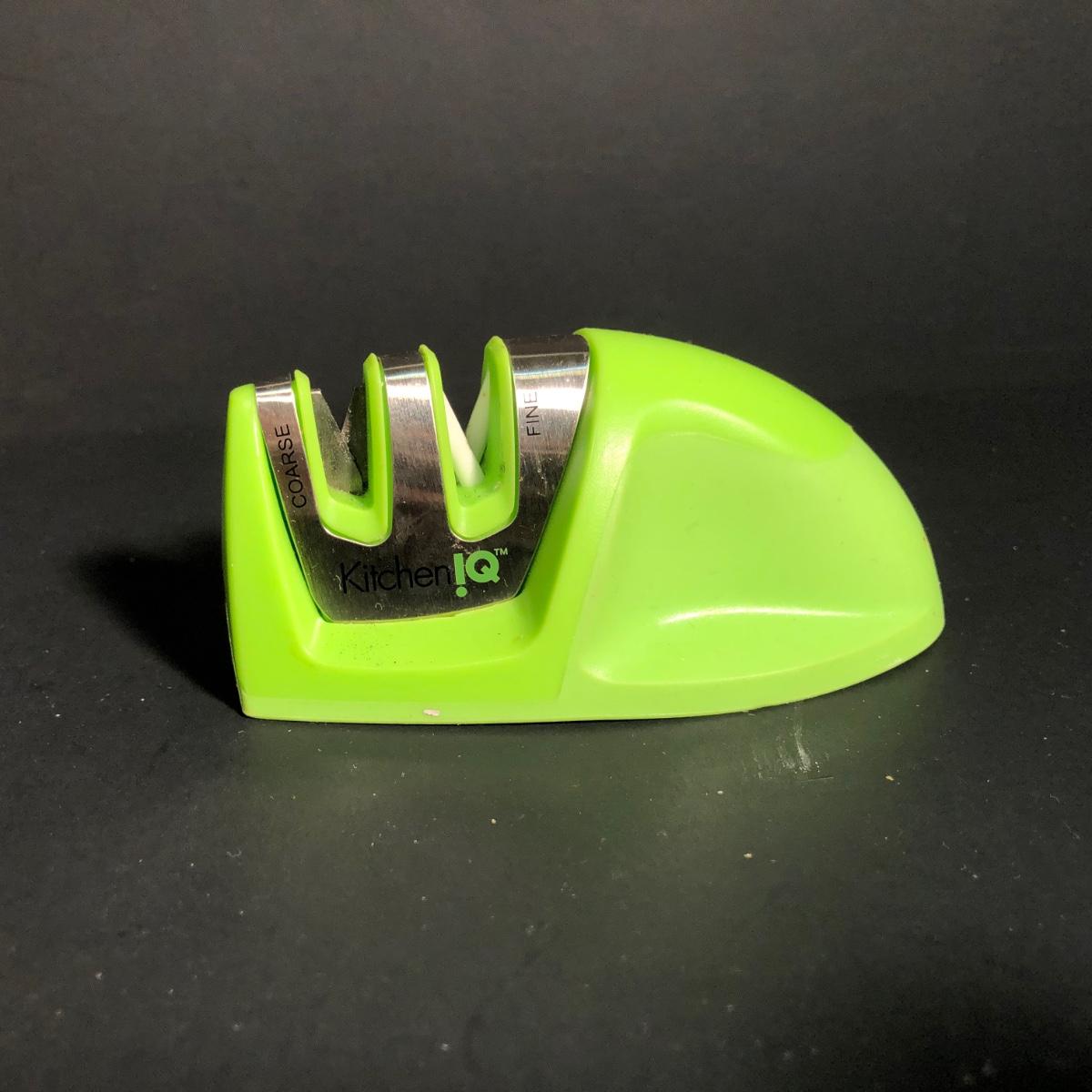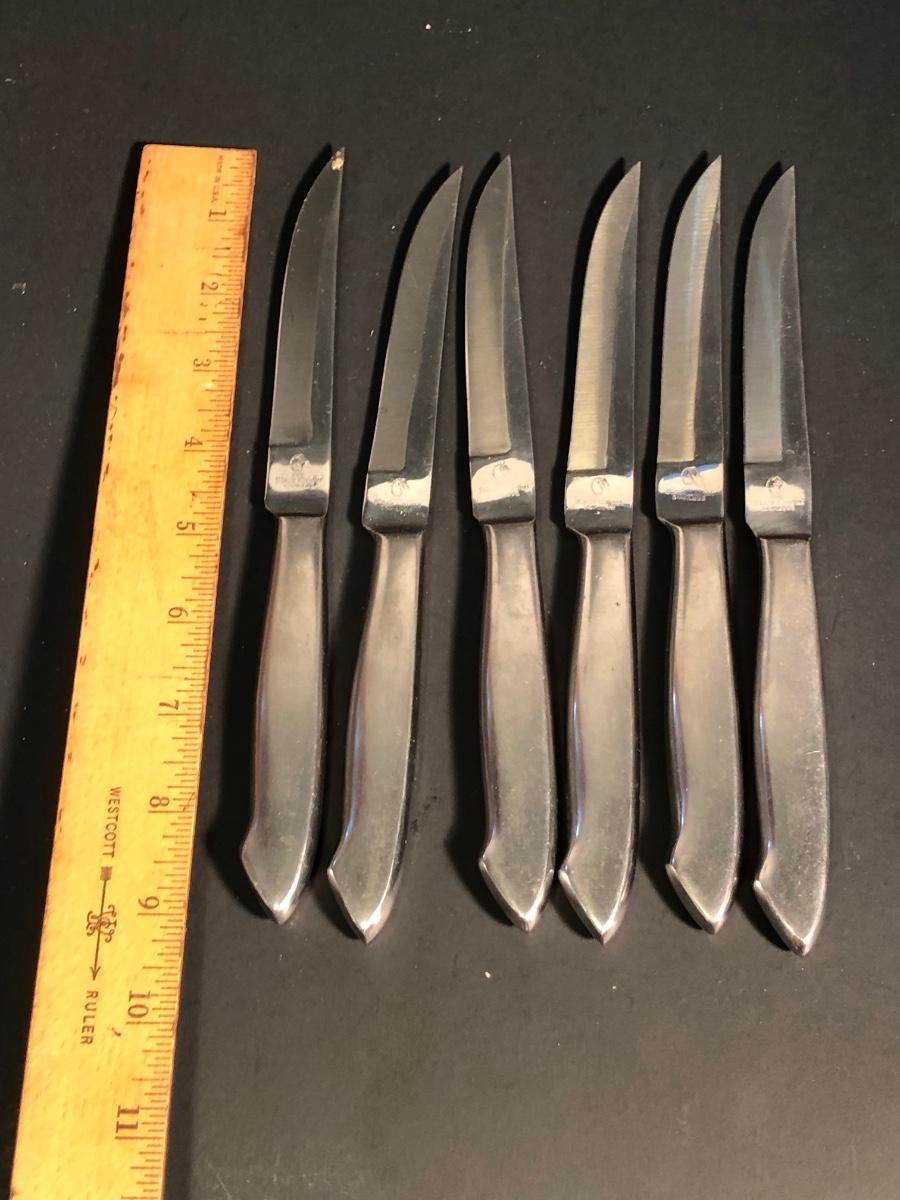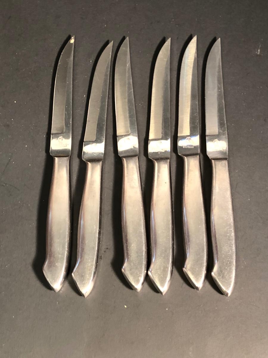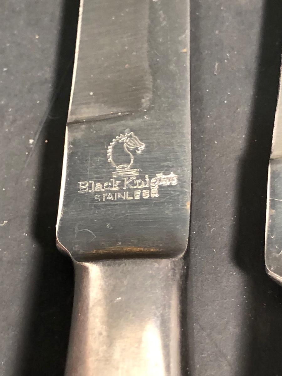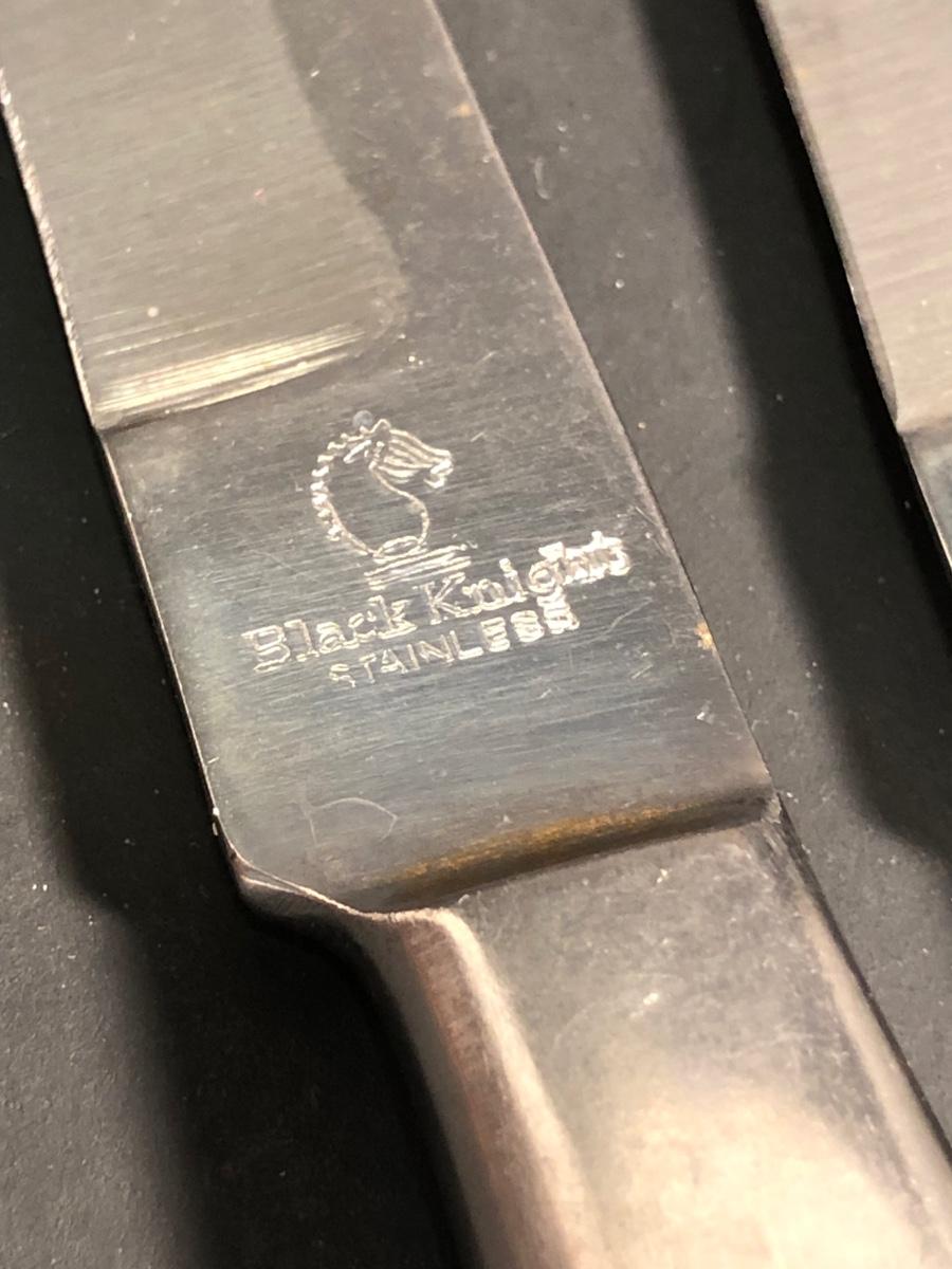 LOT 164L: Knife Collection - Stainless Steel Magna Wonder Knife in Box, Poultry Scissors, Knife Block, Black Knight Stainless Steel Steak Knives (6), Kitchen IQ Knife Sharpener & More