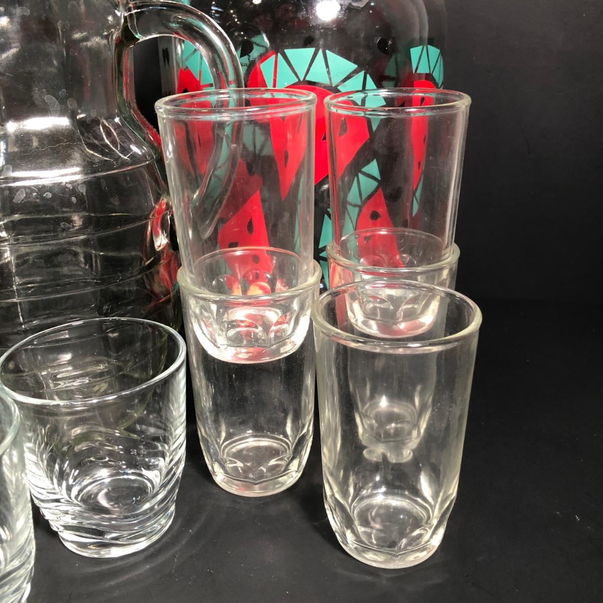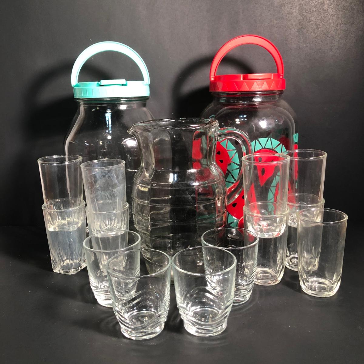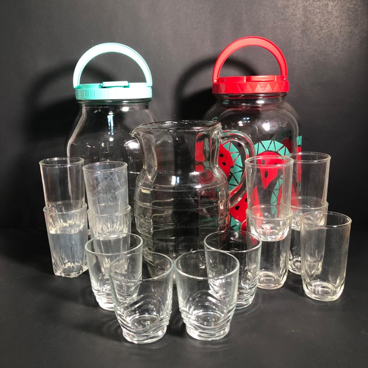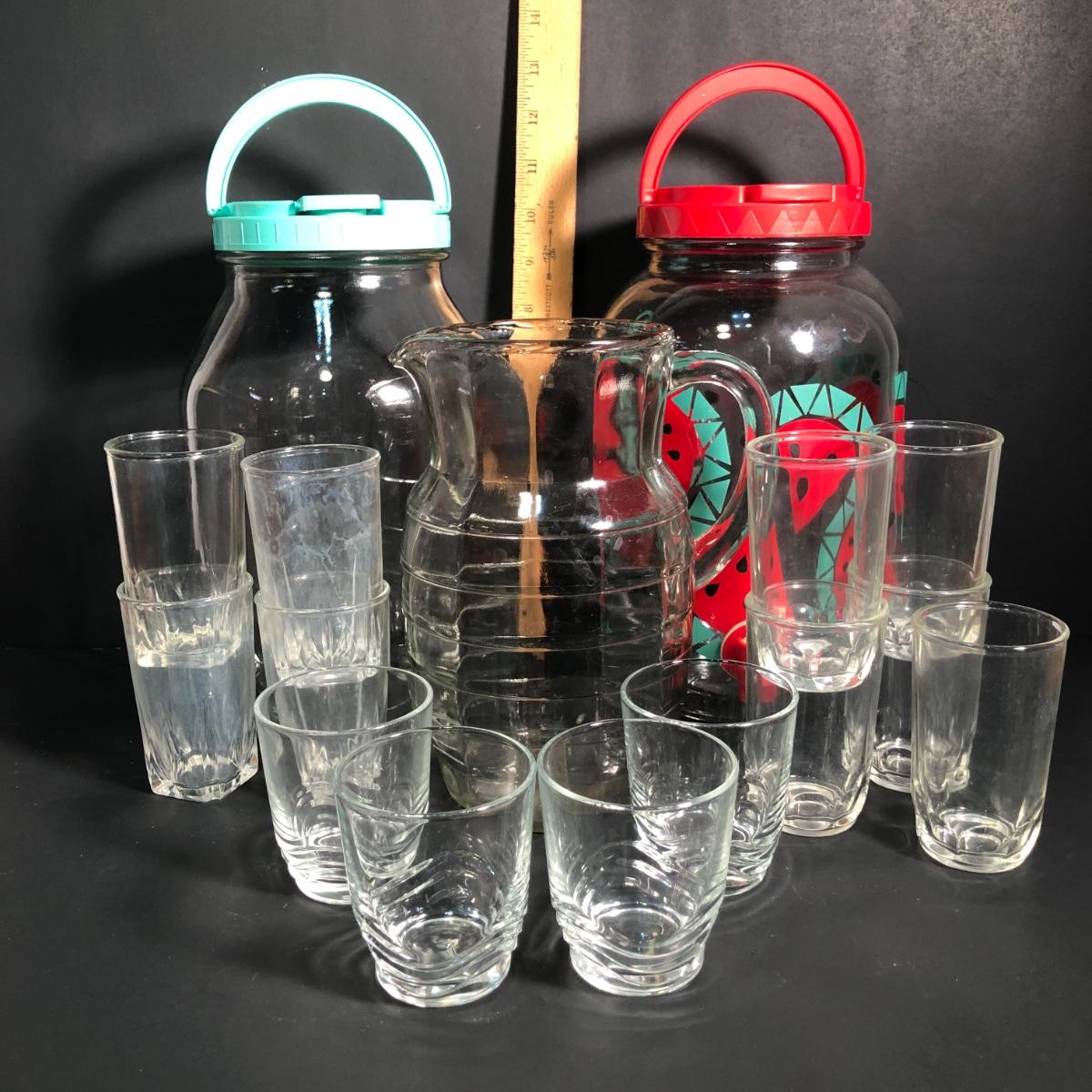 LOT 167L: Glass Watermelon Jug w/ Spout, Glass Jug w/ Plastic Handle, Glass Pitcher & Juice Glasses