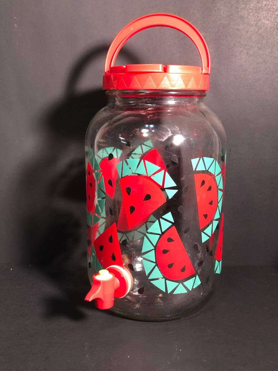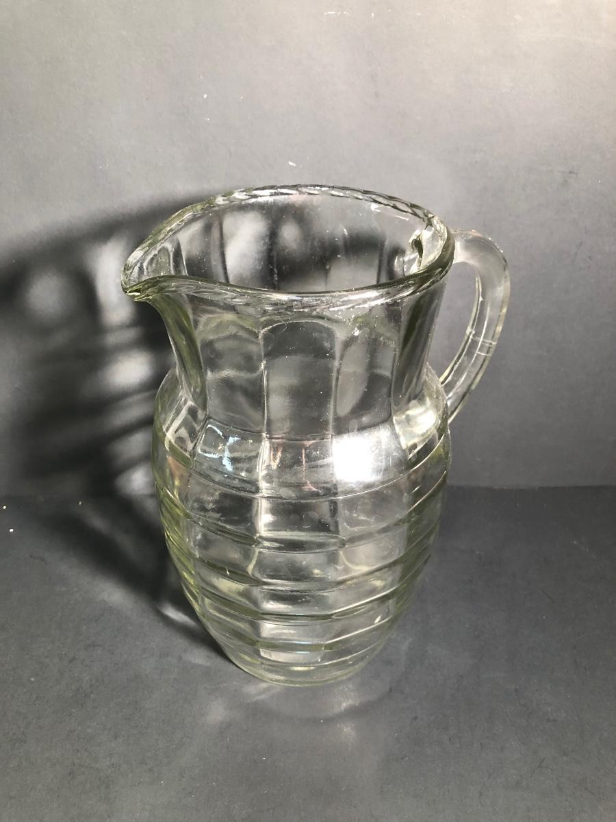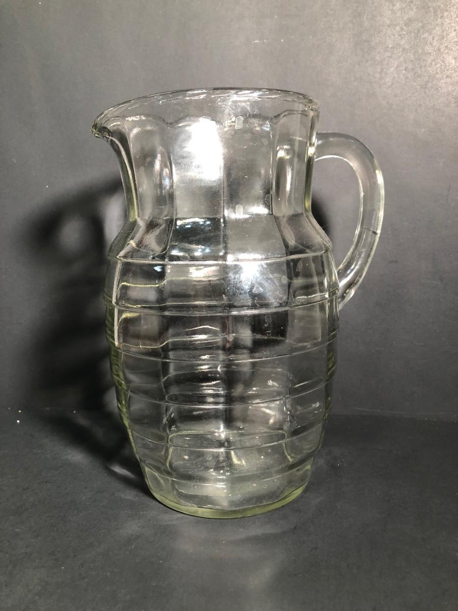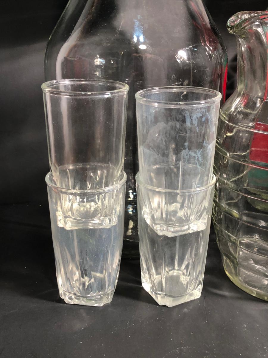 LOT 167L: Glass Watermelon Jug w/ Spout, Glass Jug w/ Plastic Handle, Glass Pitcher & Juice Glasses