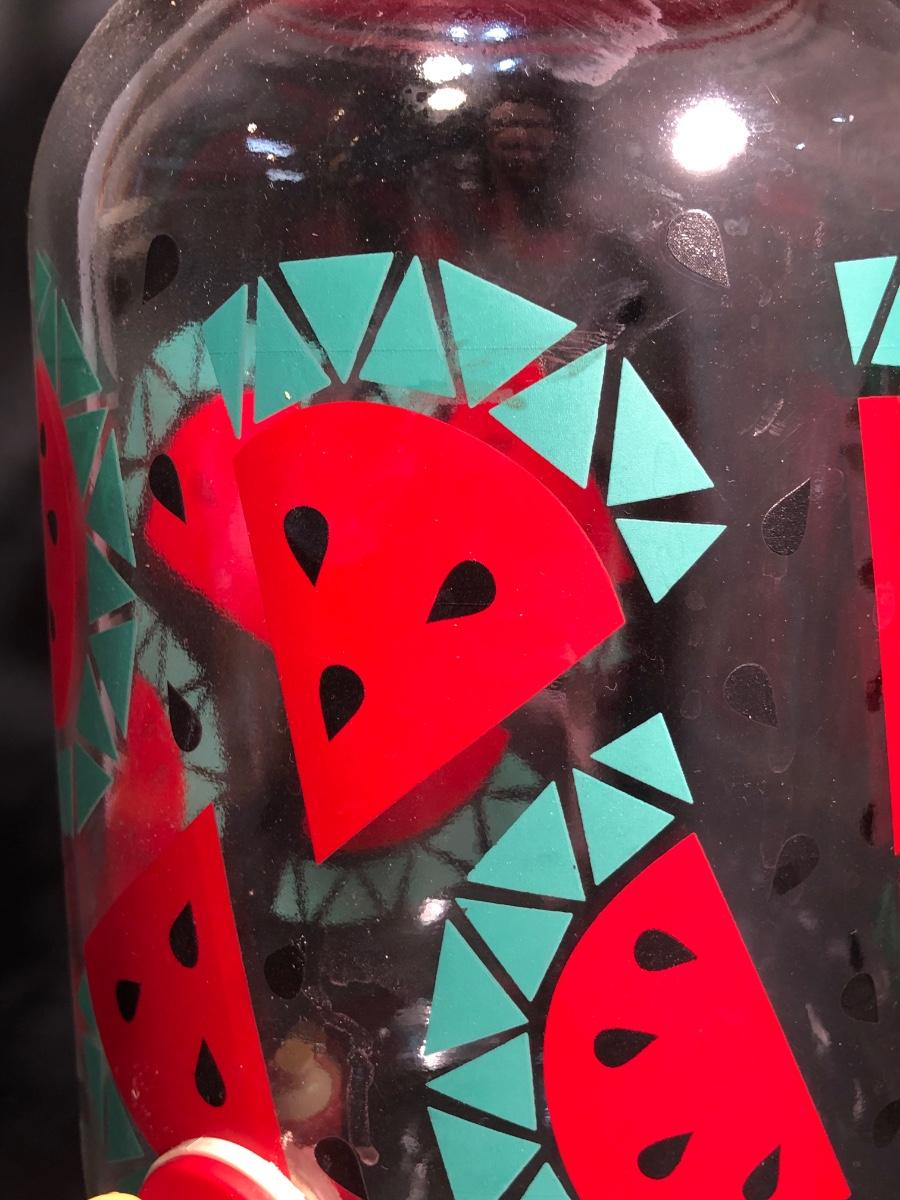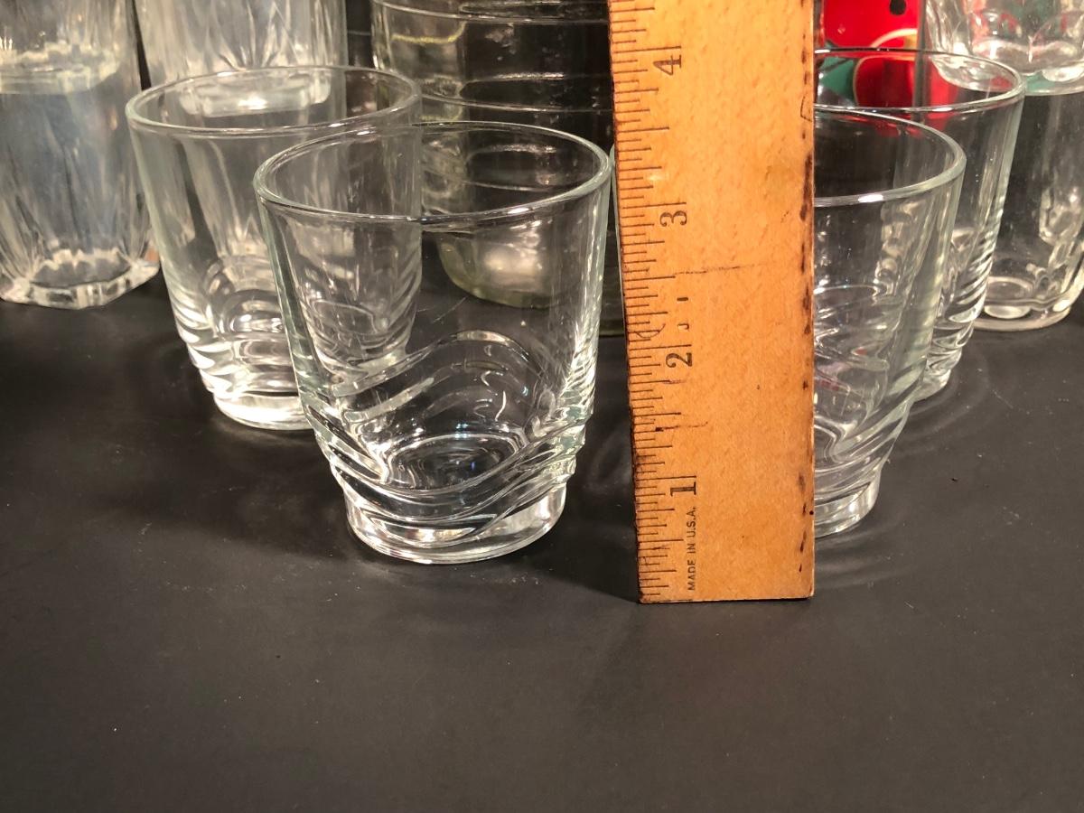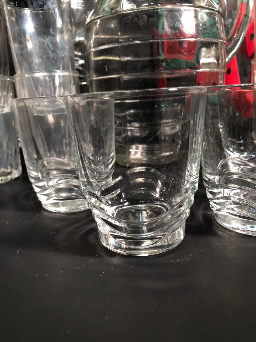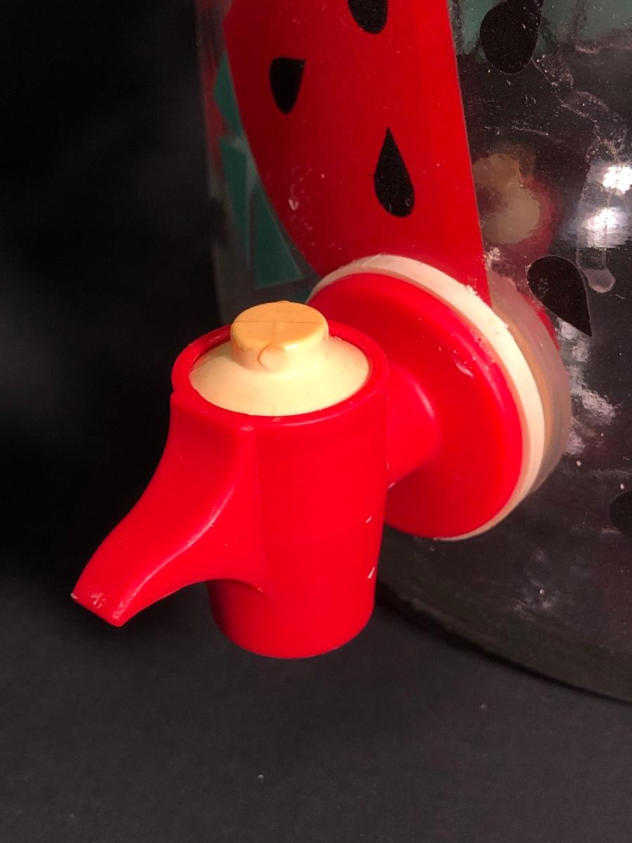 LOT 167L: Glass Watermelon Jug w/ Spout, Glass Jug w/ Plastic Handle, Glass Pitcher & Juice Glasses