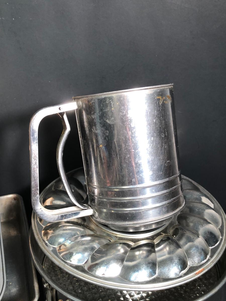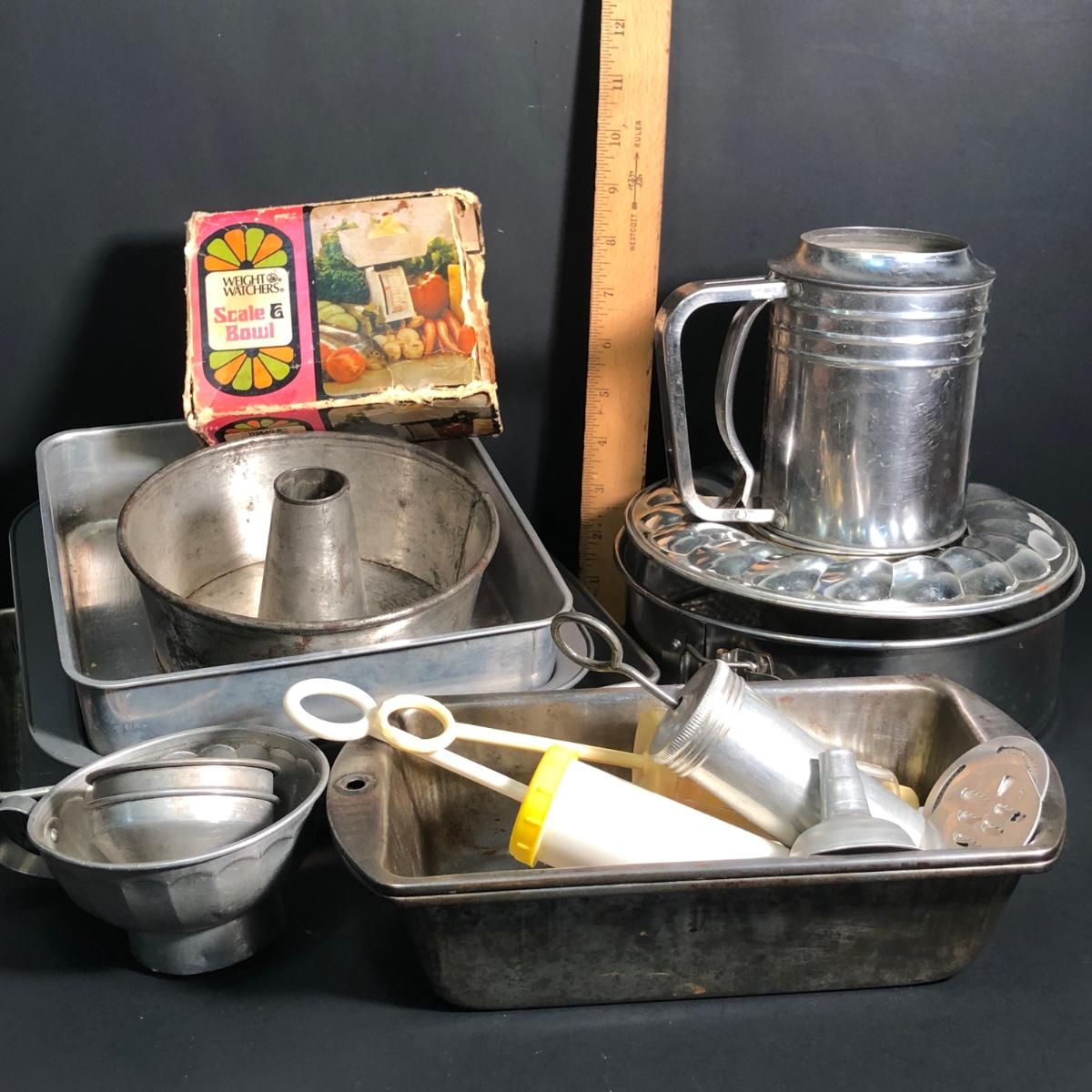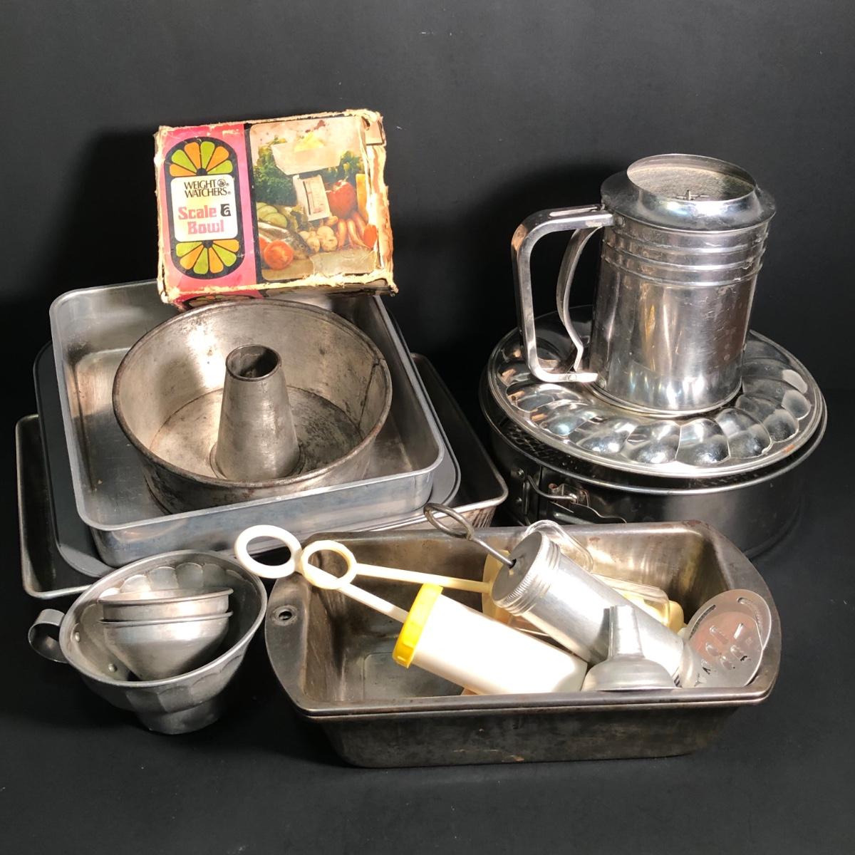 LOT 169K: Vintage Baking Collection - Sifter, Cake Pans, Weight Watchers Kitchen Scale & More