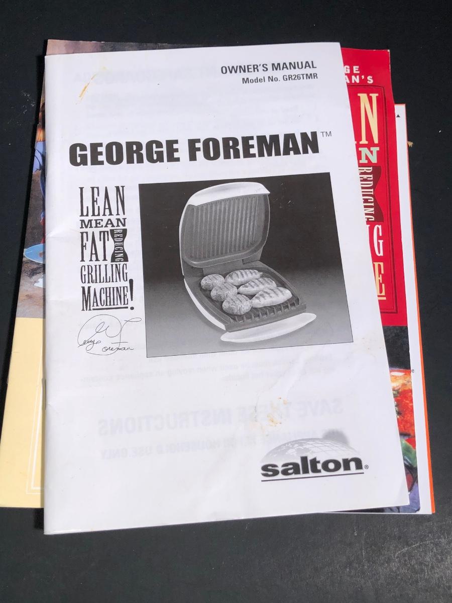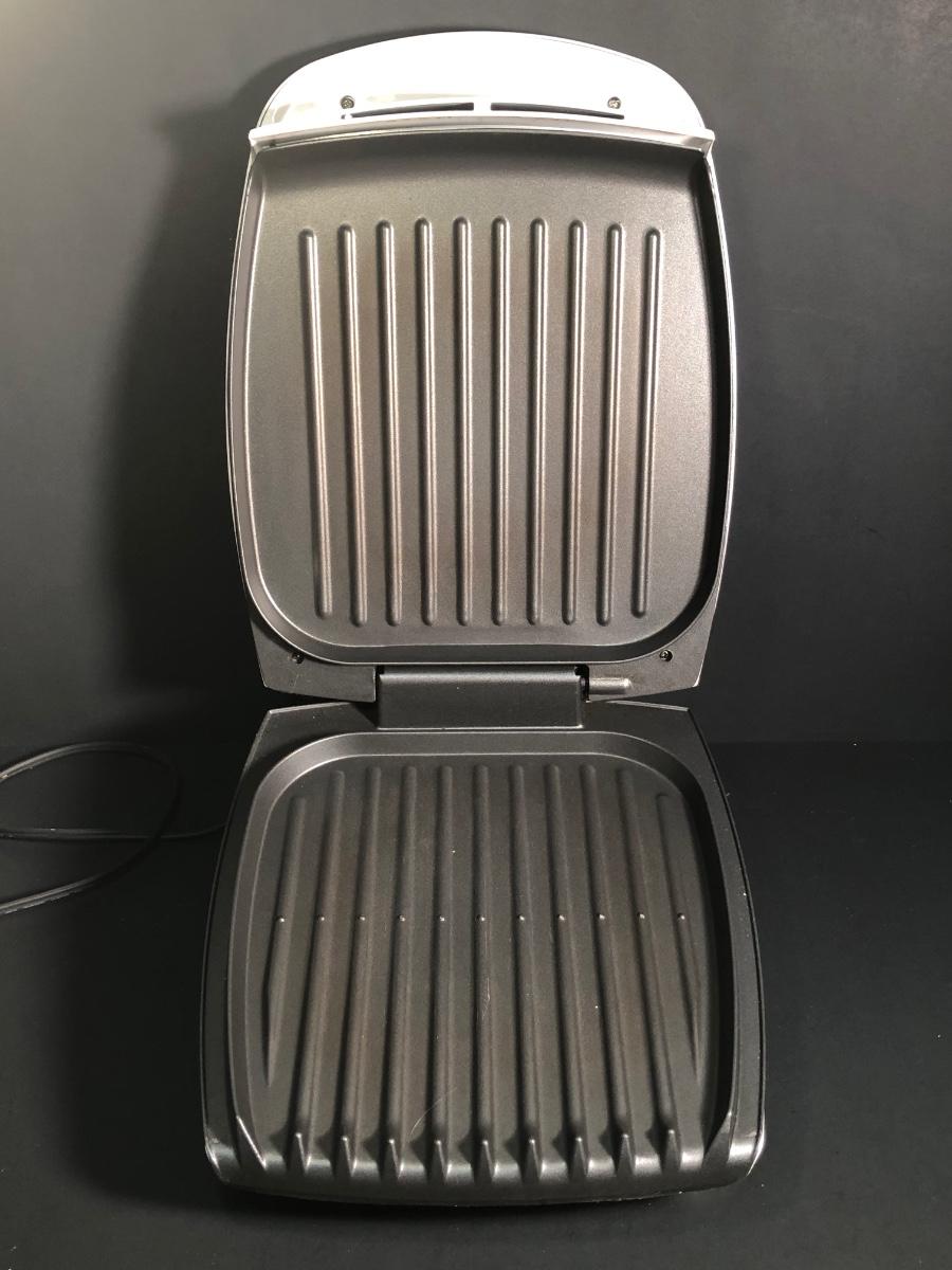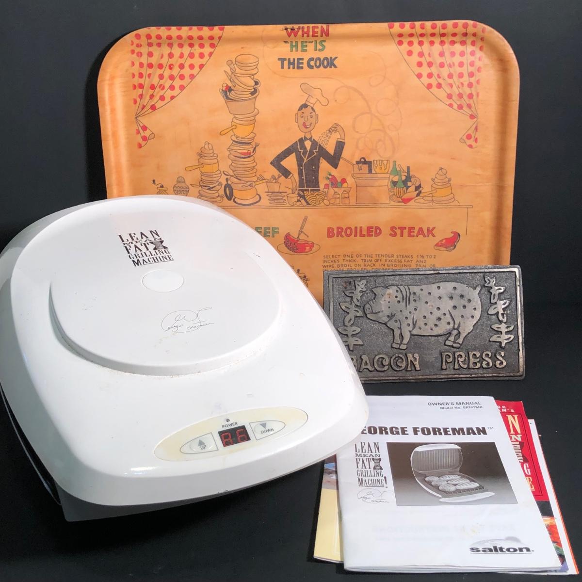 LOT 170K: Meat Lover's Collection - George Foreman Grilling Machine Model GR26TMR, Cast Iron Bacon Press & Decor Tray