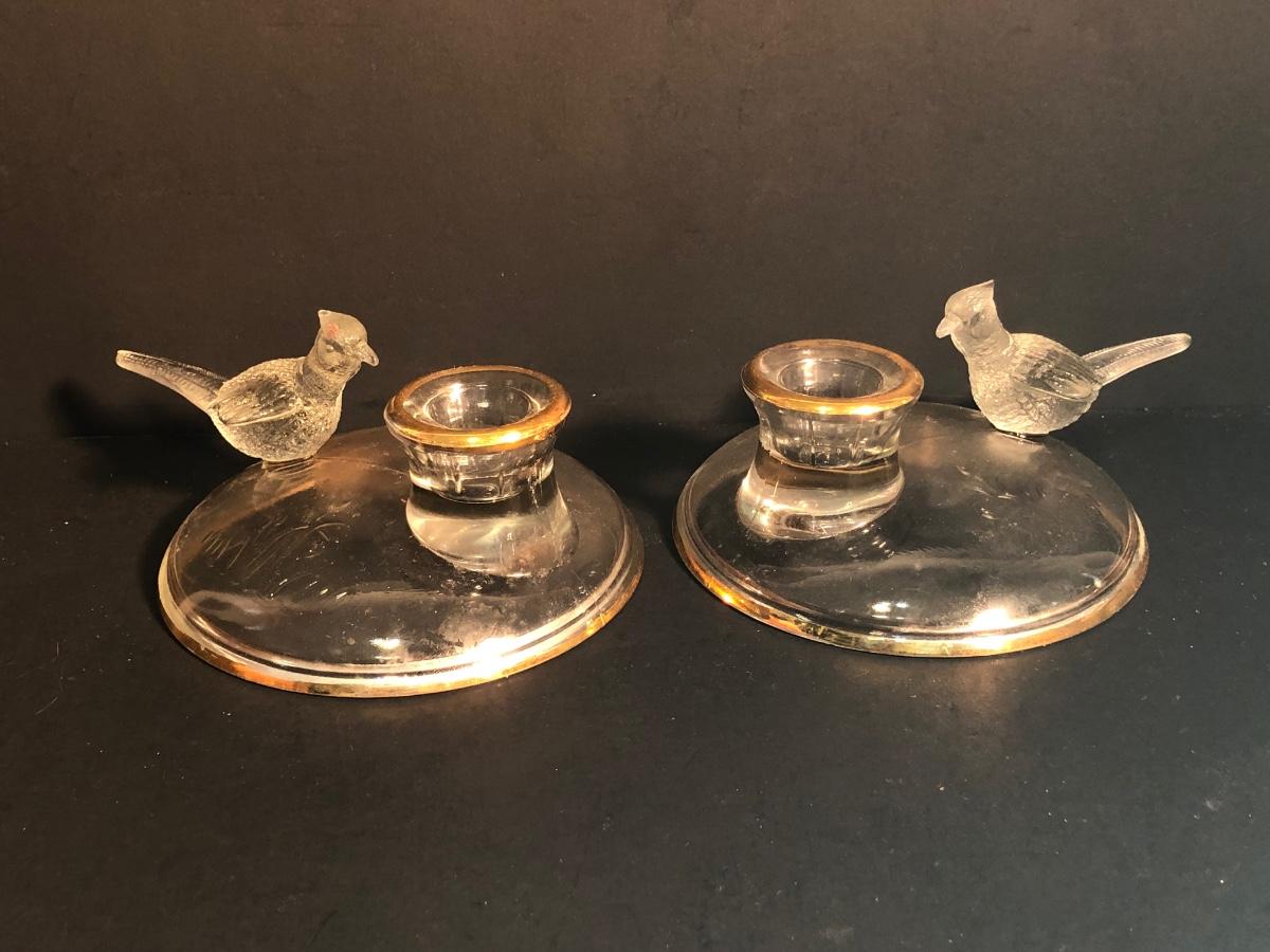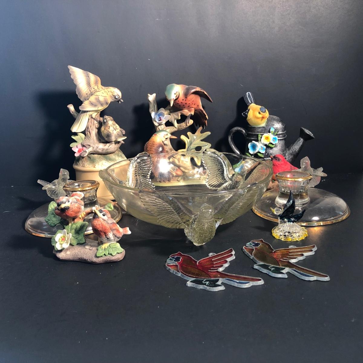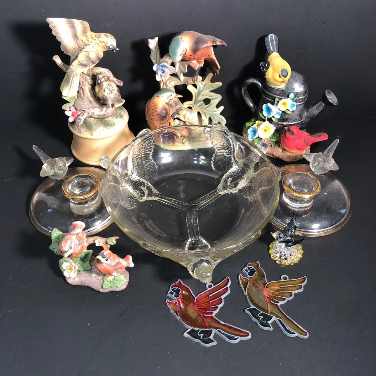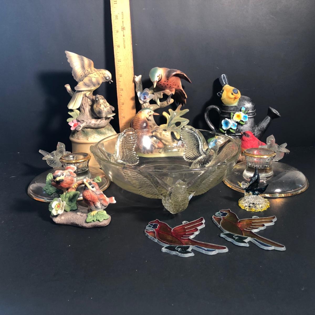 LOT 186L: Bird Porcelain Figurines, Crystal Sculpture & Glass Bowl w/ Candle Holders