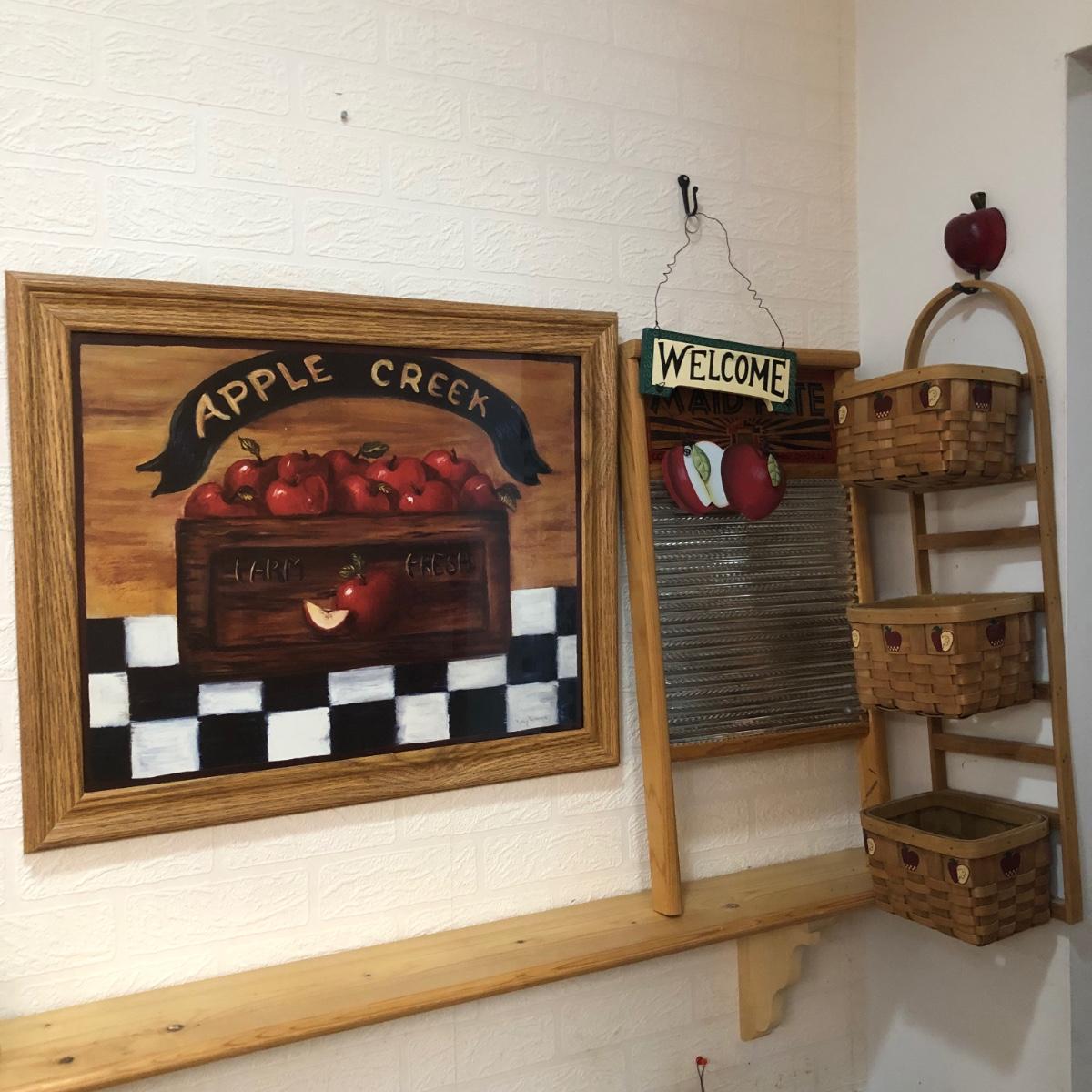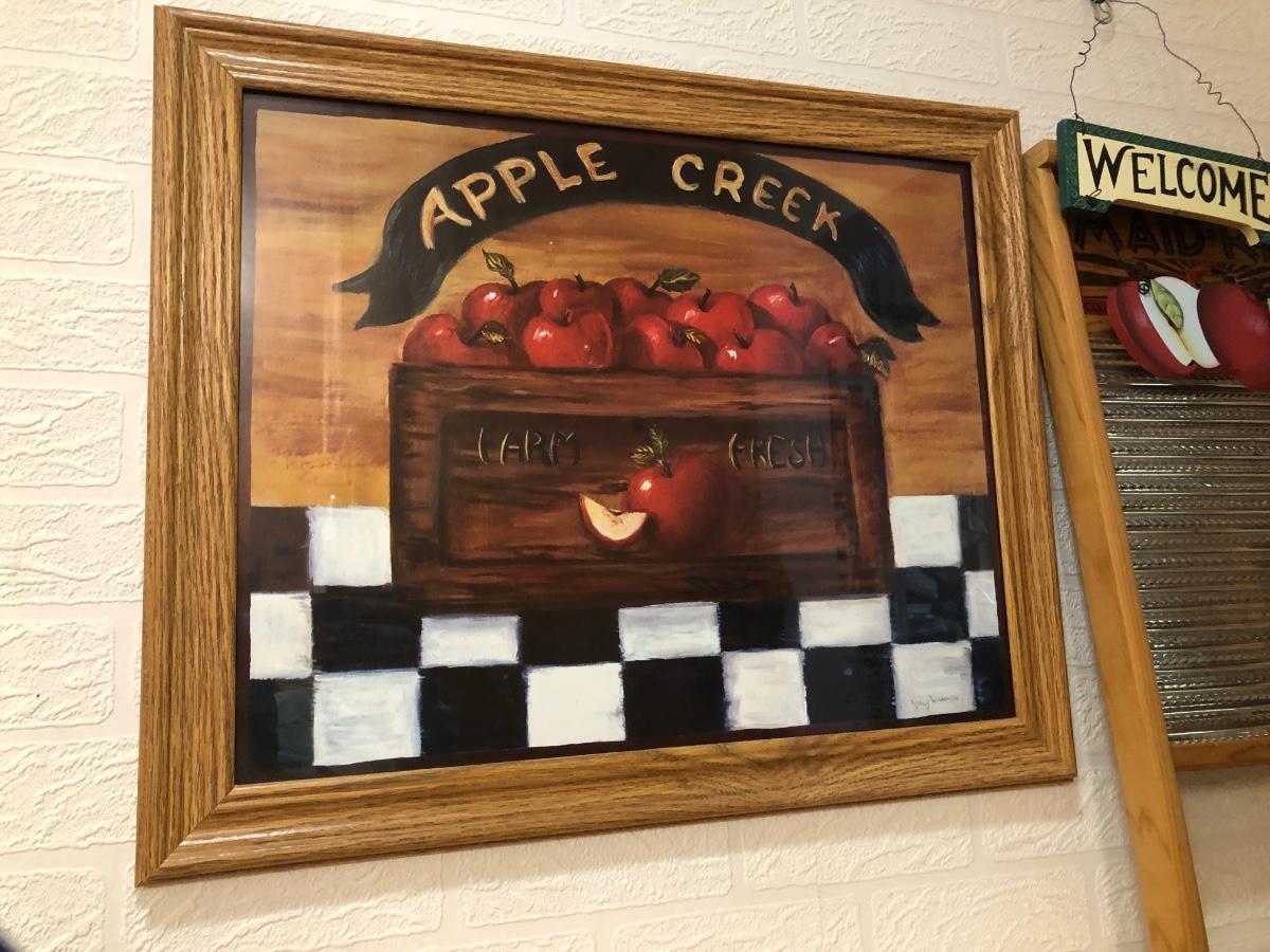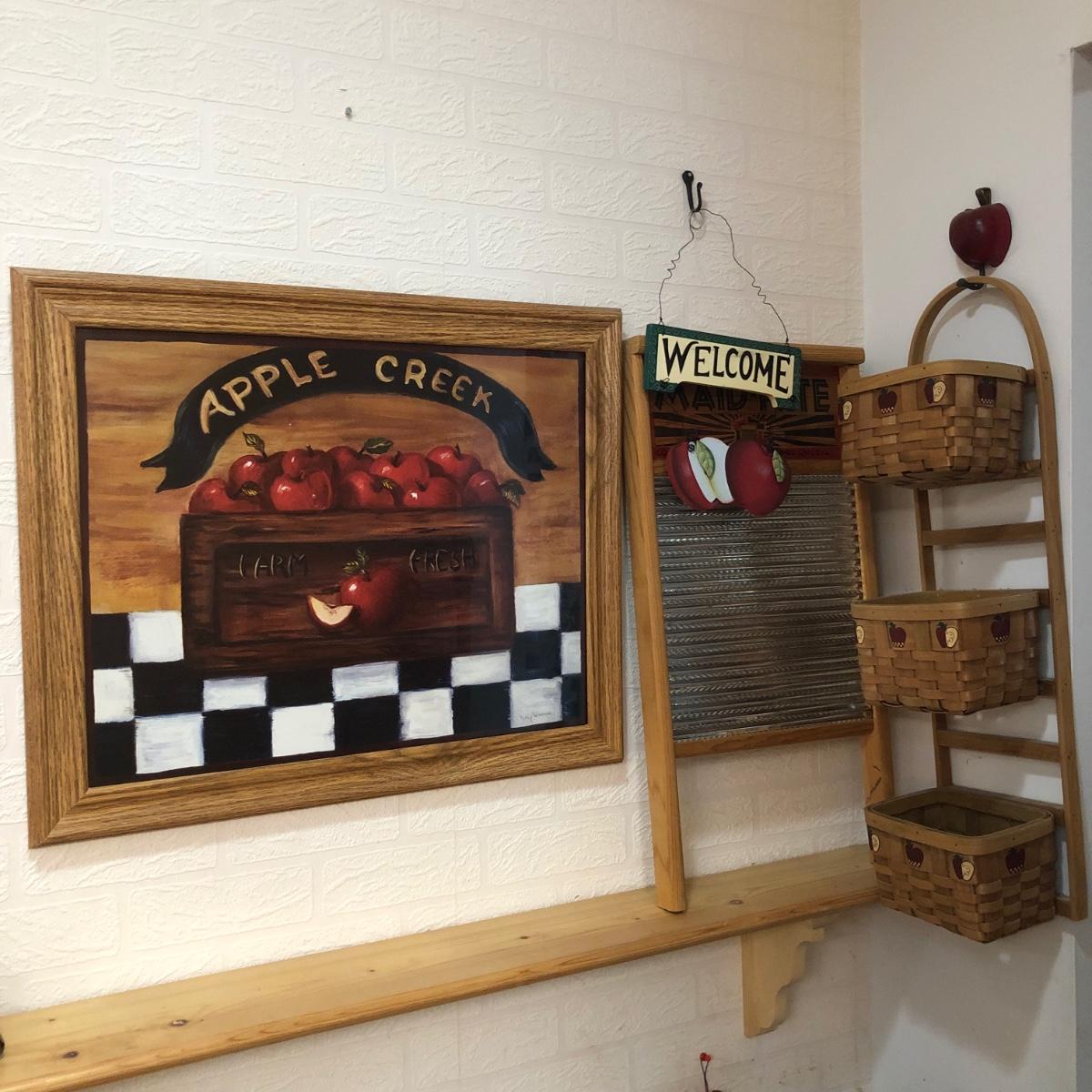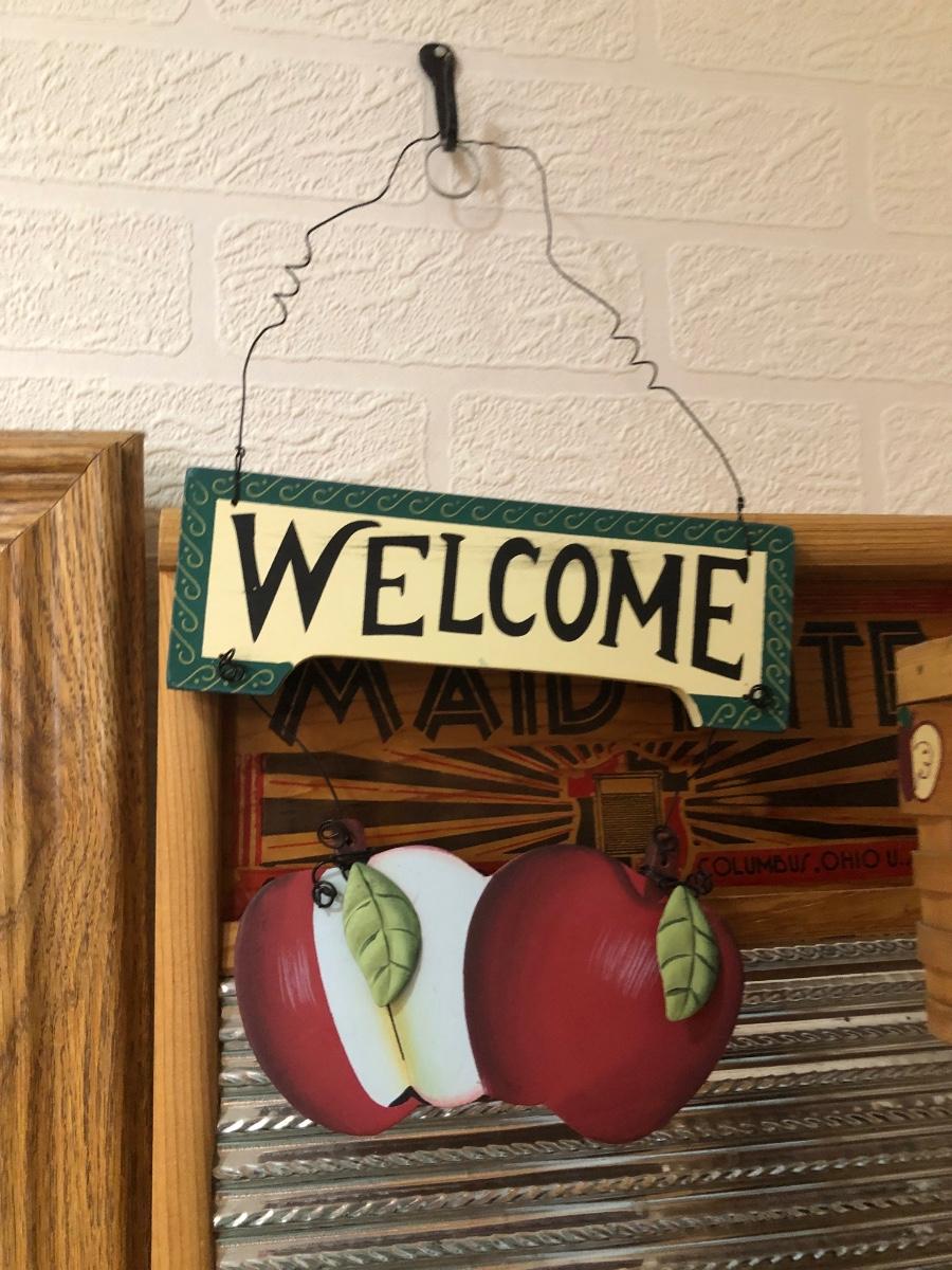 LOT 243K: Framed "Apple Creek" Print, Maid-Rite Washboard, Wooden Welcome Sign & Apple Wall Baskets
