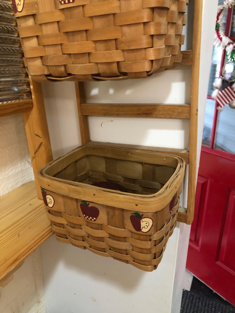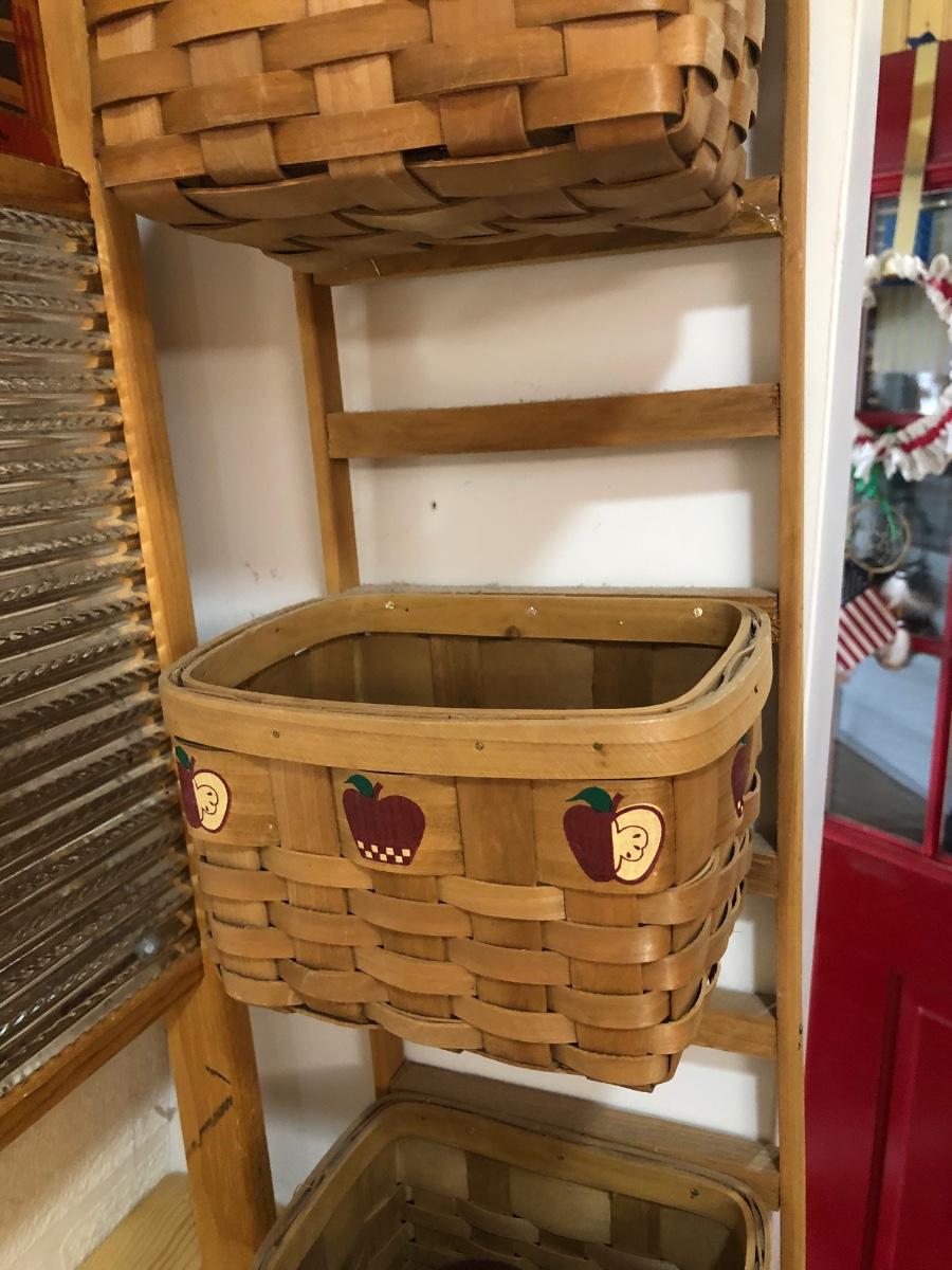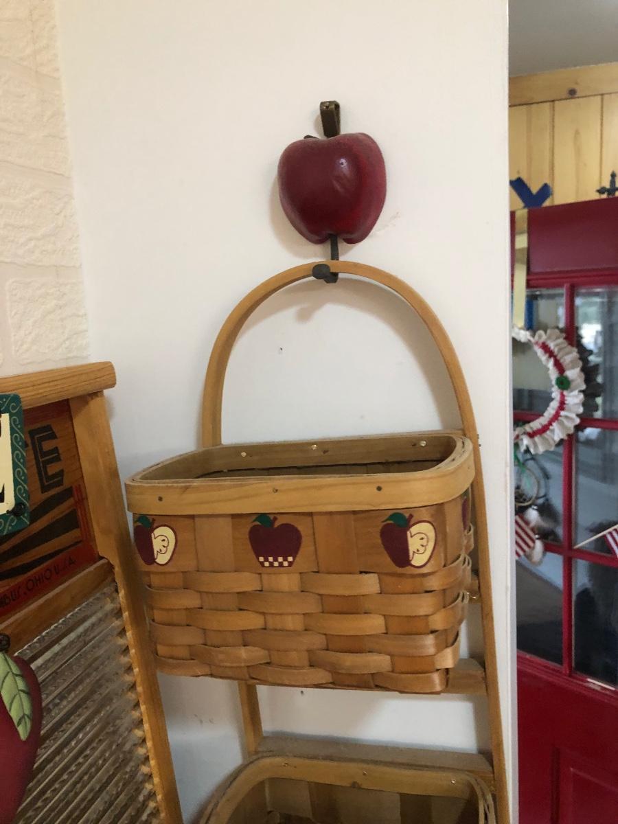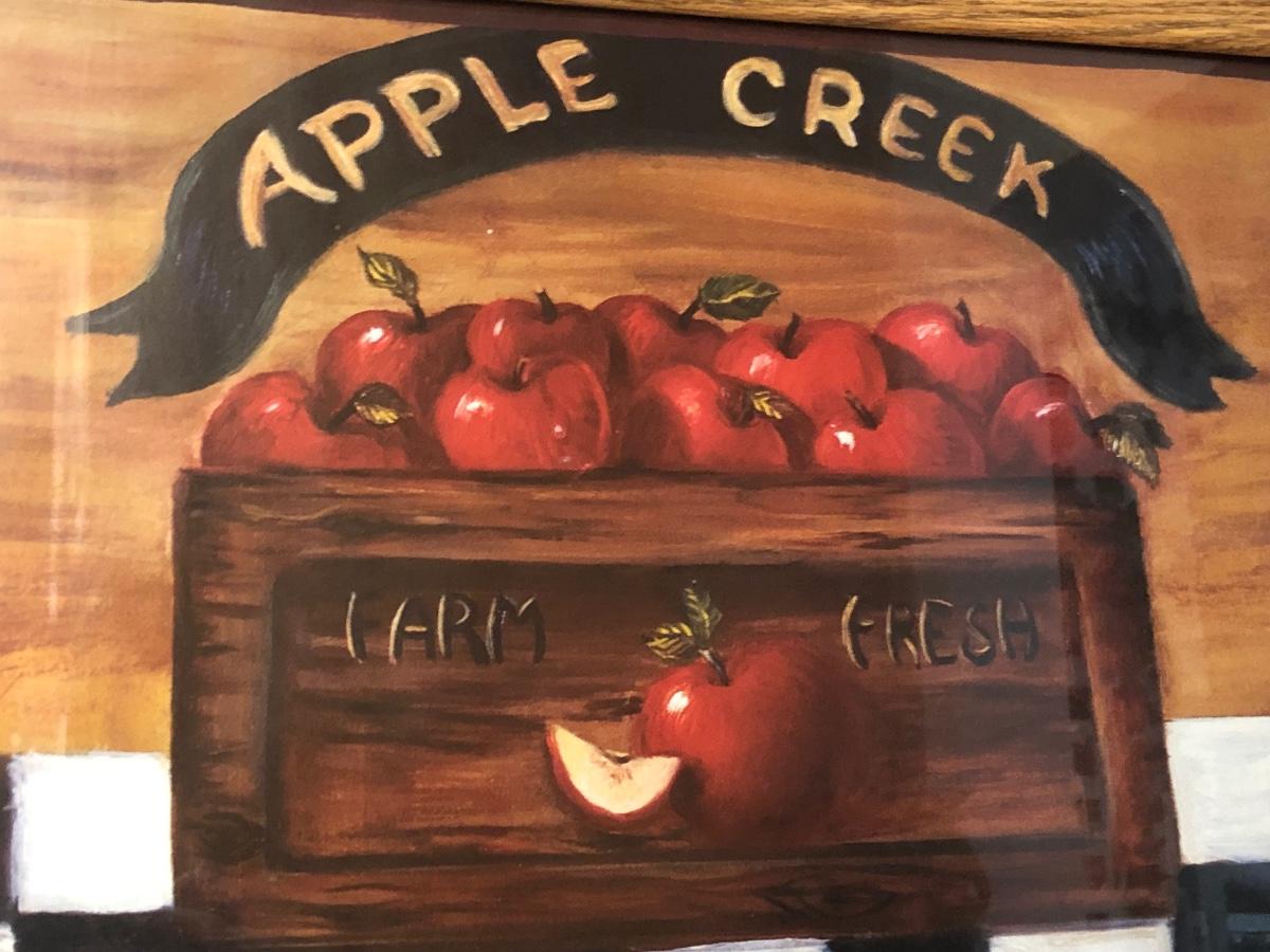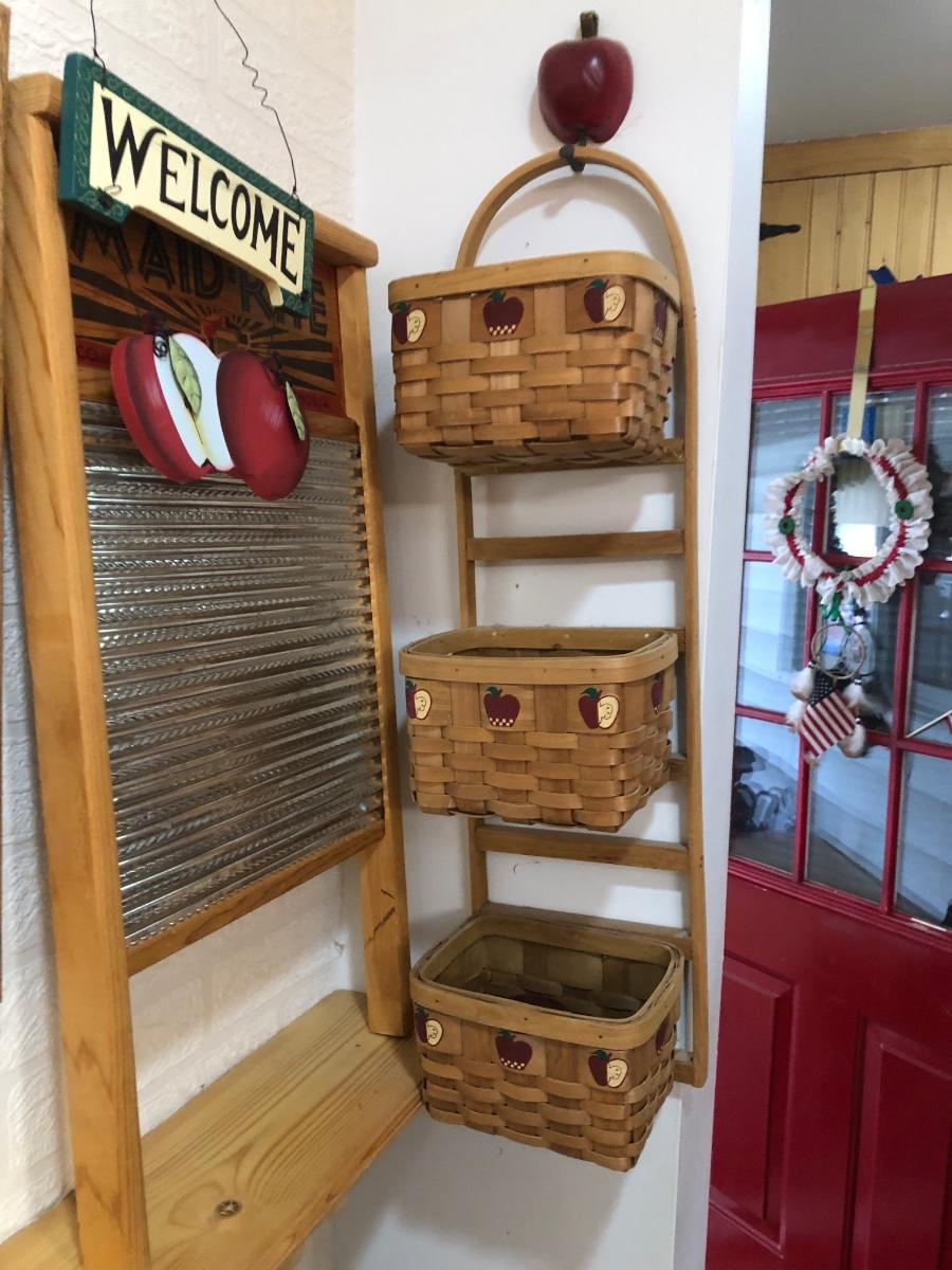 LOT 243K: Framed "Apple Creek" Print, Maid-Rite Washboard, Wooden Welcome Sign & Apple Wall Baskets