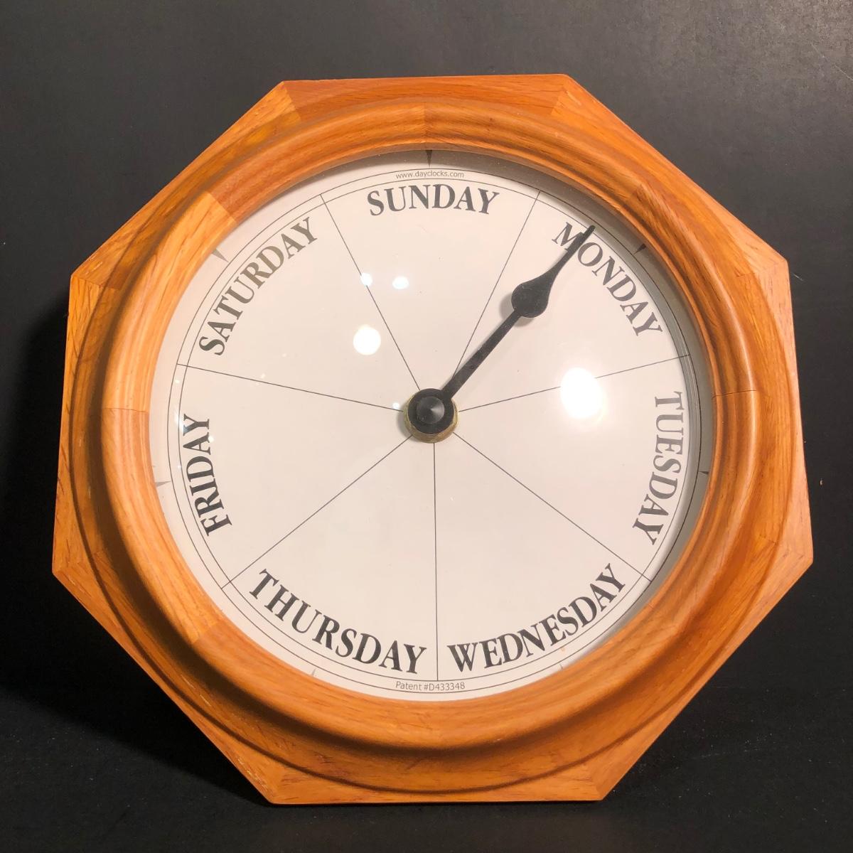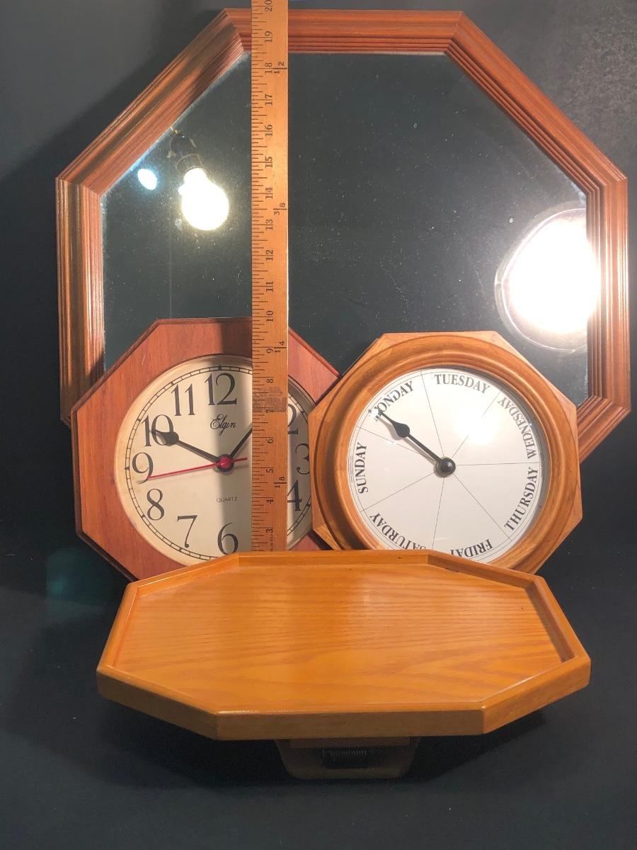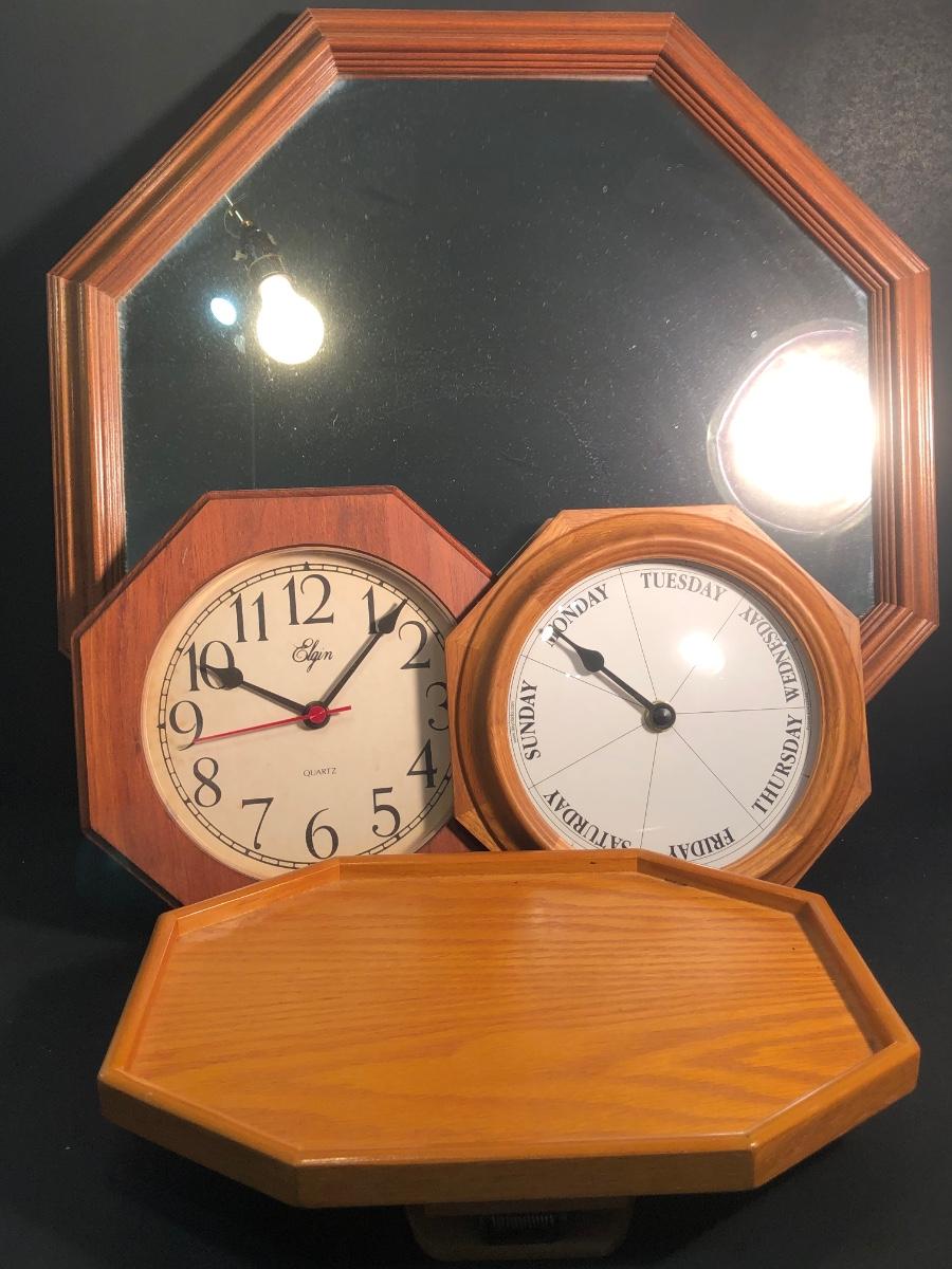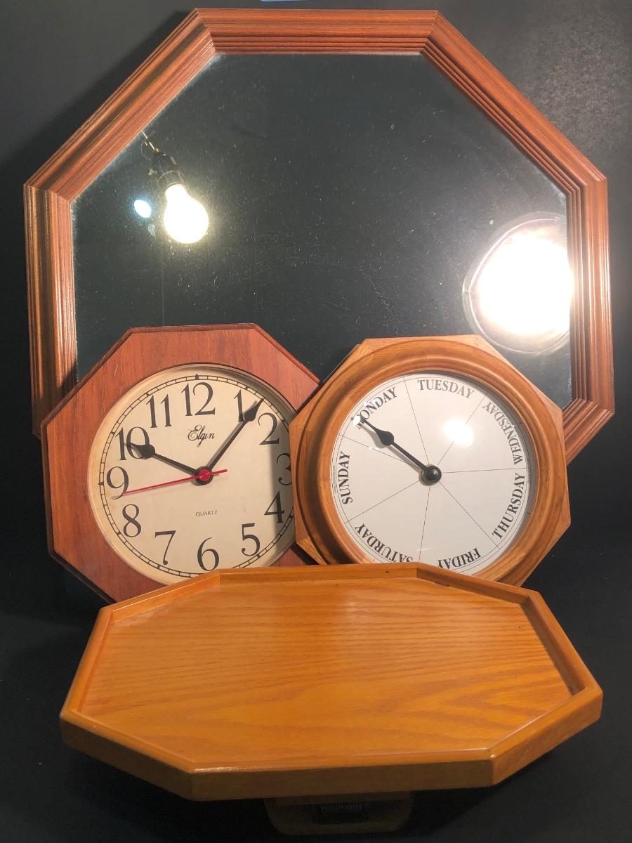 LOT 245L: Octagon Collection - Wall Mirror, Elgin Quartz Clock, Days of the Week Clock & Wooden Tray for Couch Arms
