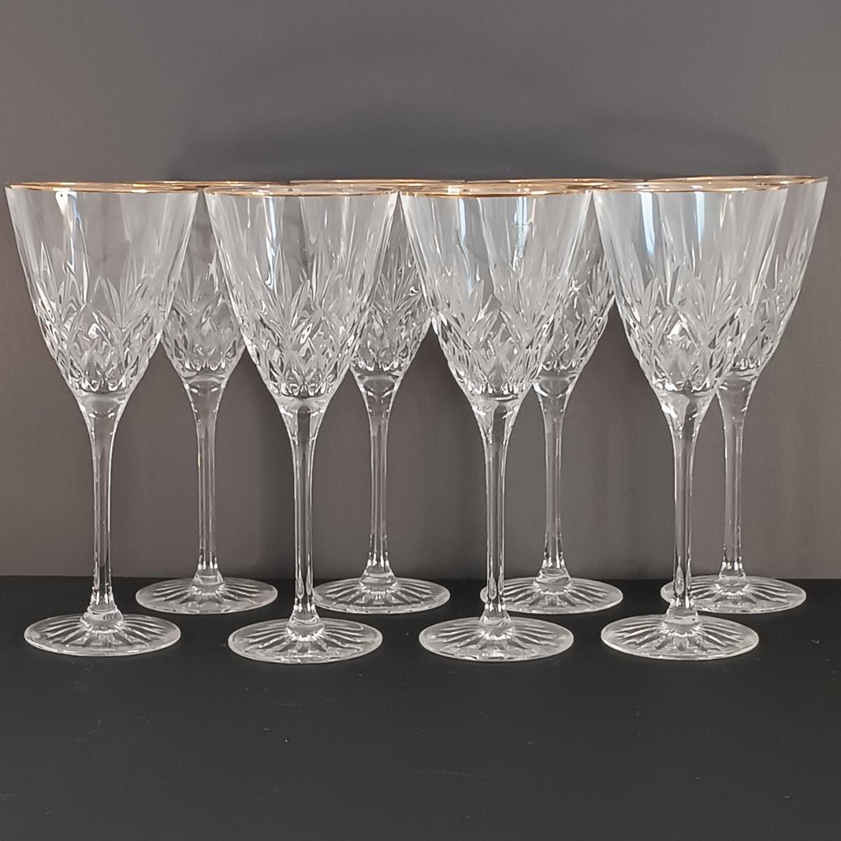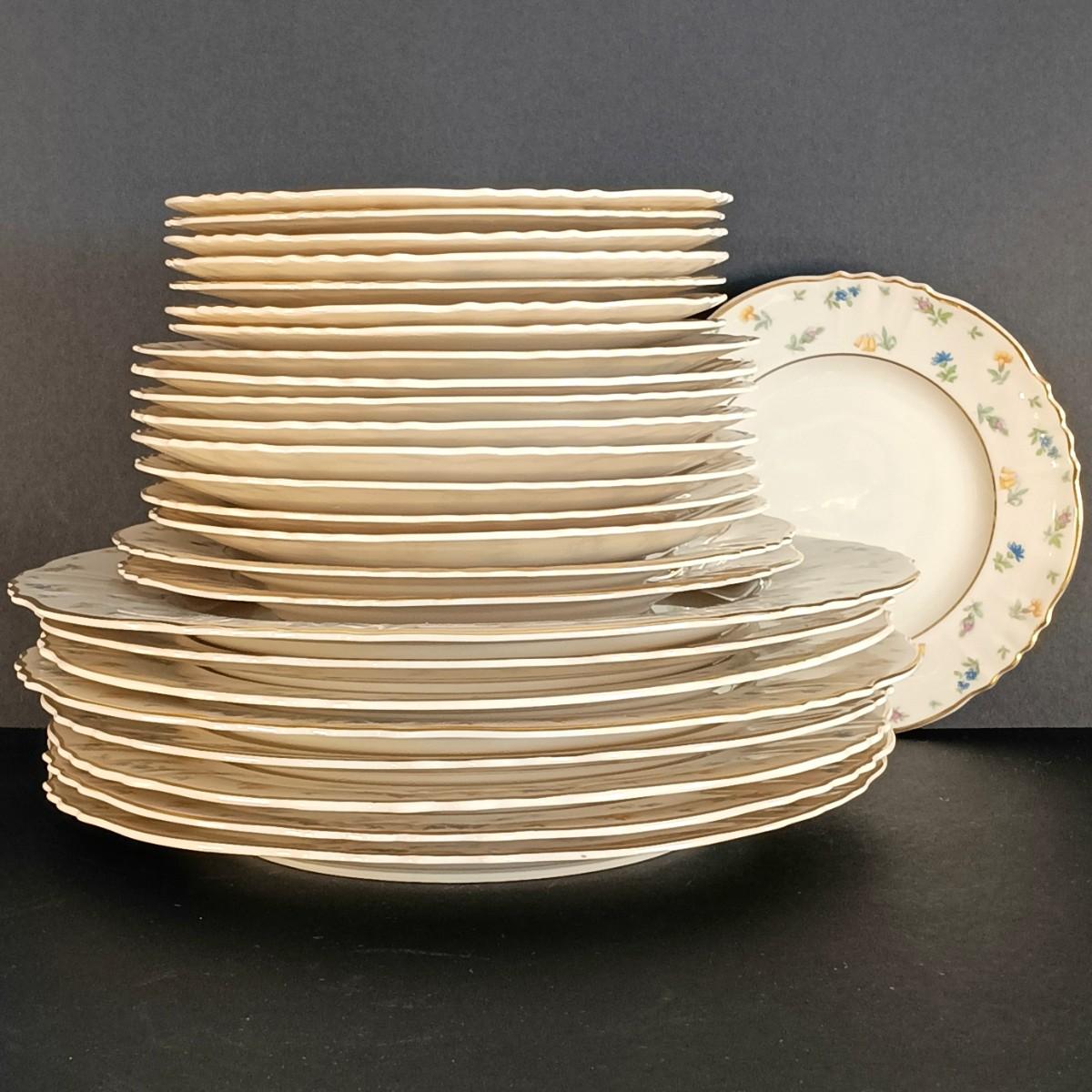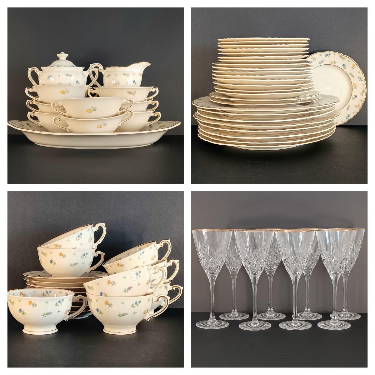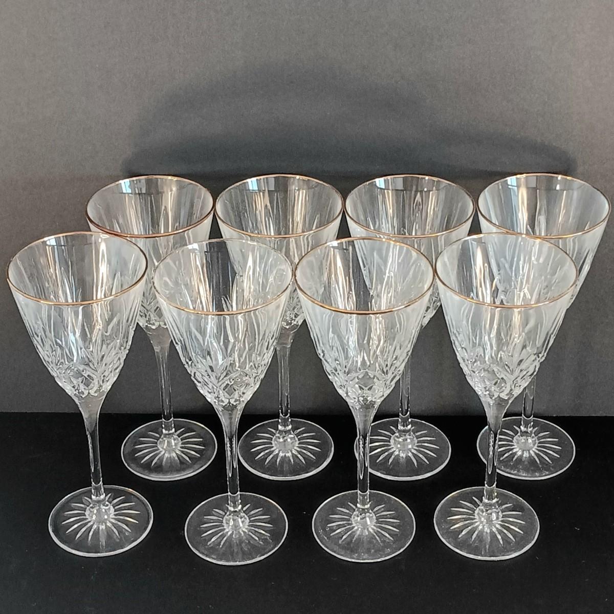LOT 10L: Federal Shape Syracuse China with Gold Rimmed Wine Glasses