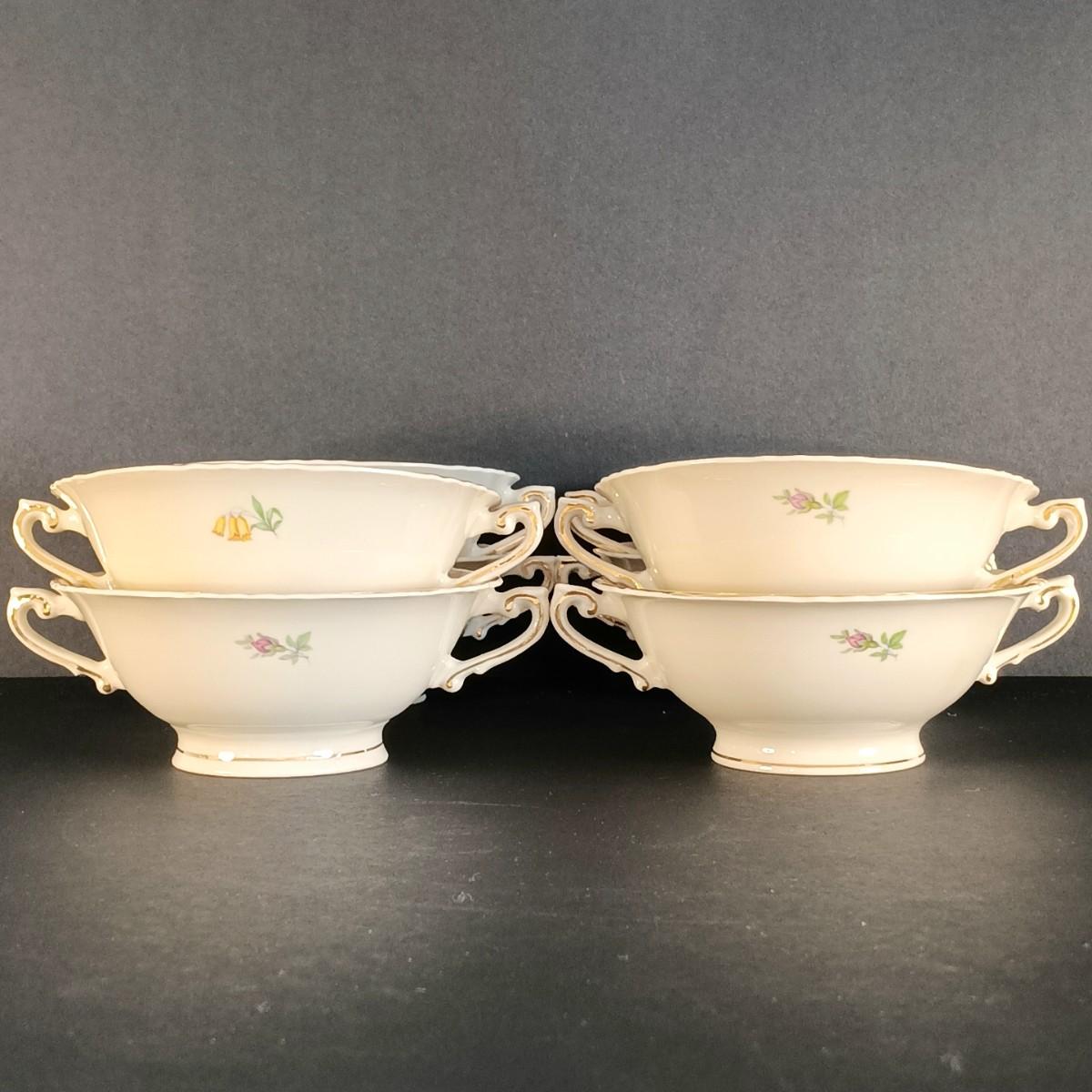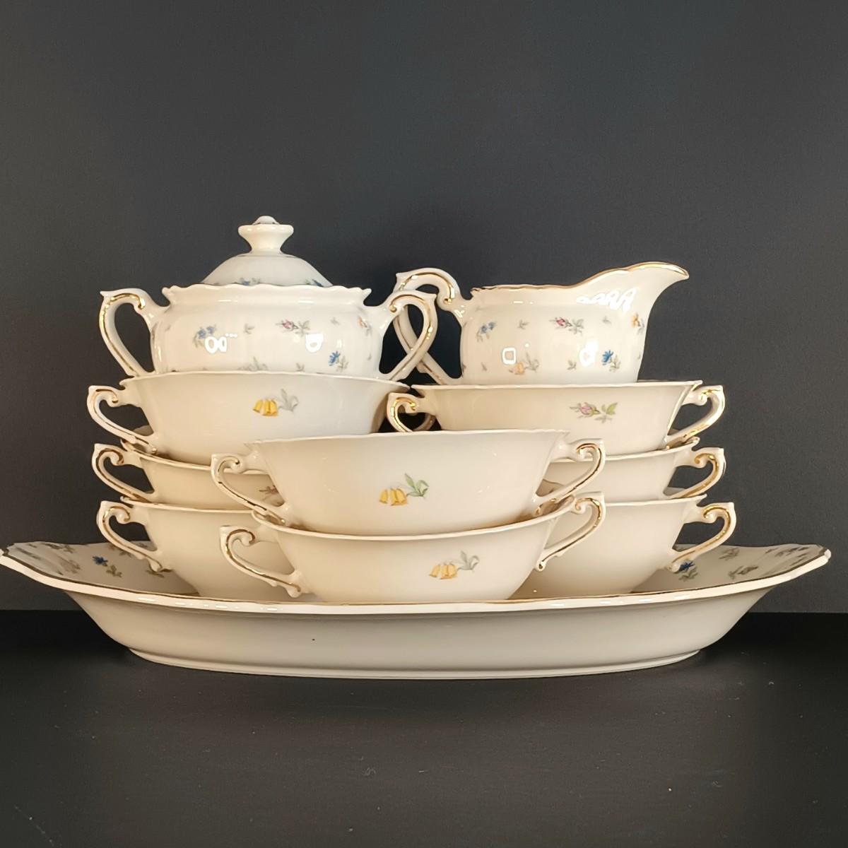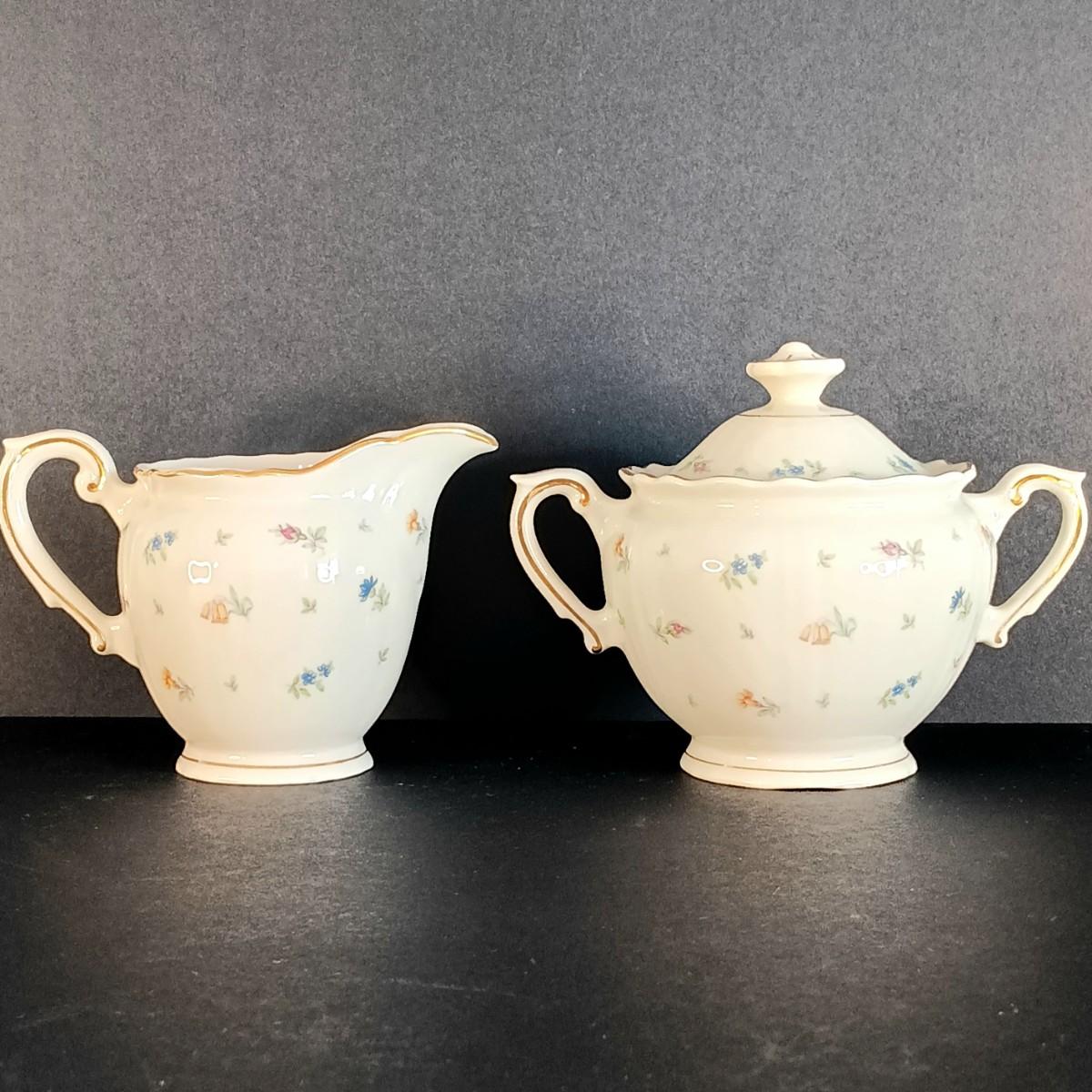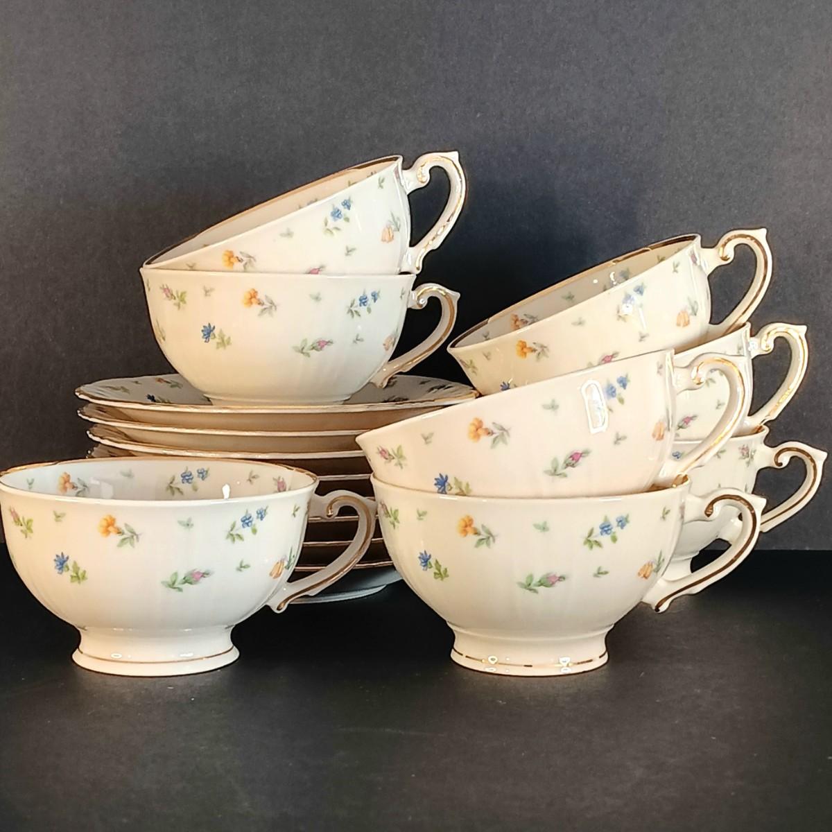 LOT 10L: Federal Shape Syracuse China with Gold Rimmed Wine Glasses