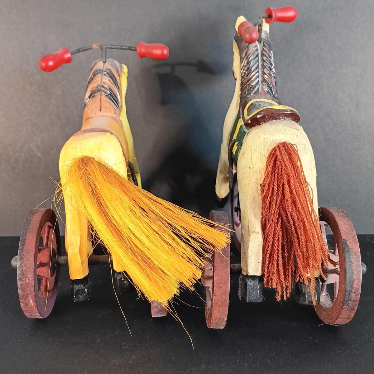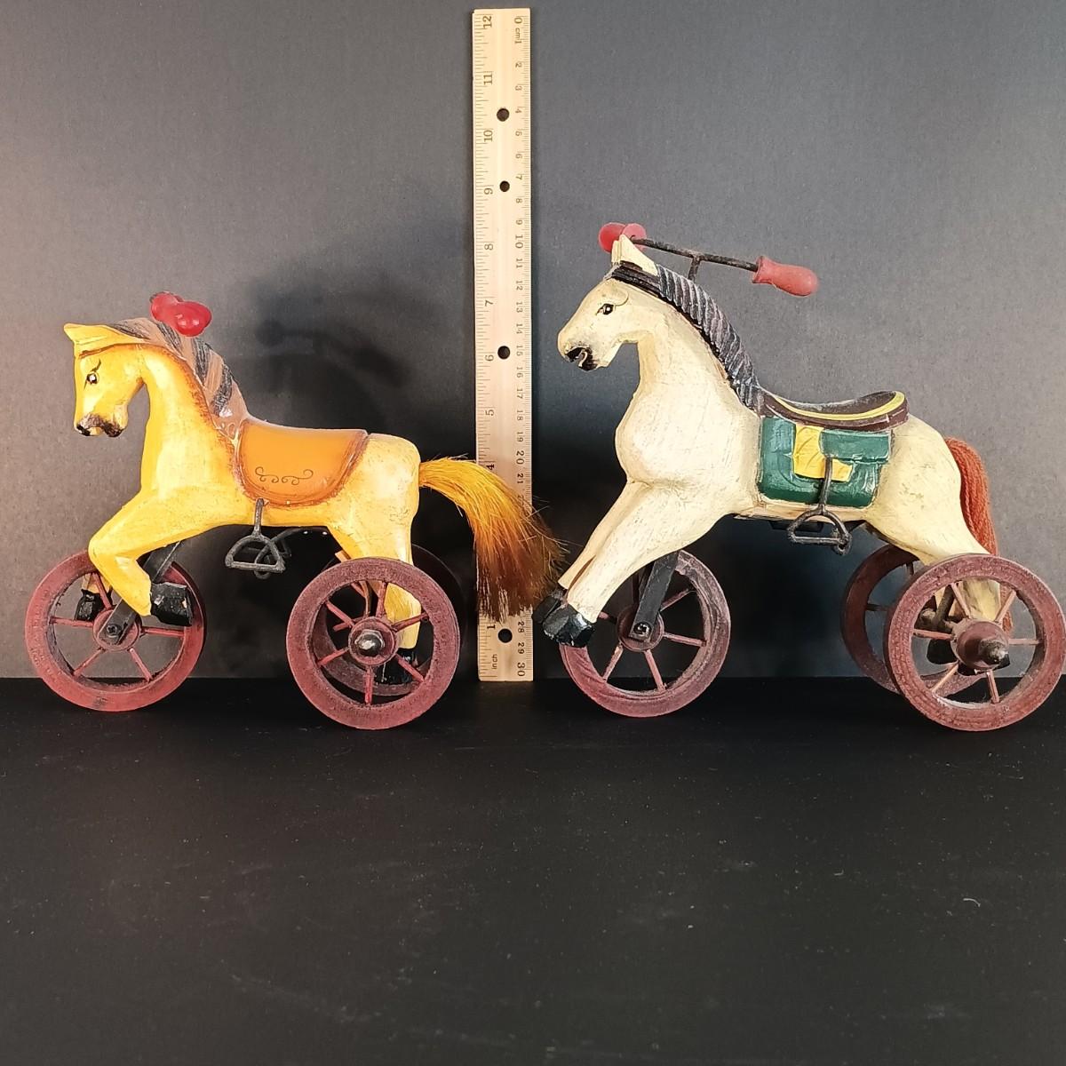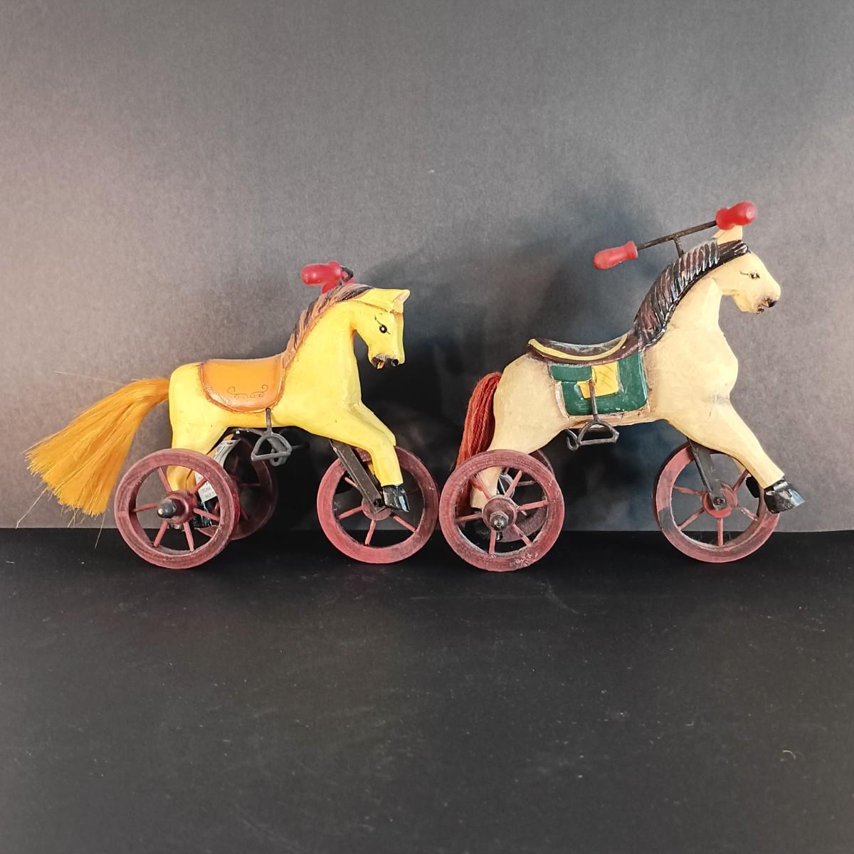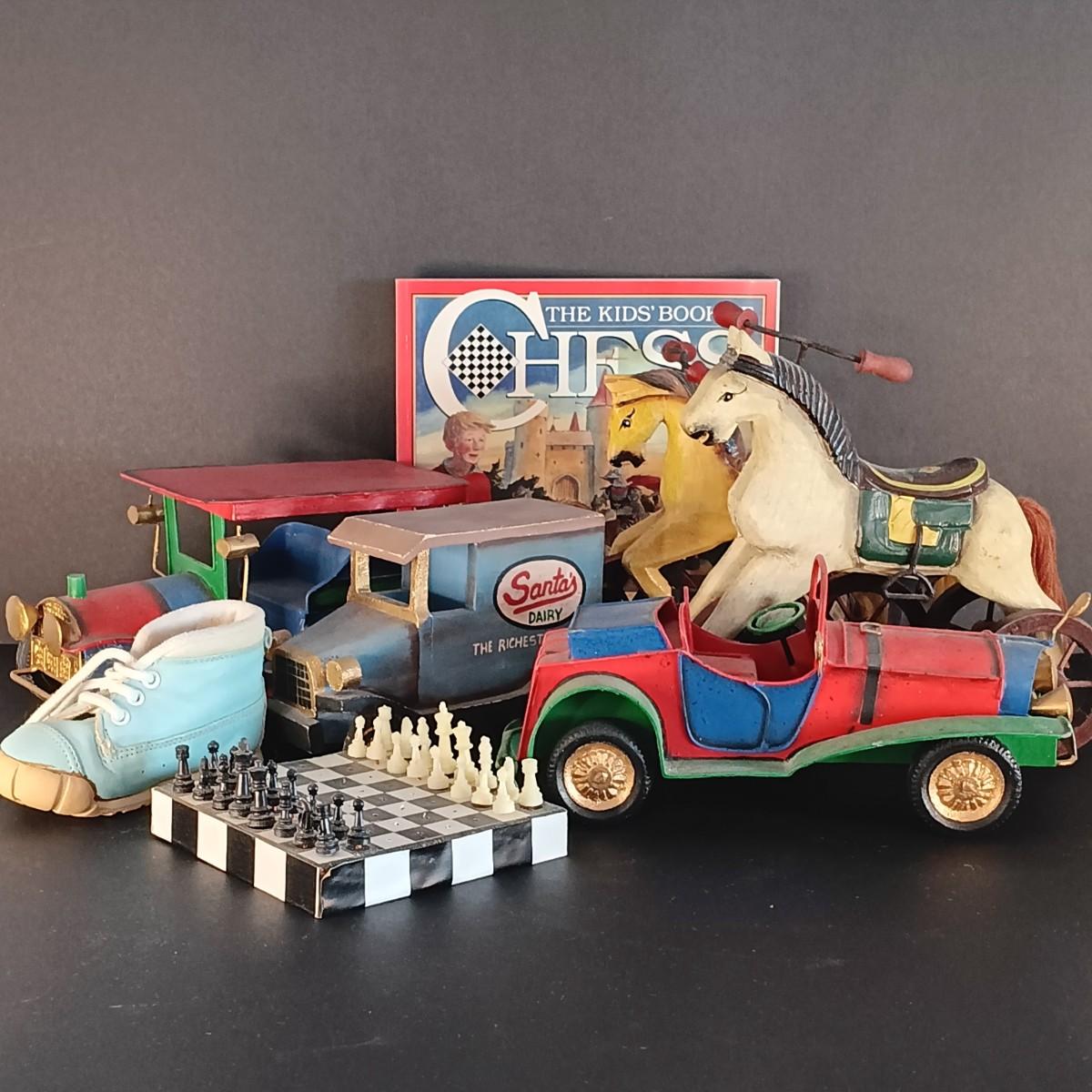 LOT 16C: Vintage Toy Collection- Three Hands Corp Wooden Horse Tricycles, Metal and Wood Cars, Mini Chess Set & More