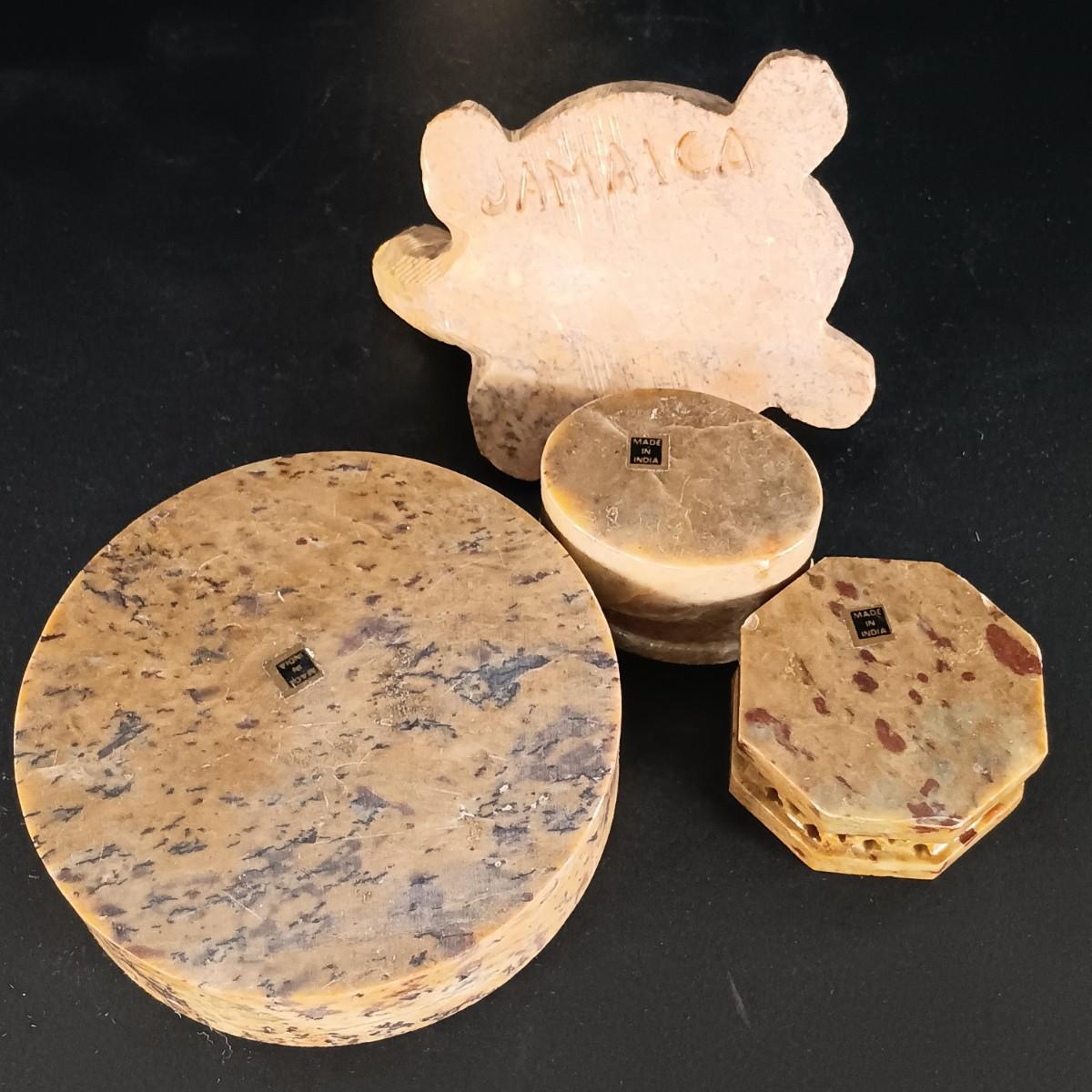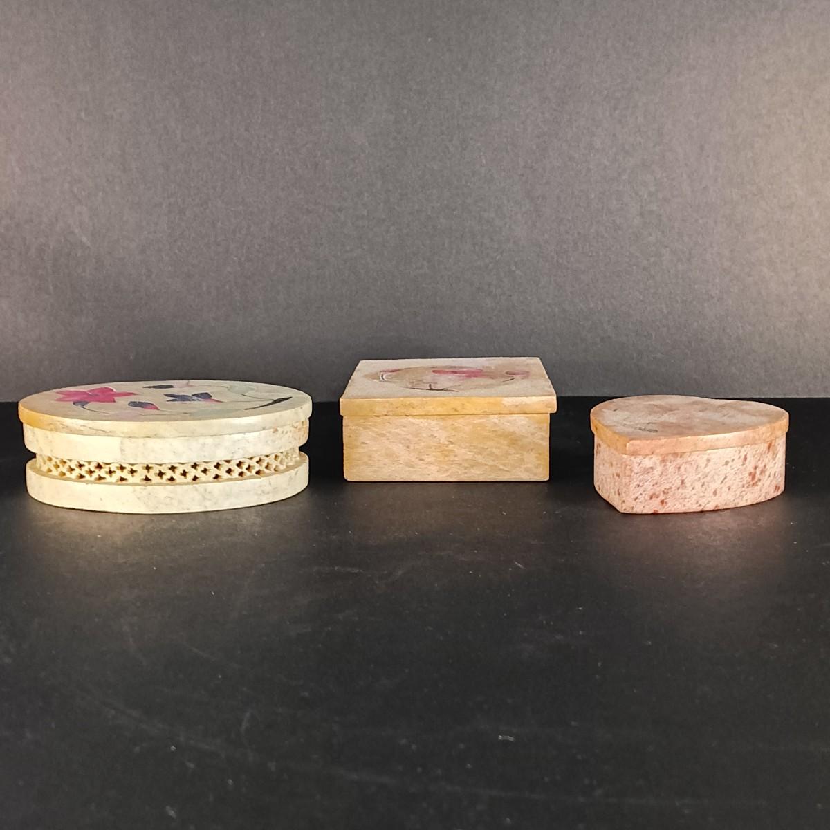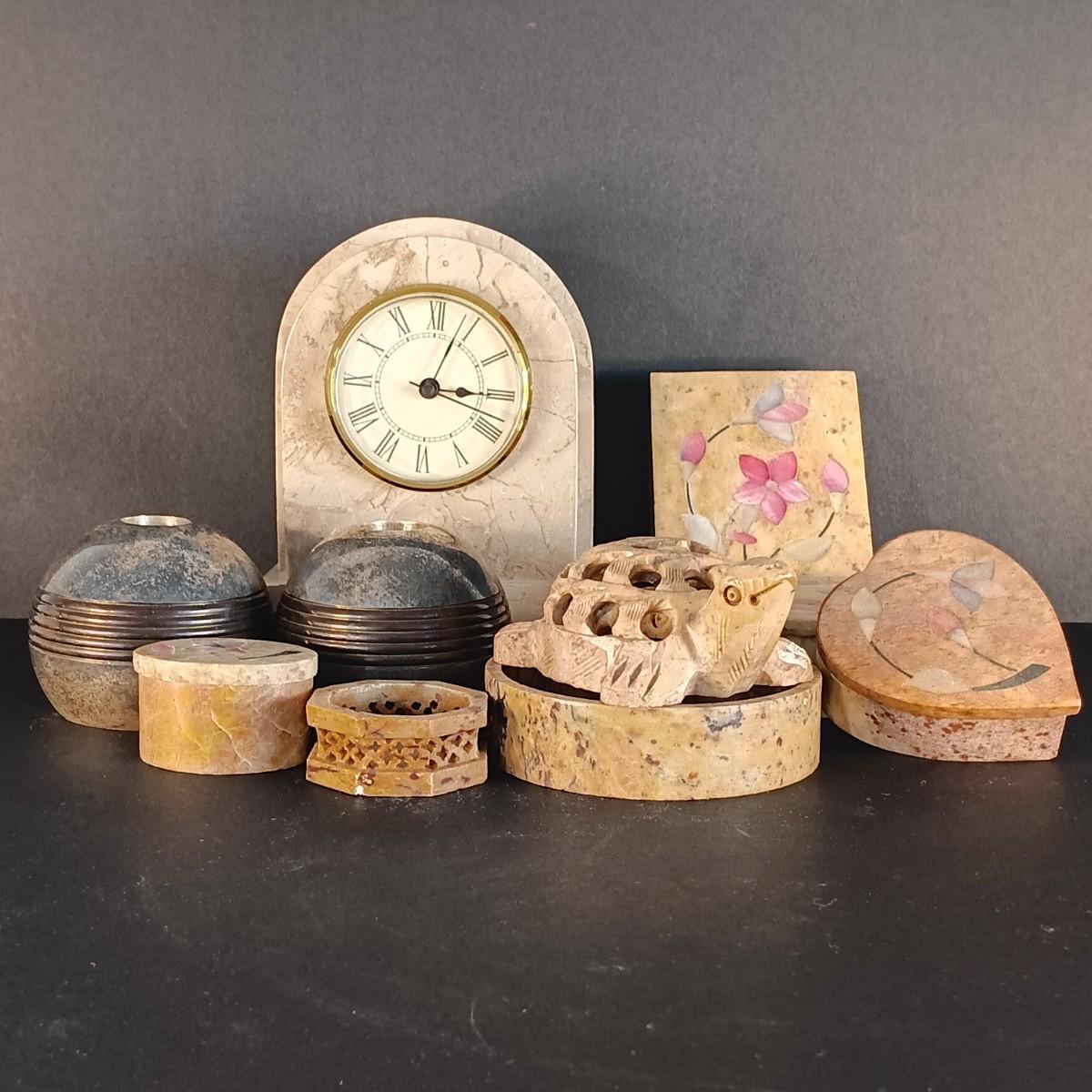 LOT 18C: Soapstone Trinket Boxes with Renoir Designs Mantle Clock & Silvestri Candle Holders
