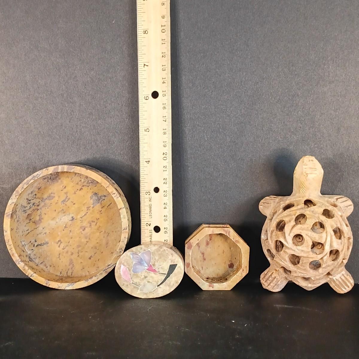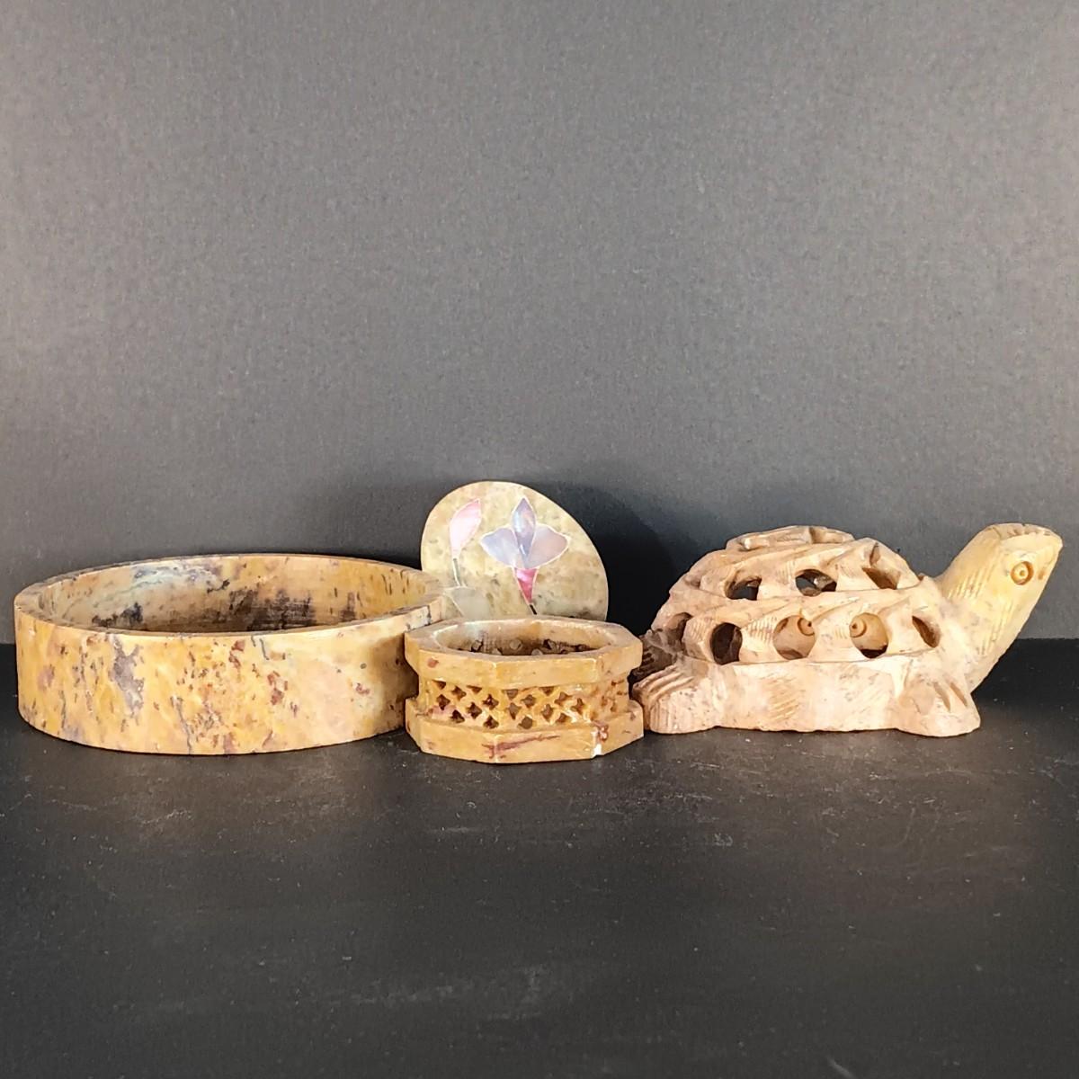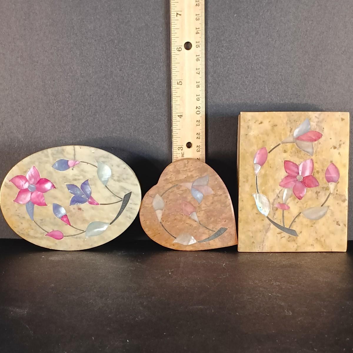 LOT 18C: Soapstone Trinket Boxes with Renoir Designs Mantle Clock & Silvestri Candle Holders