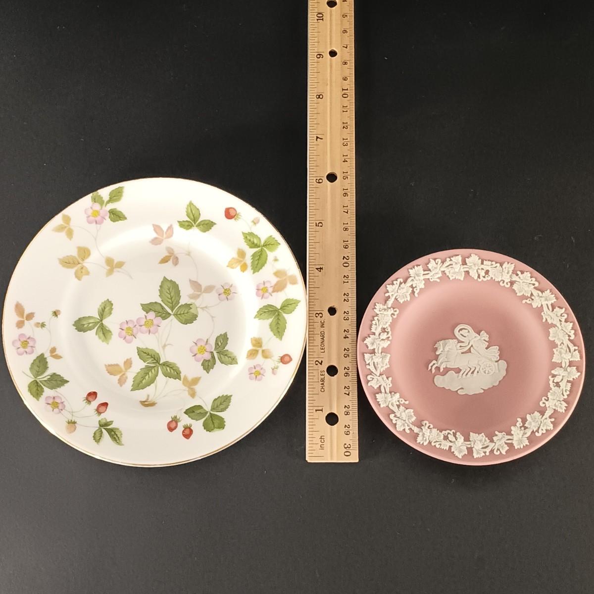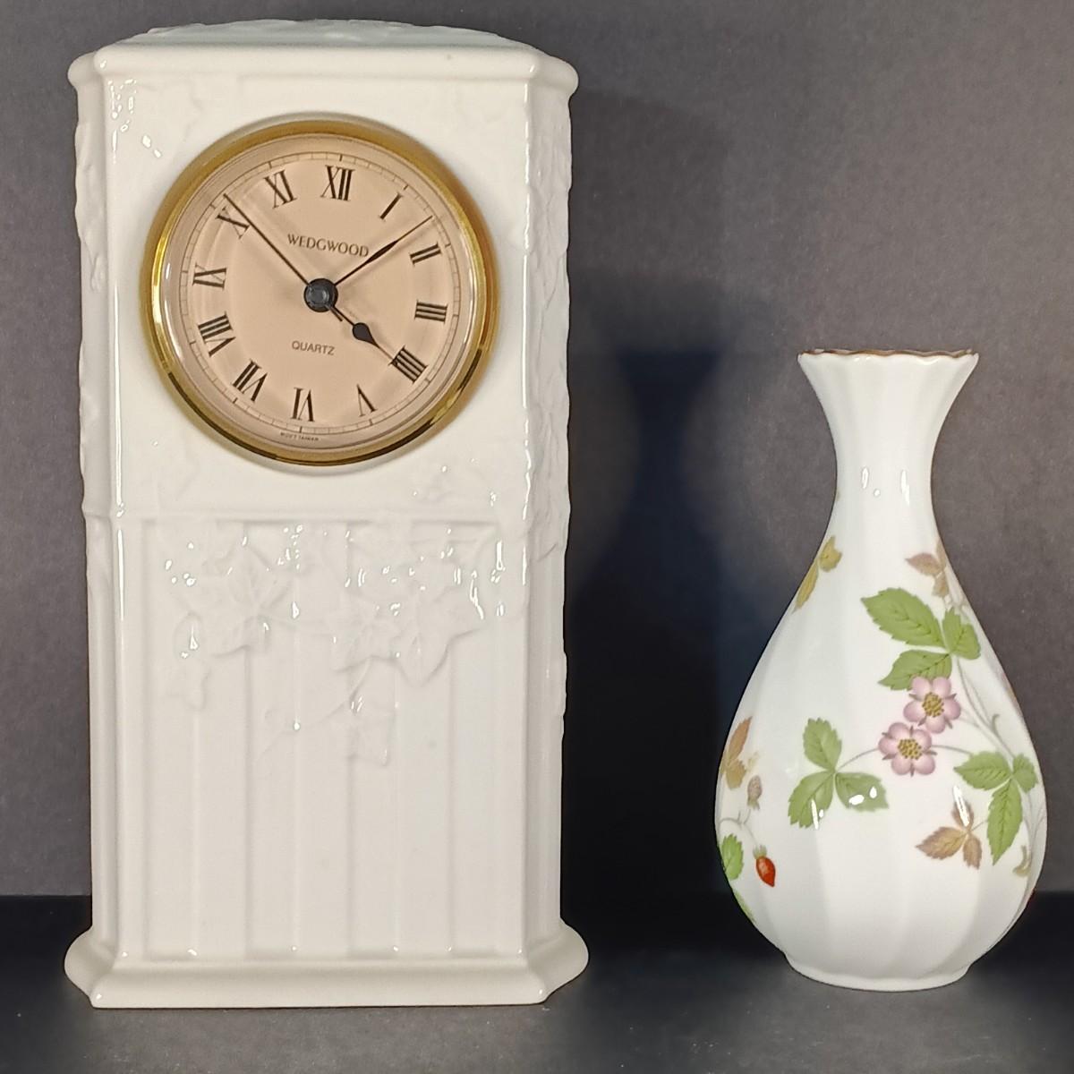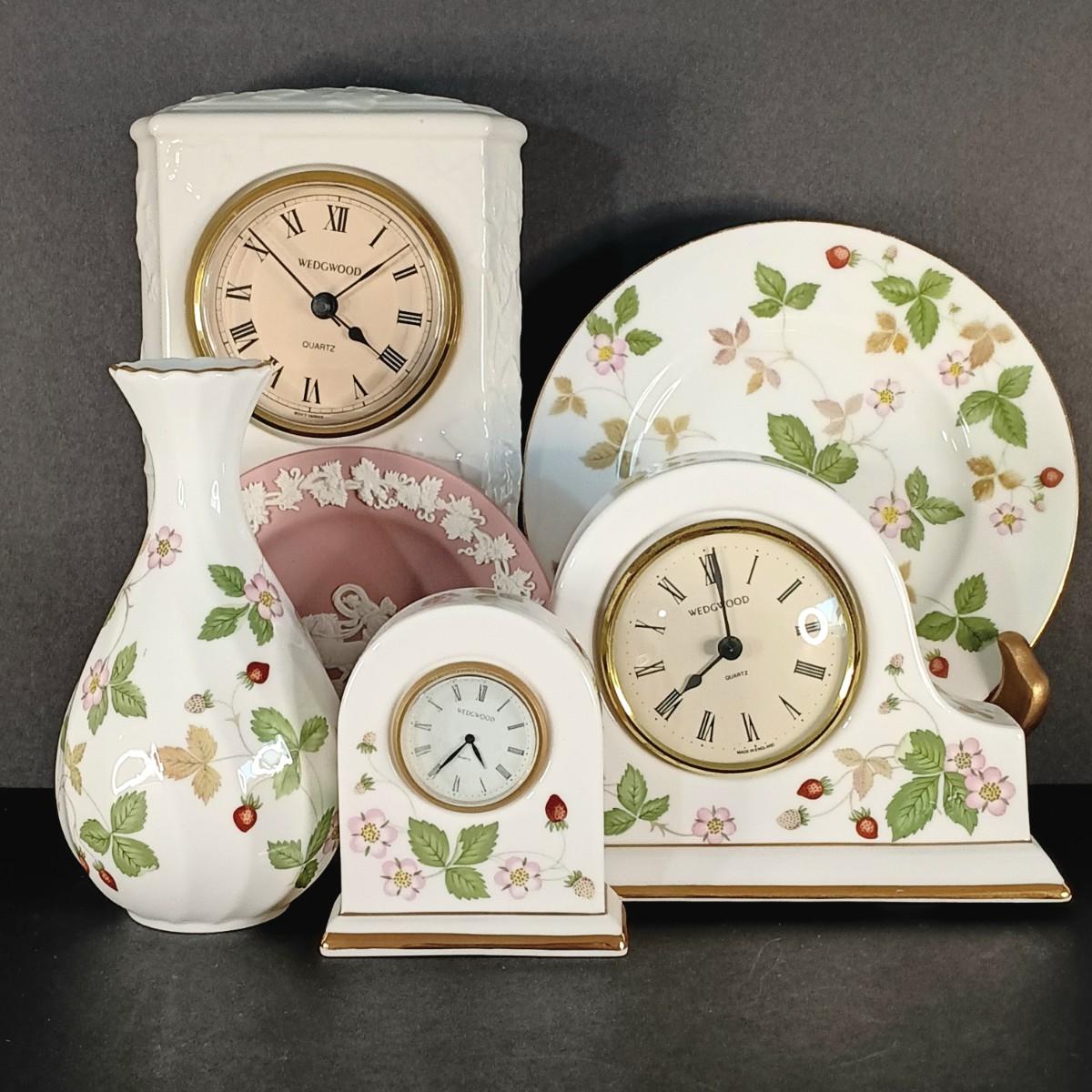 LOT 20K: Wedgewood Collection- Classic Garden Mantle Clock, Pink Trinket Tray & Wild Strawberry Vase, Clocks and Plates