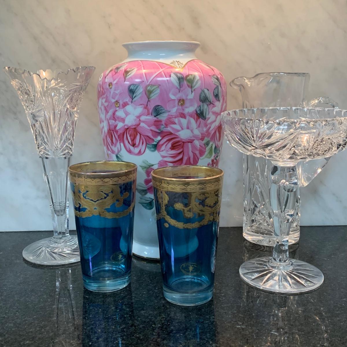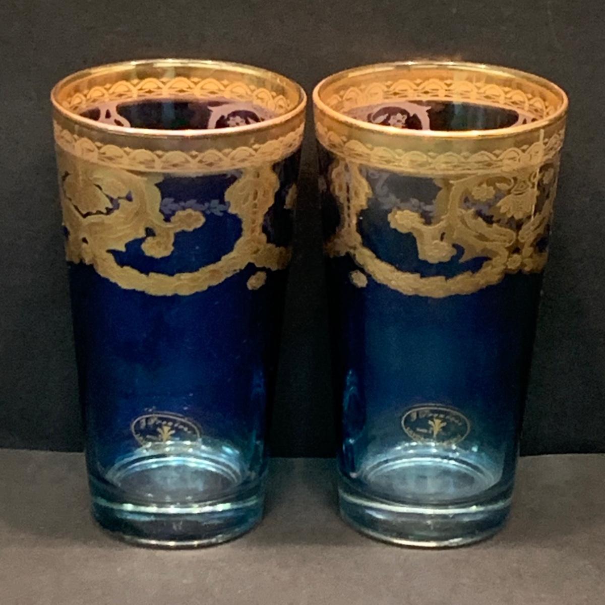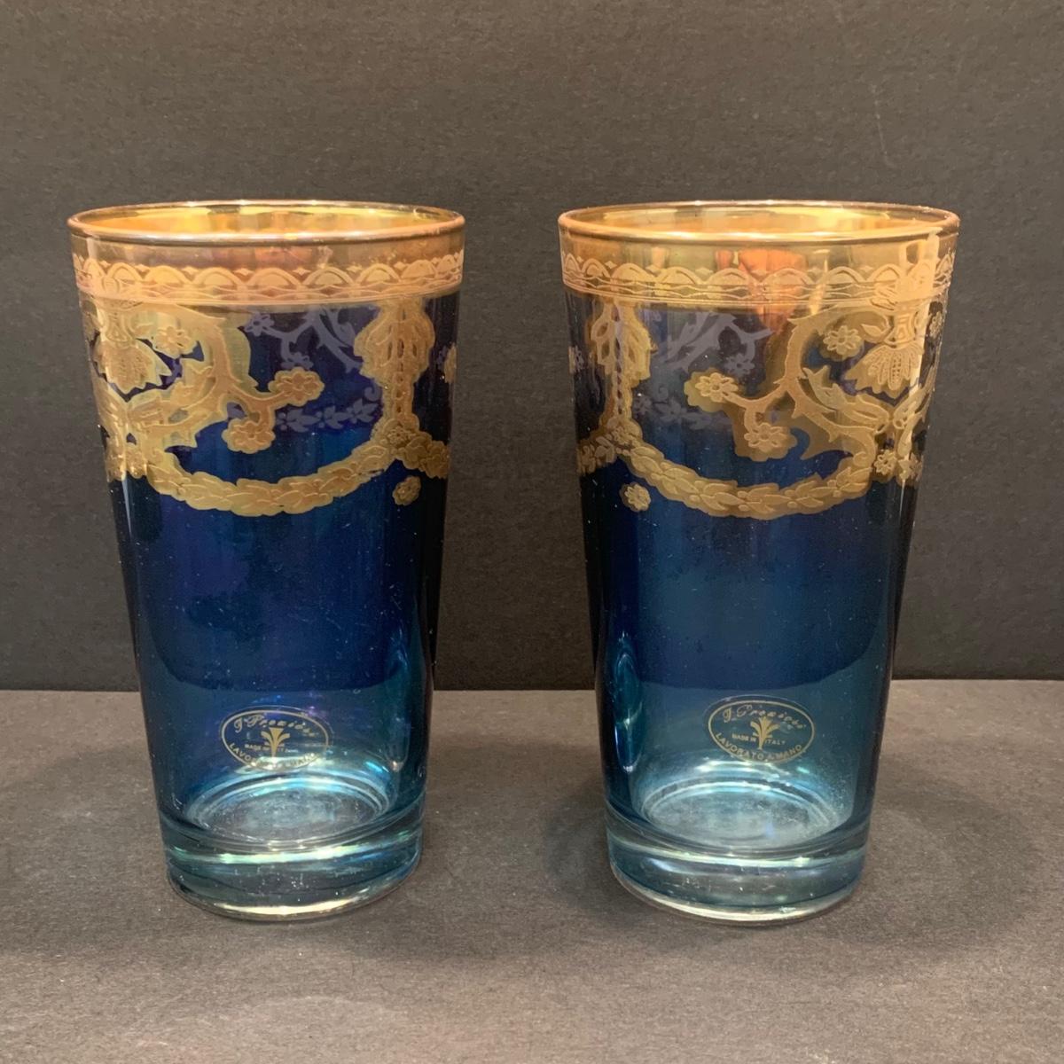 LOT 64K: Vintage J Preziosi Lavorato A. Mano Glasses Italy Blue Gold Mid Century 70s, Formalities by Baum Bros. Vase: Hand Painted w/10k Gold Accents & More