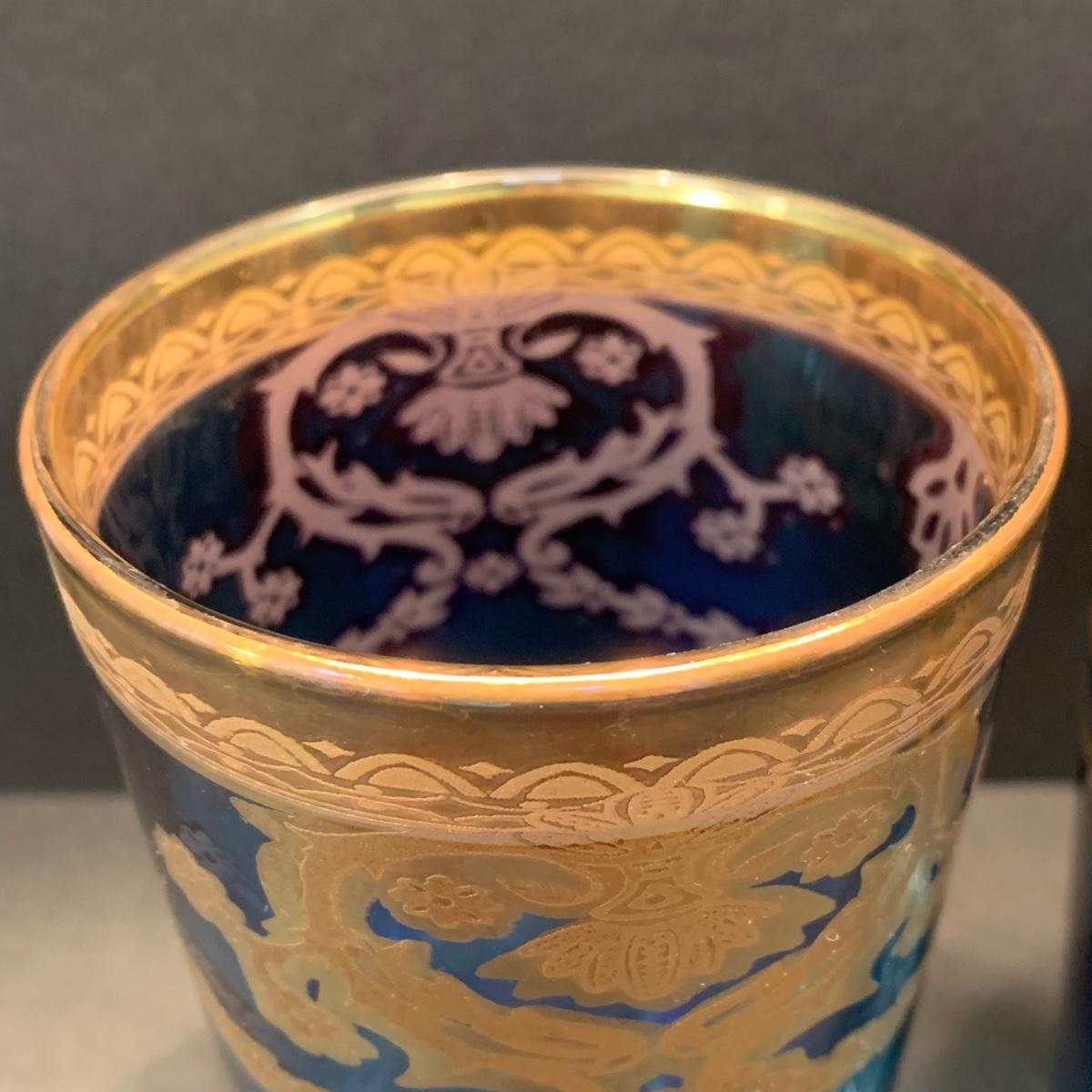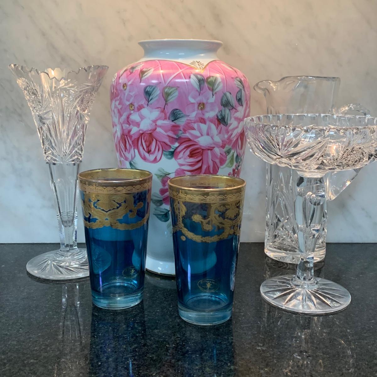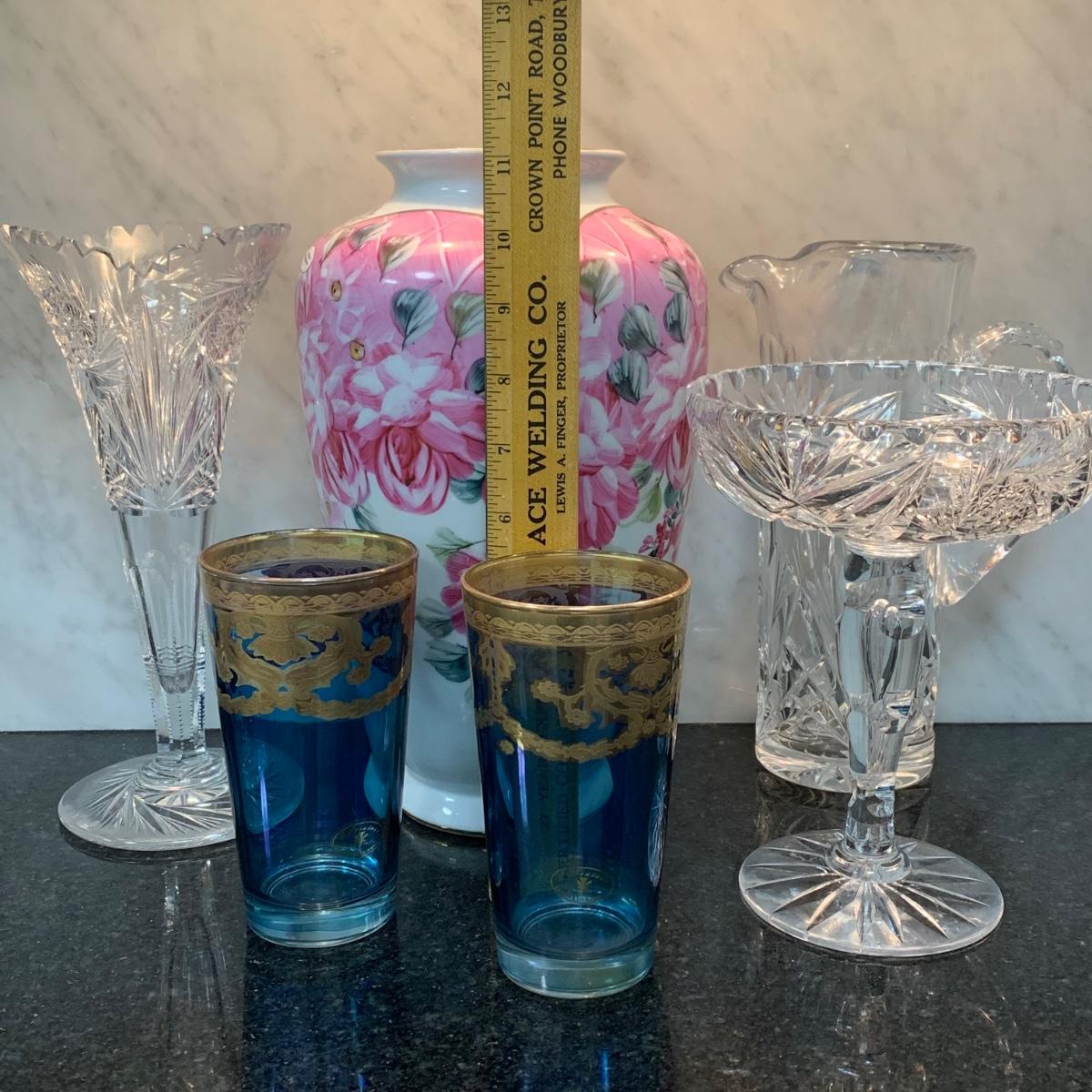 LOT 64K: Vintage J Preziosi Lavorato A. Mano Glasses Italy Blue Gold Mid Century 70s, Formalities by Baum Bros. Vase: Hand Painted w/10k Gold Accents & More