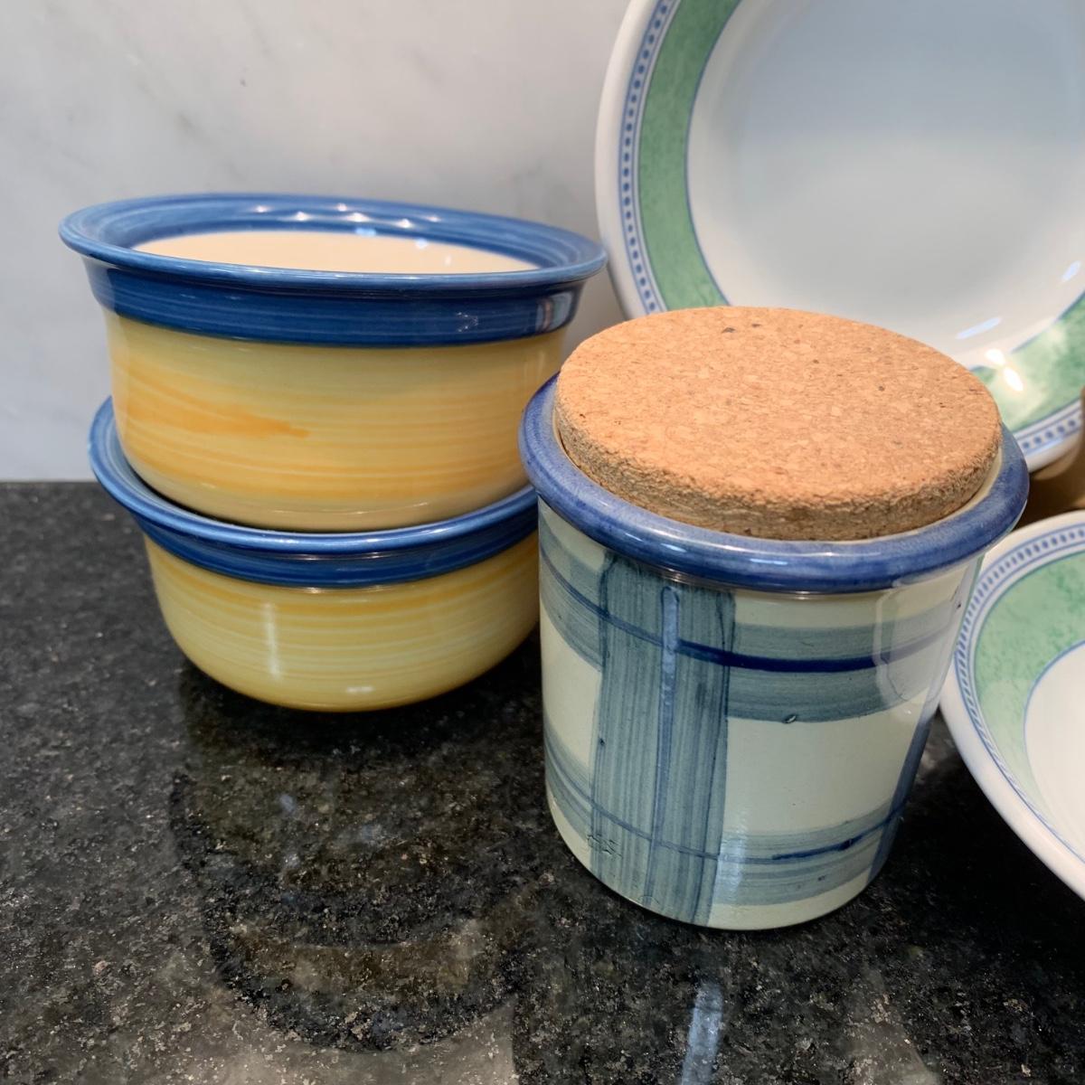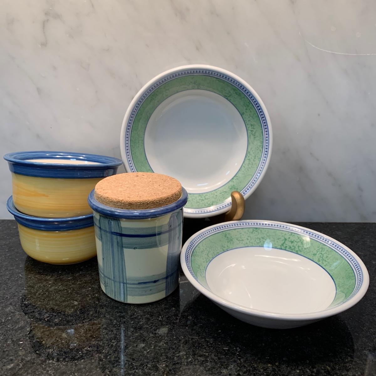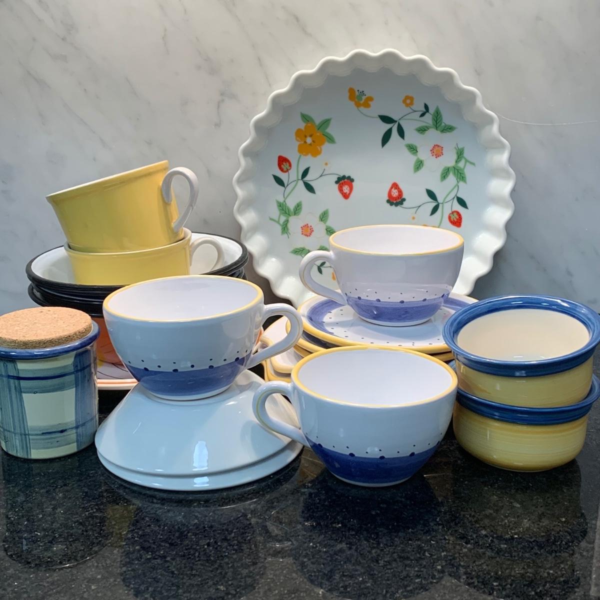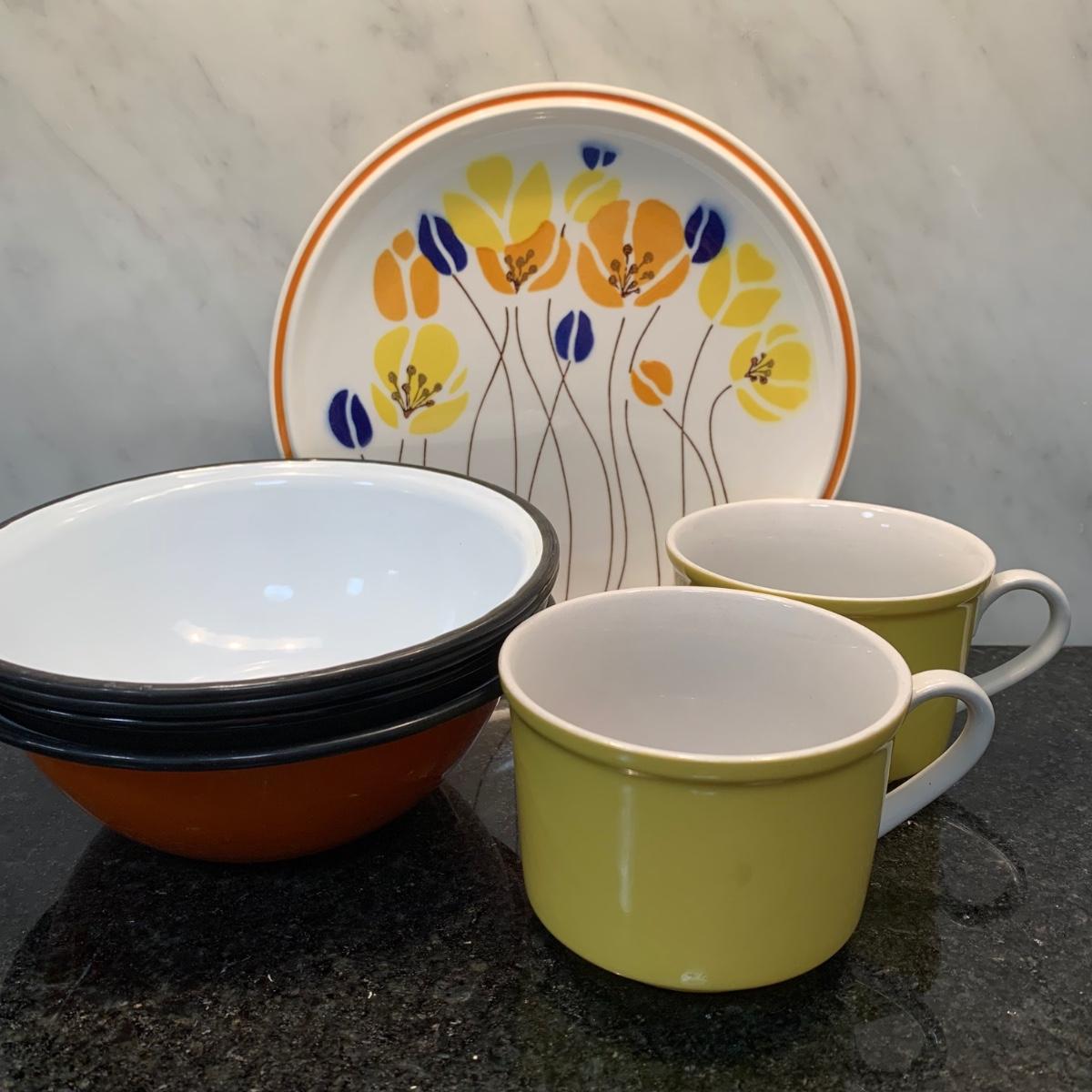 LOT 65K: Vintage Mikasa, Vintage Enamelware Metal Bowls, Johnson Bros Bowls, Signed Pottery Plates, Cups Saucers & More