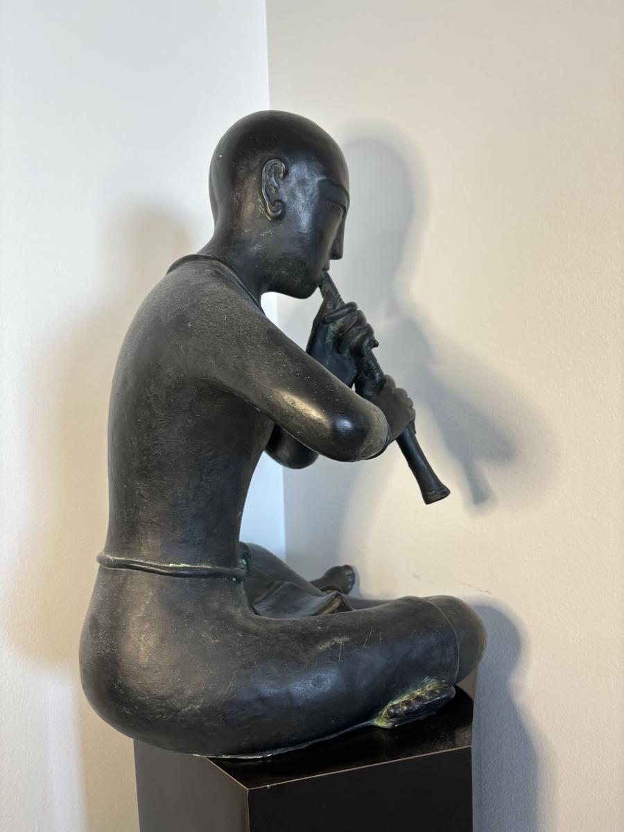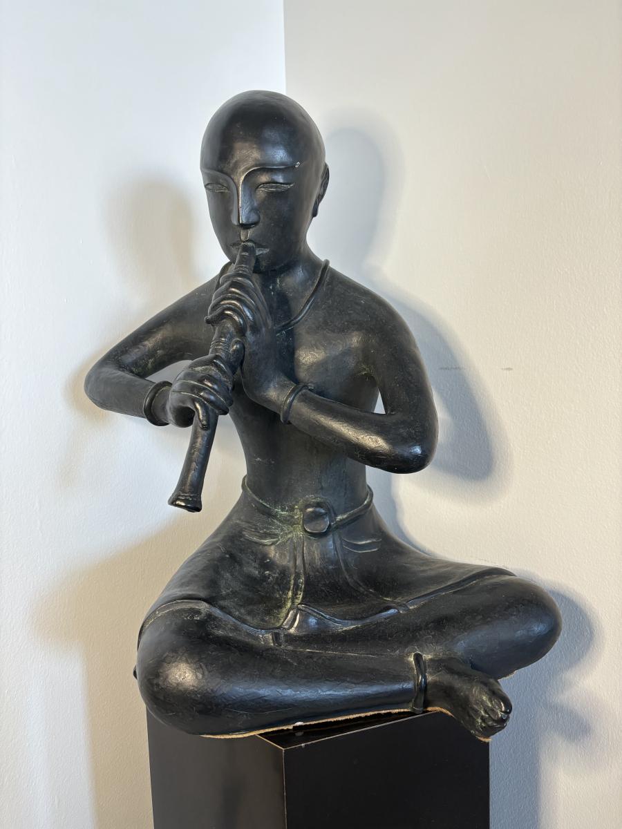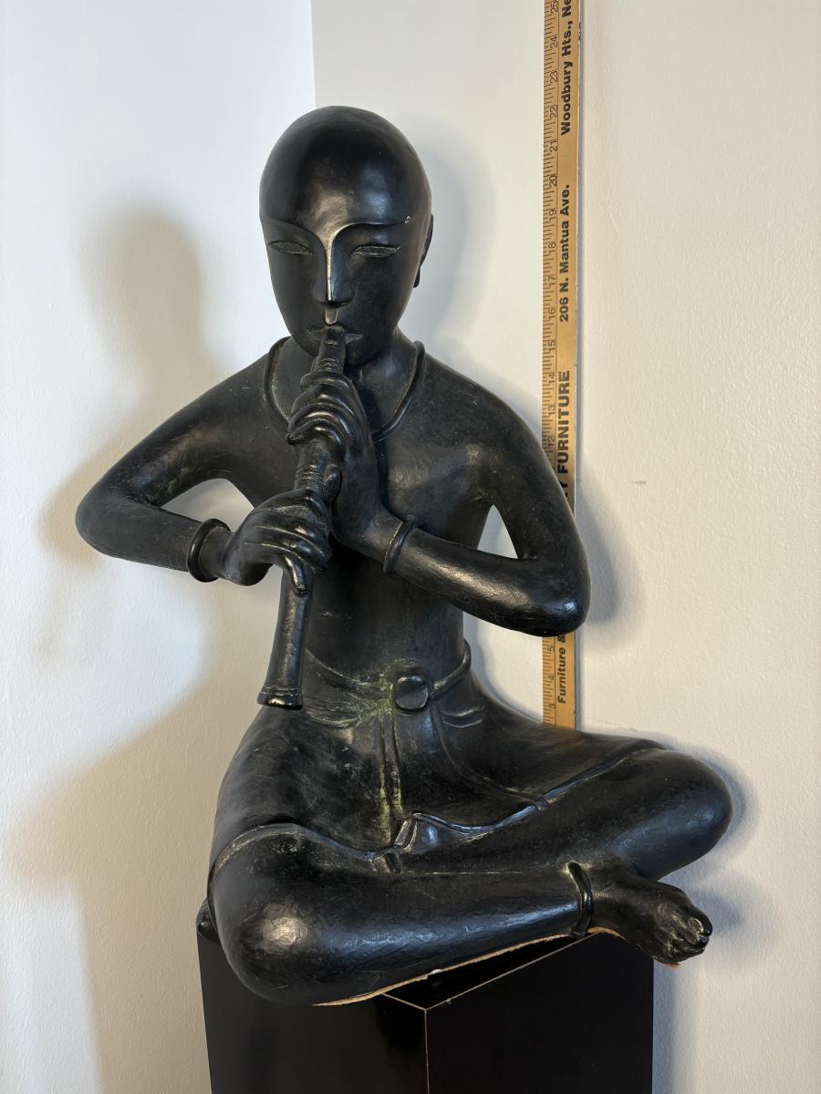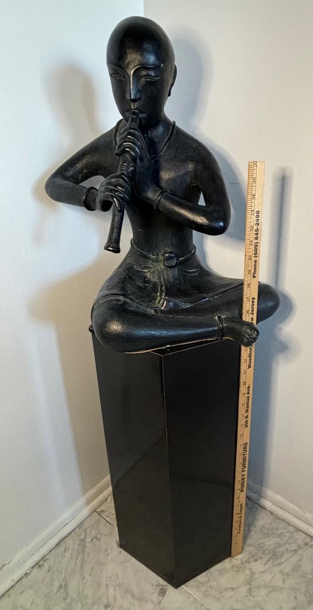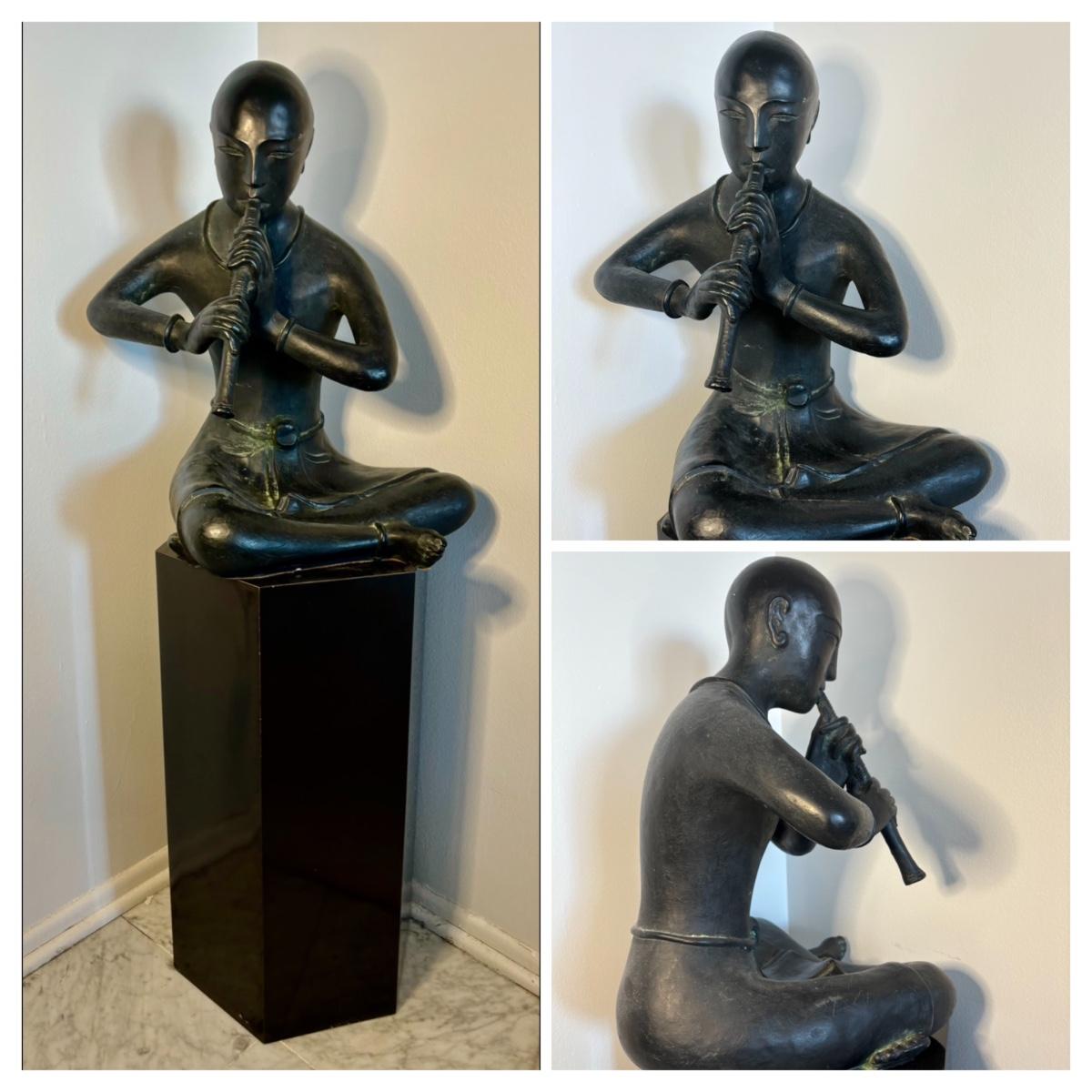 LOT 85L: Vintage Bronze Gilded Buddhist Boy Snake Charmer Chalkware Sculpture w/ Stand
