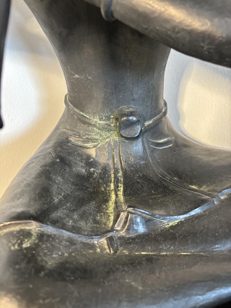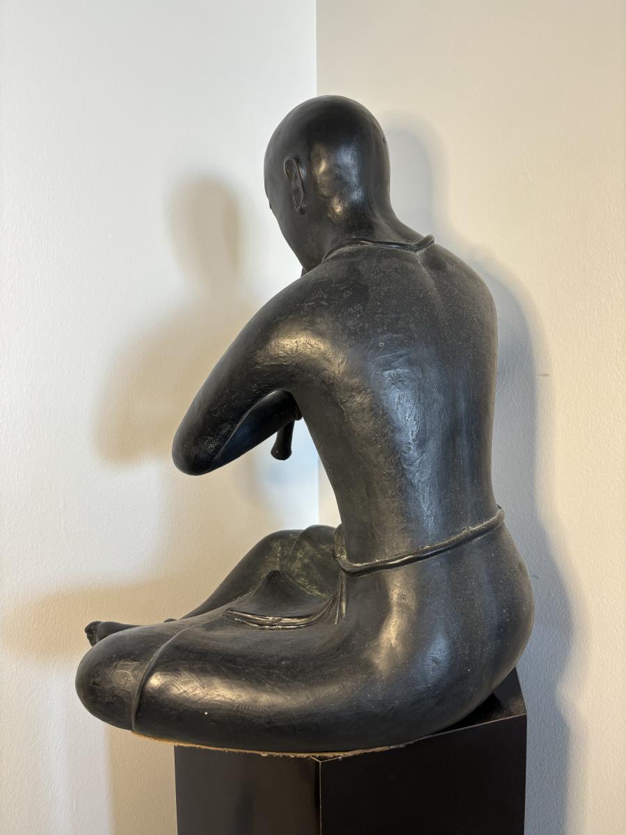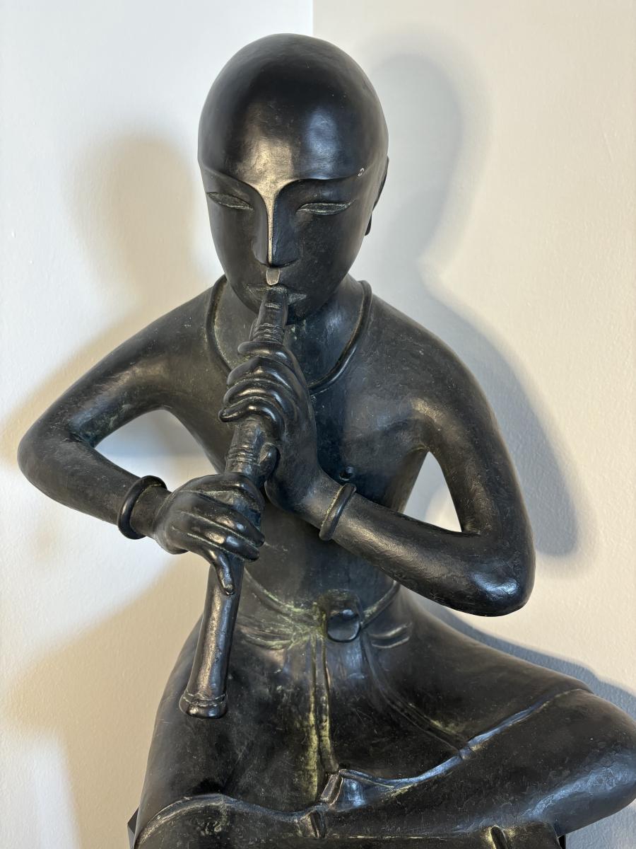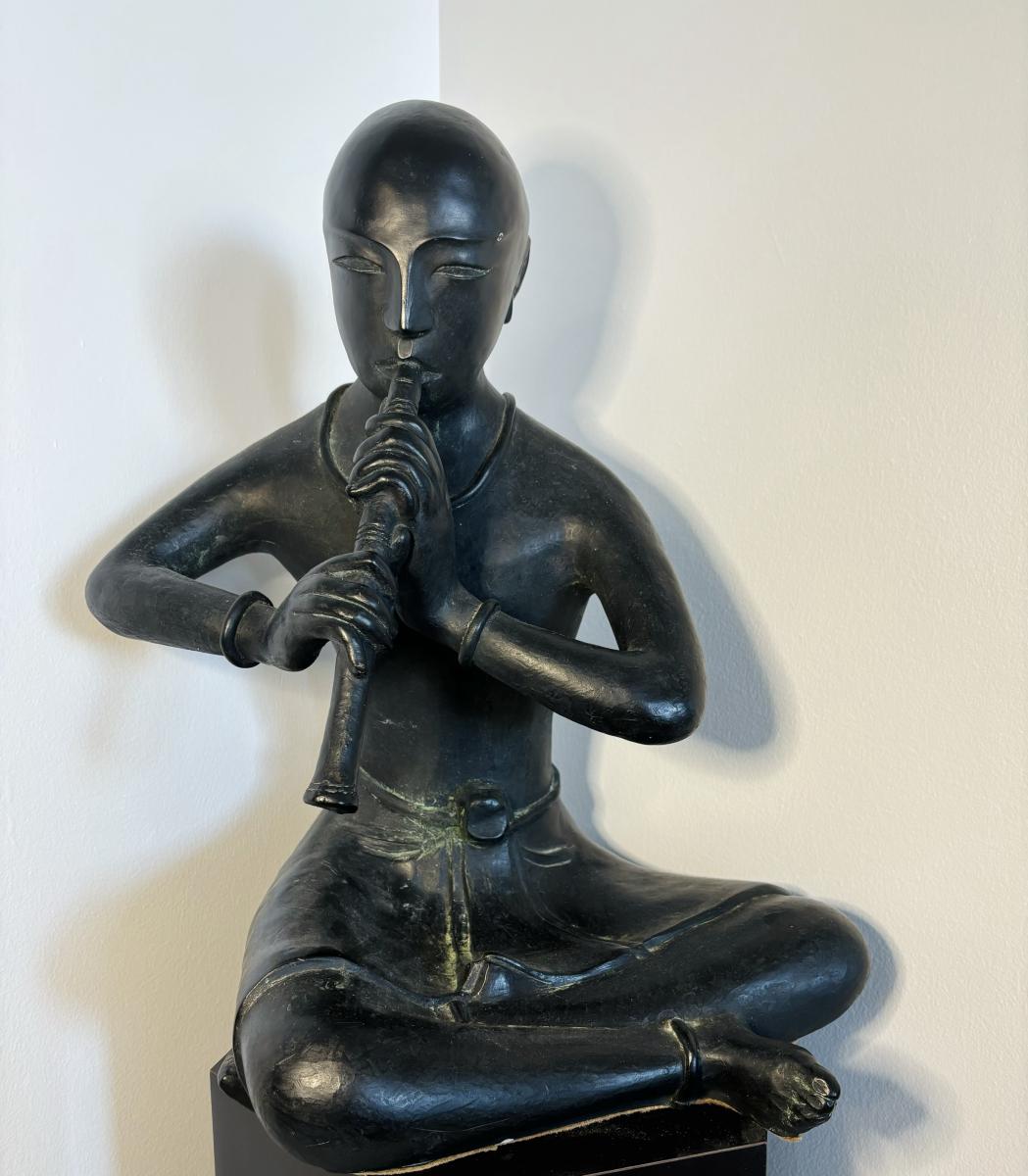LOT 85L: Vintage Bronze Gilded Buddhist Boy Snake Charmer Chalkware Sculpture w/ Stand