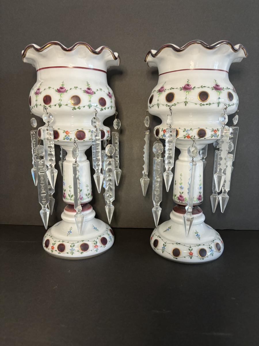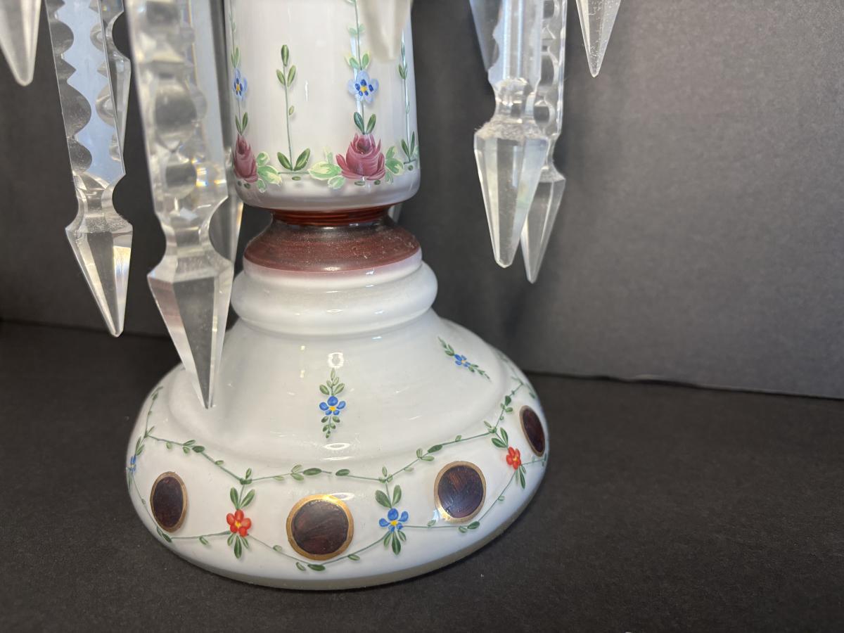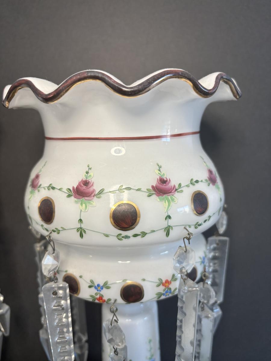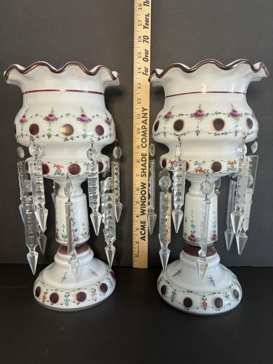 LOT 91L: Vintage Bohemian Mantle Lusters White Hand Painted w/Crystal Prisms