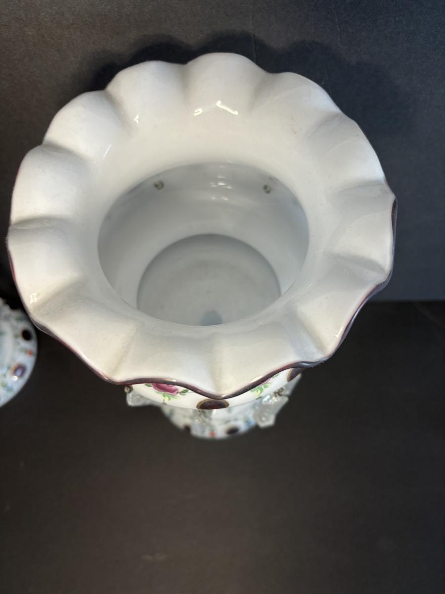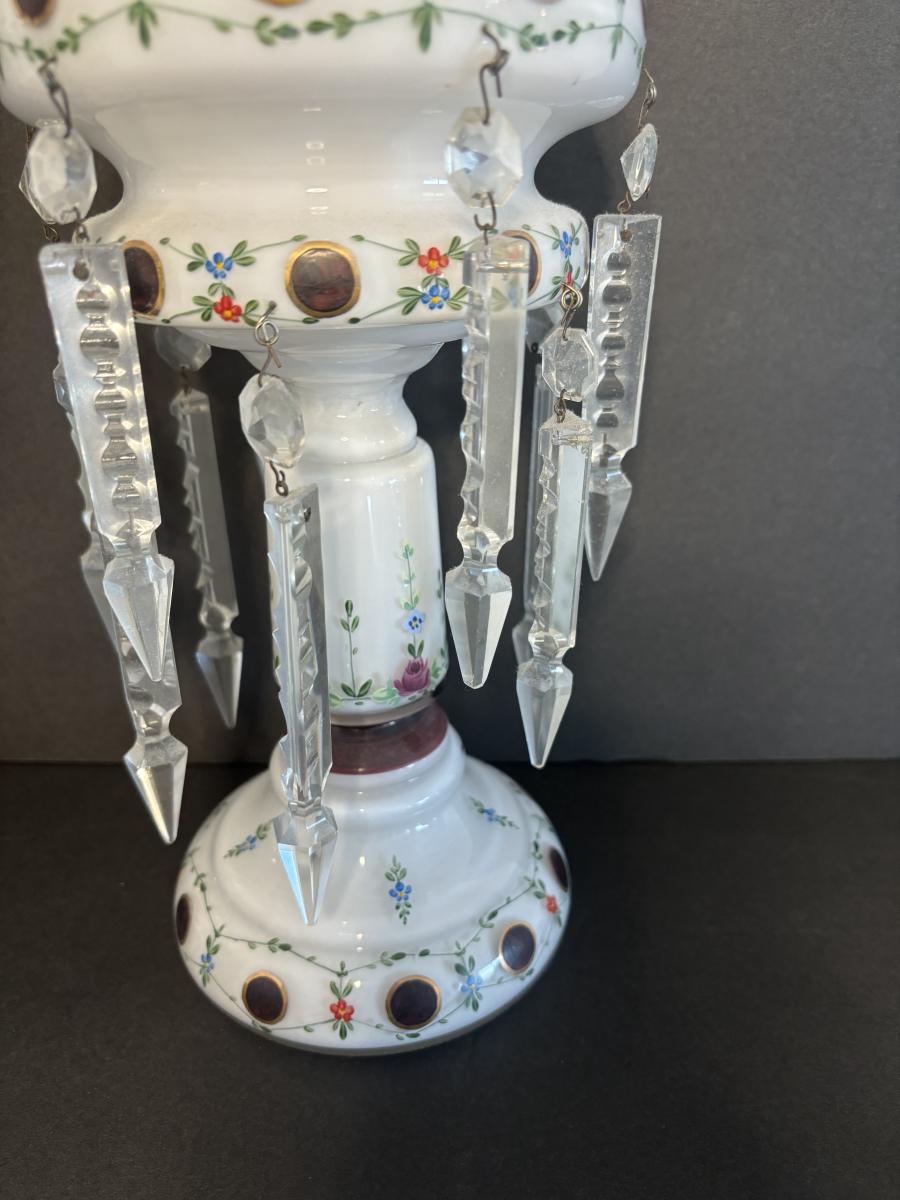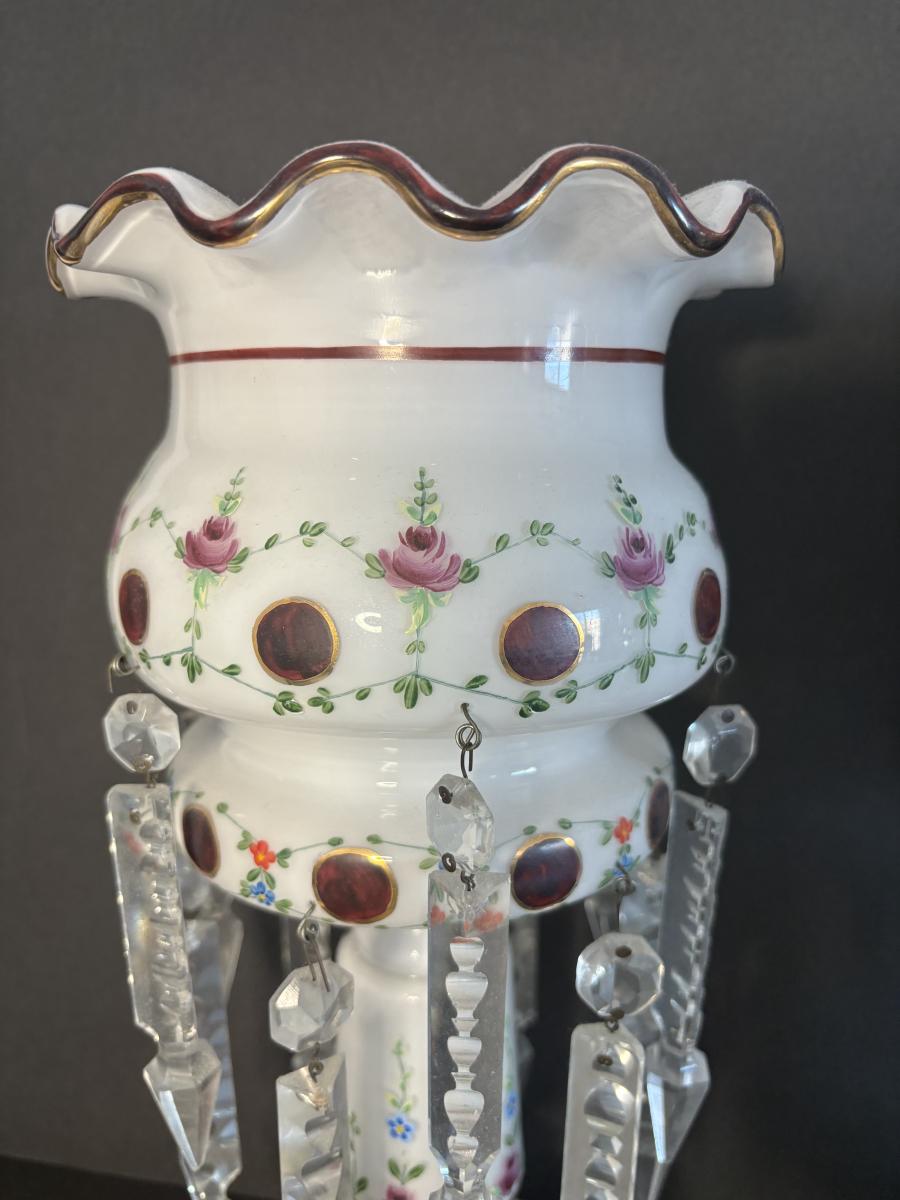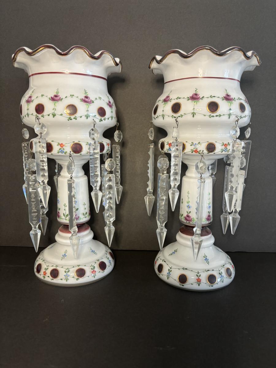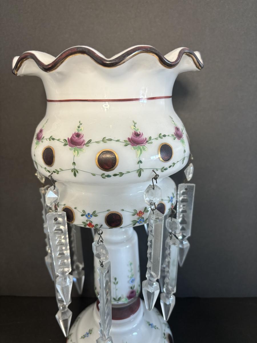 LOT 91L: Vintage Bohemian Mantle Lusters White Hand Painted w/Crystal Prisms