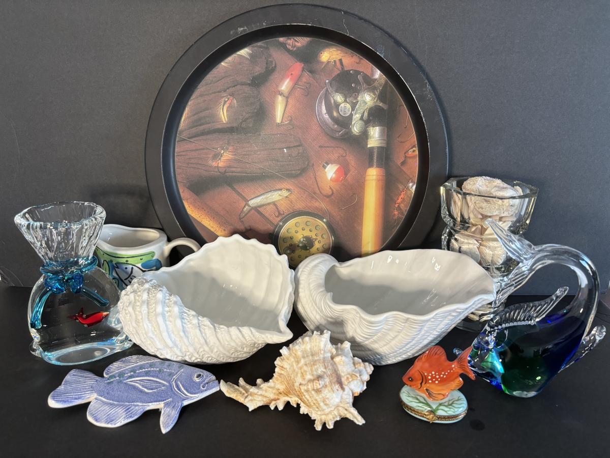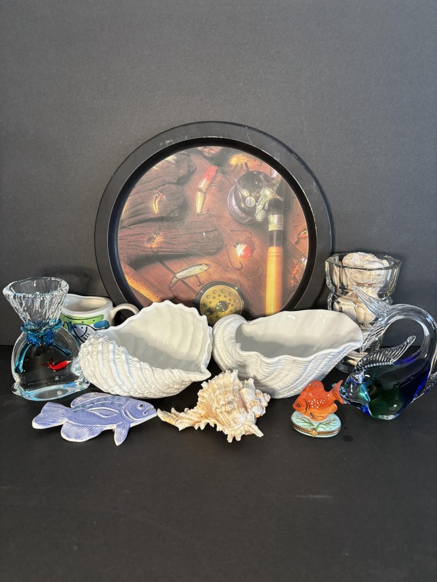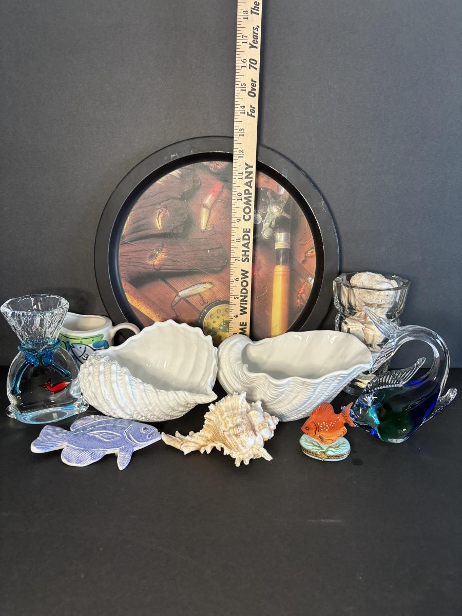 LOT 92L: Beach Home Decor- Shell Bowls, Glass Fish, Fish Trinket Box And More