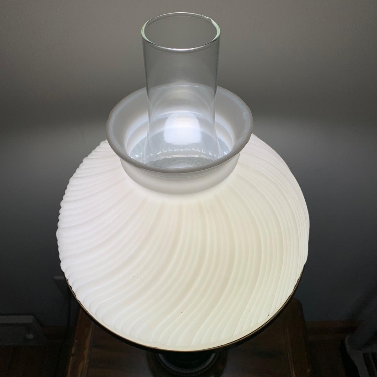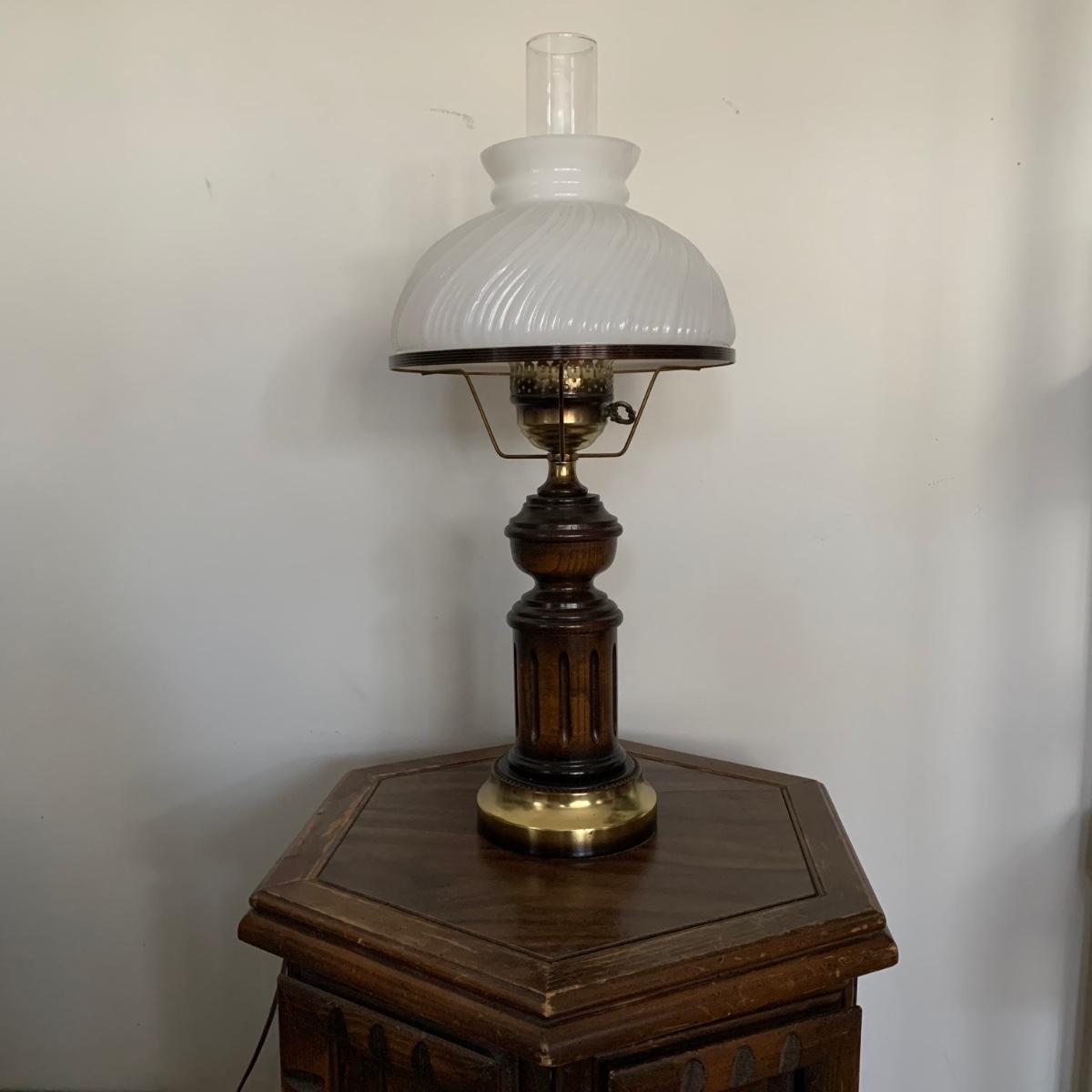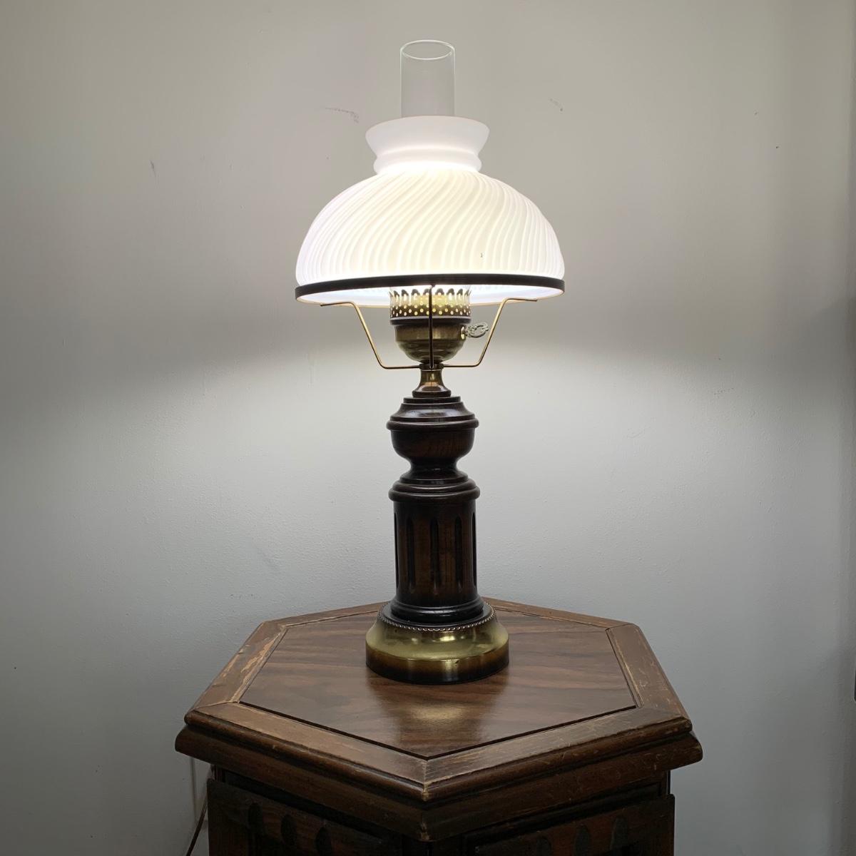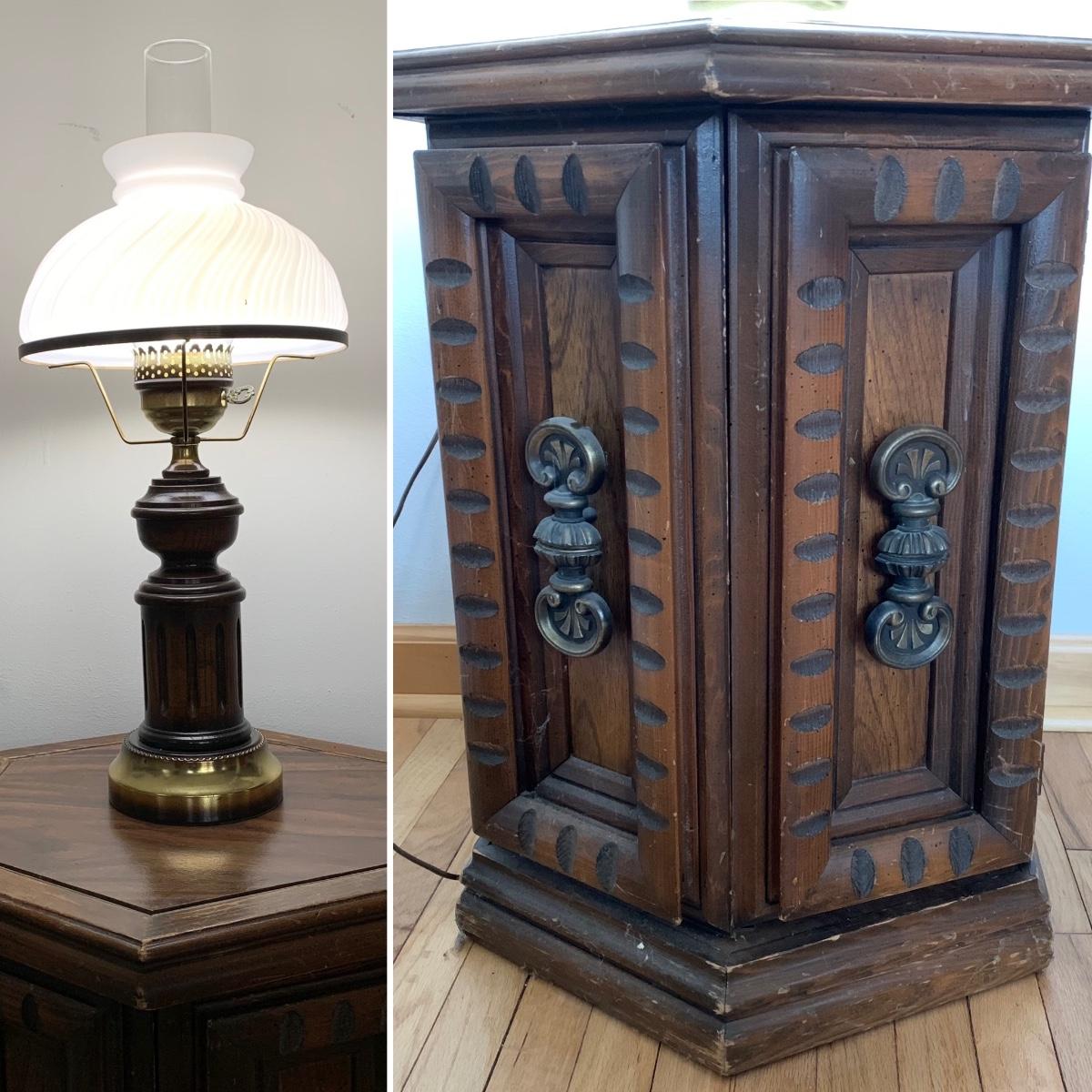 LOT 18 A: Vintage Lamp W/ Milk Glass Swirl Shade, Clear Glass Chimney, Wood, & Brass Base W/ A Hexagon Cupboard End Table