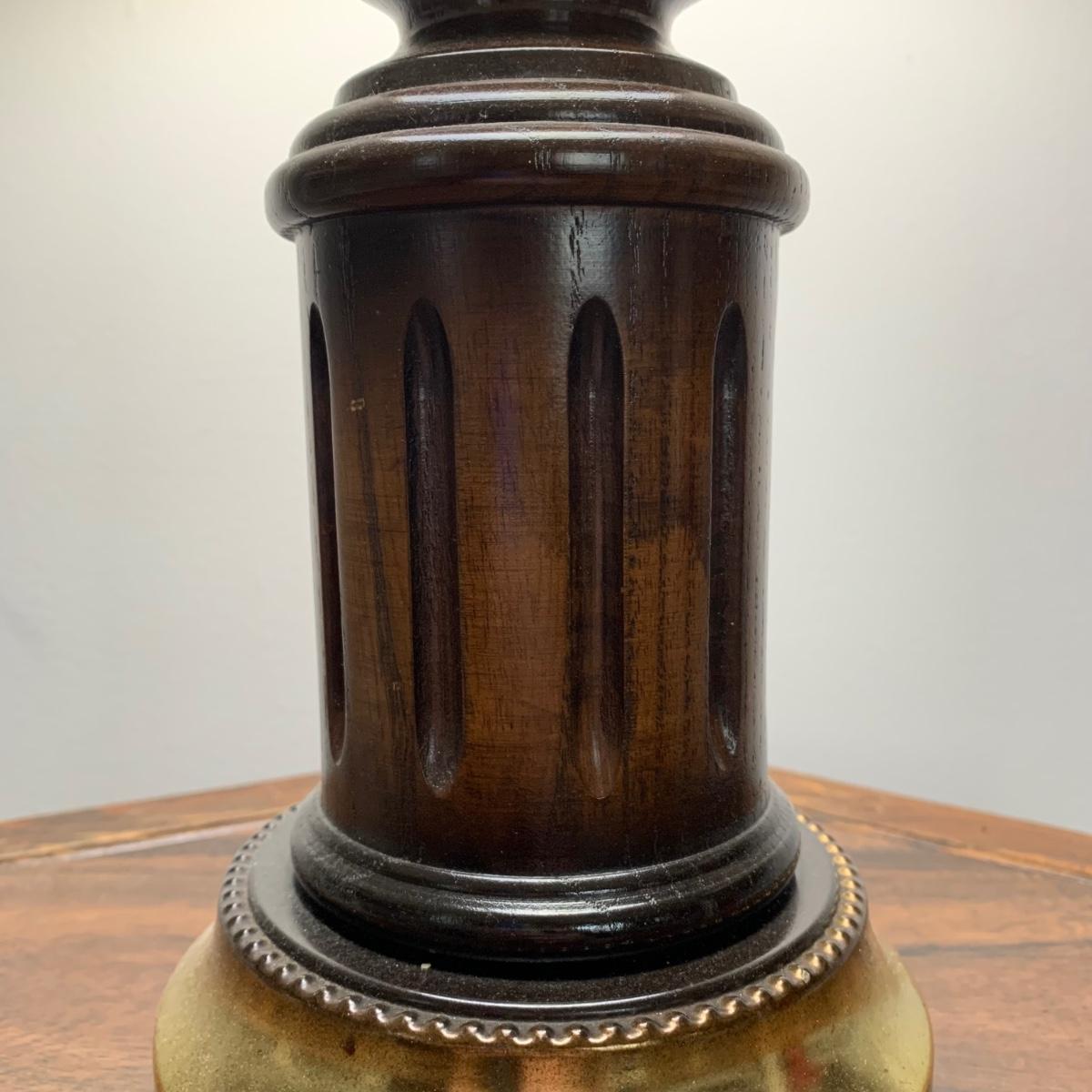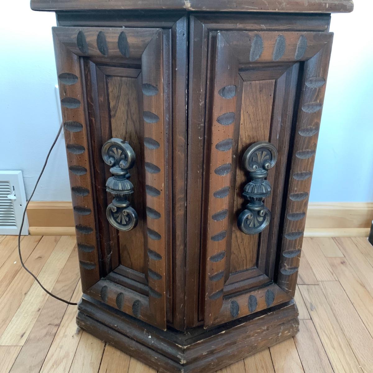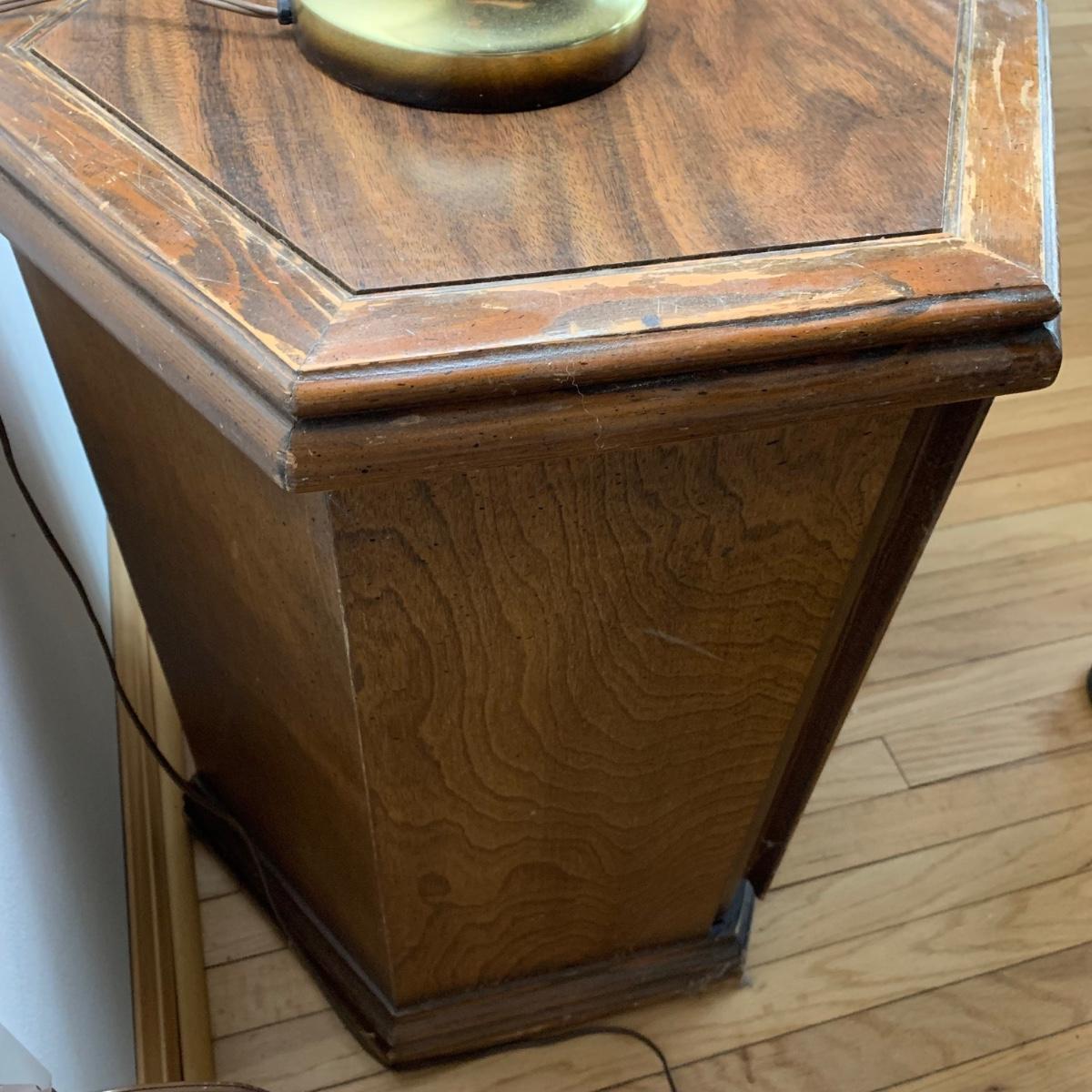 LOT 18 A: Vintage Lamp W/ Milk Glass Swirl Shade, Clear Glass Chimney, Wood, & Brass Base W/ A Hexagon Cupboard End Table